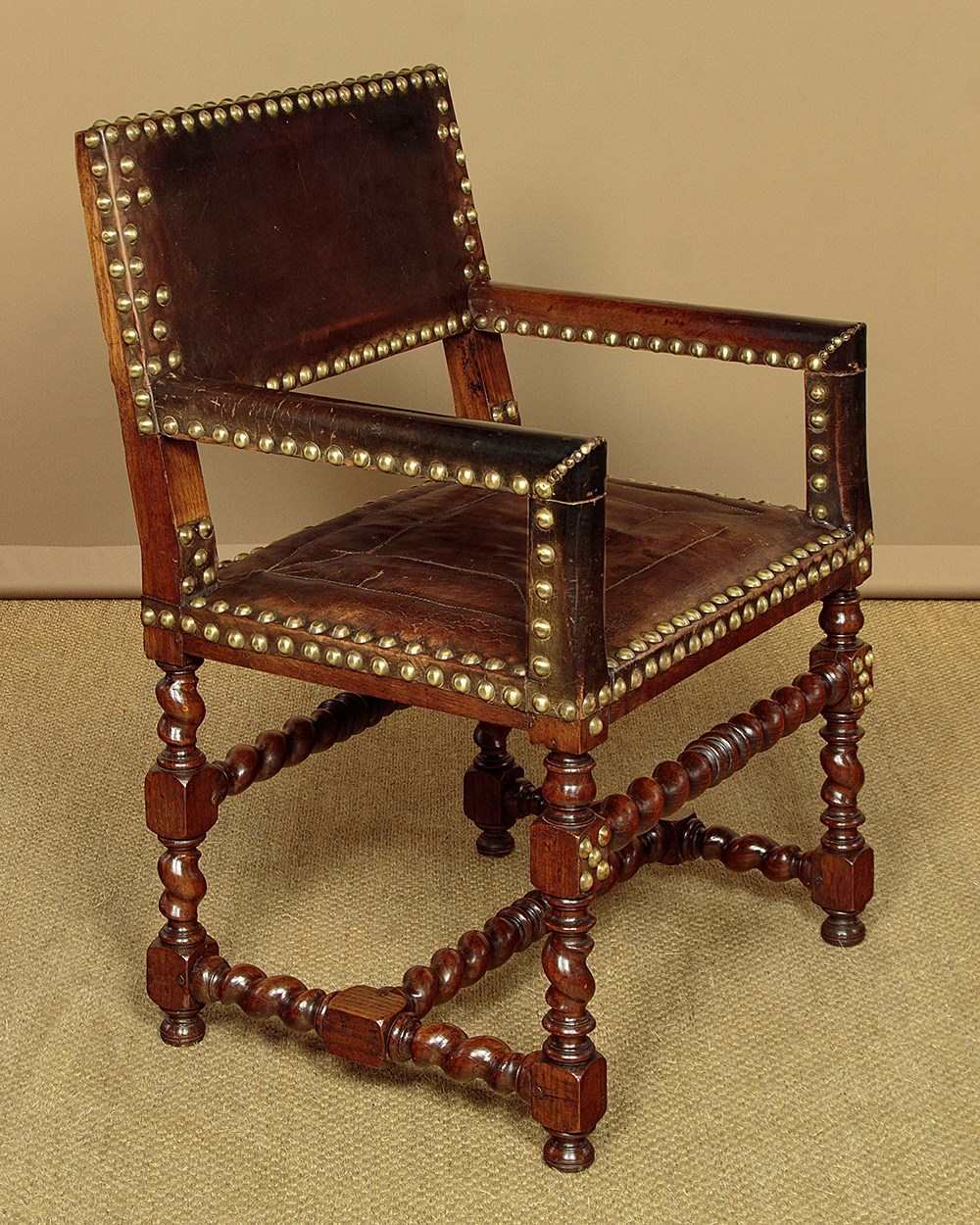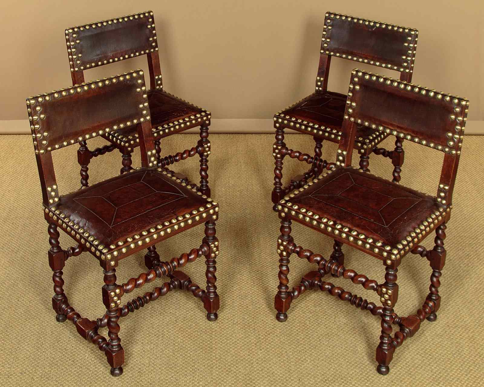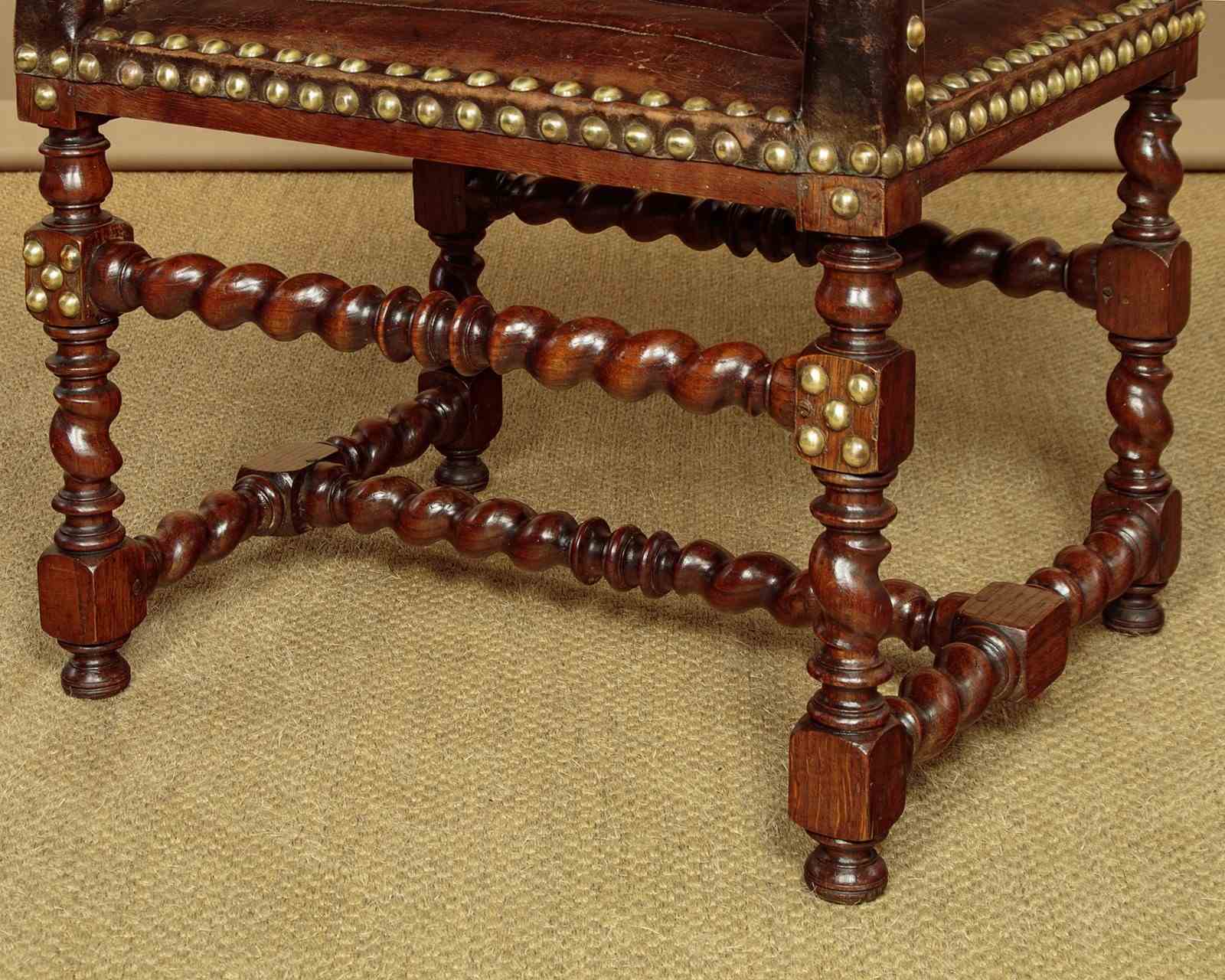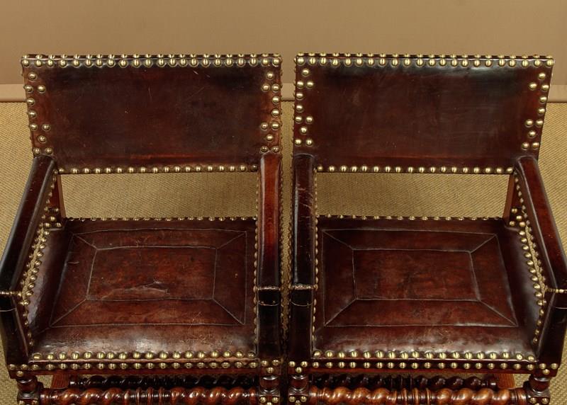 Splendid pair of 17th.c. style oak and leather armchairs c.1920. Backrests, arms and the large padded seats retaining the original brown leather covering with large decorative brass studs to the edges. Solid oak frames with twist carved, turned and block legs and stretchers. Some wear to the seats, generally very good condition with particularly good colour and patina to the leather, especially on the arms where it had been worn to a lovely smooth finish. Cleaned and waxed in our workshops.