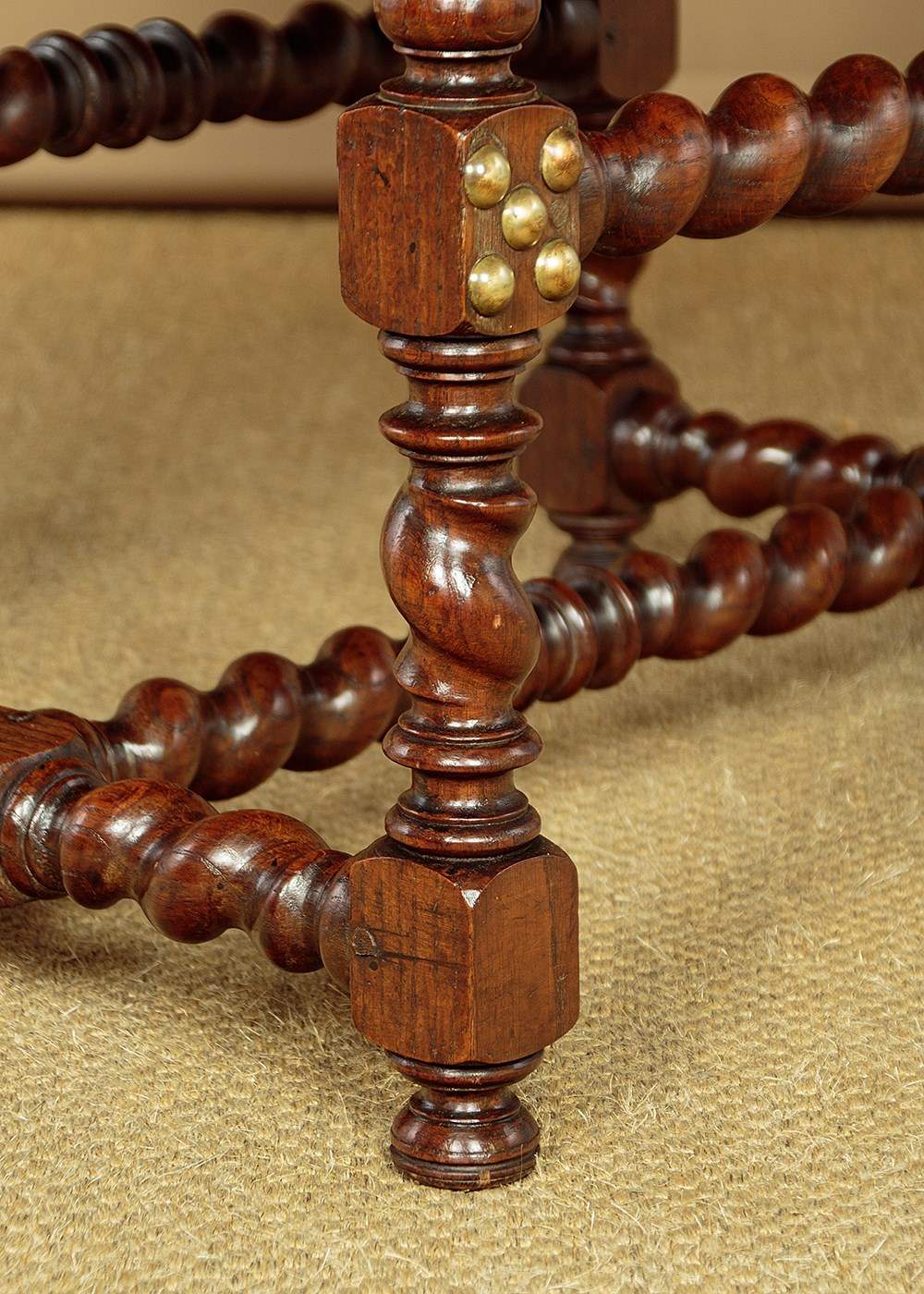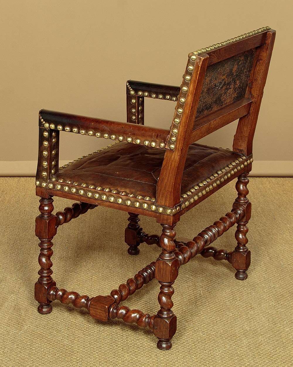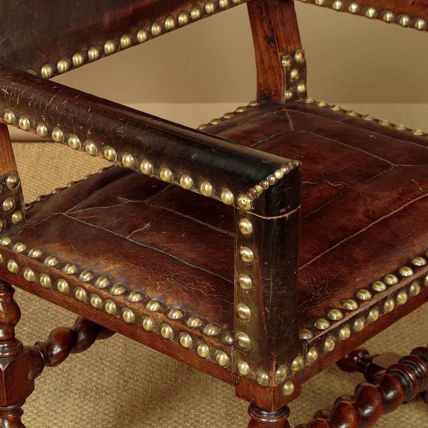 Splendid pair of 17th.c. style oak and leather armchairs c.1920. Backrests, arms and the large padded seats retaining the original brown leather covering with large decorative brass studs to the edges. Solid oak frames with twist carved, turned and block legs and stretchers. Some wear to the seats, generally very good condition with particularly good colour and patina to the leather, especially on the arms where it had been worn to a lovely smooth finish. Cleaned and waxed in our workshops.