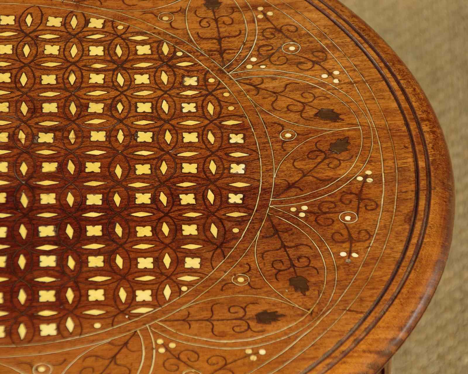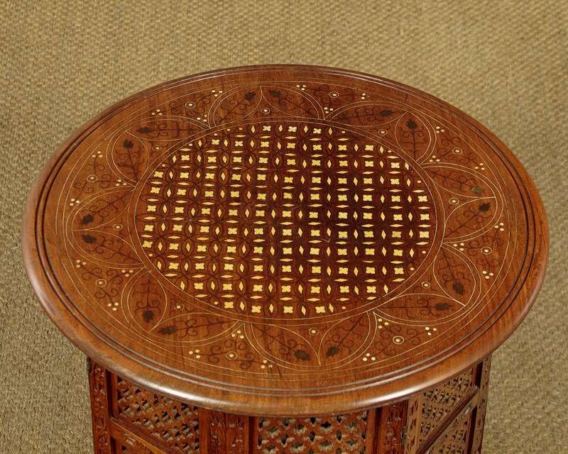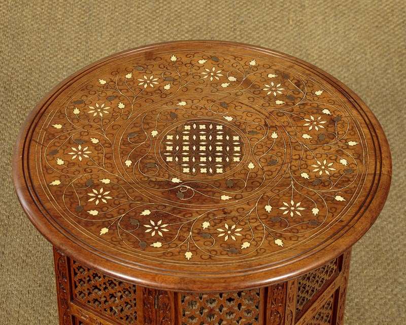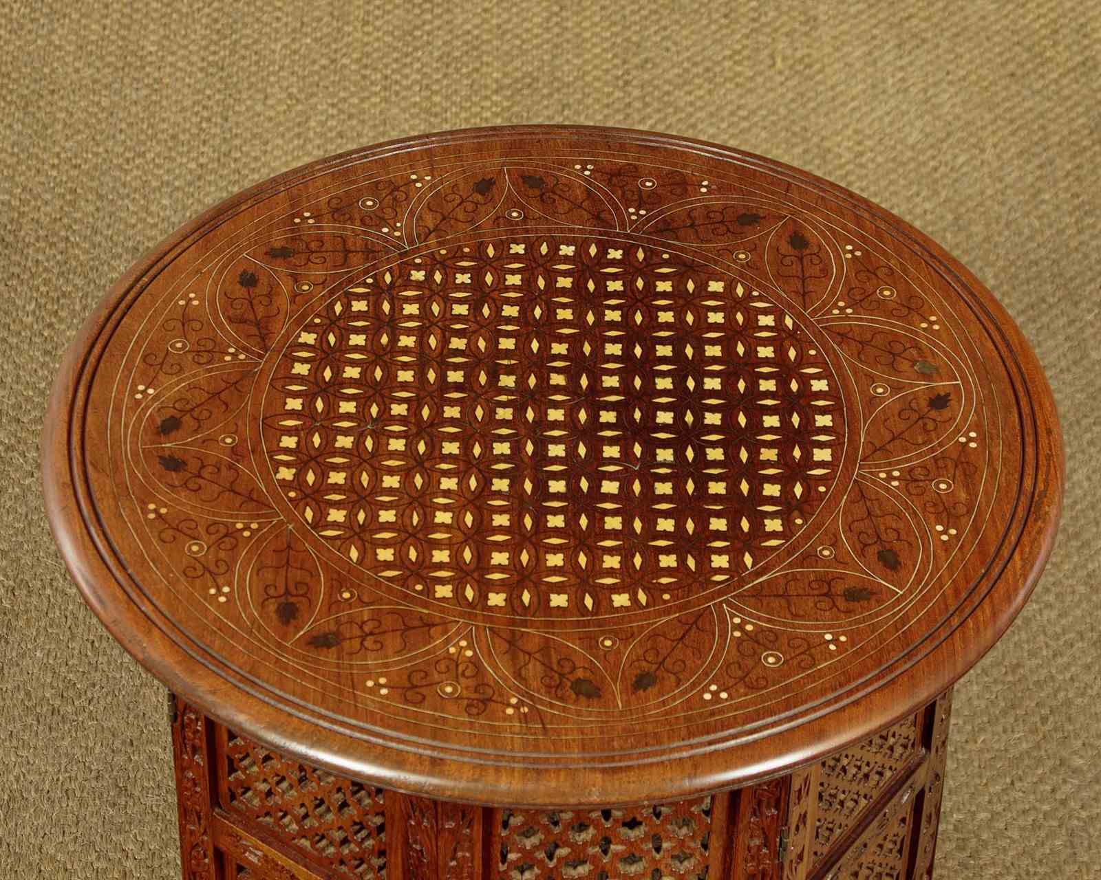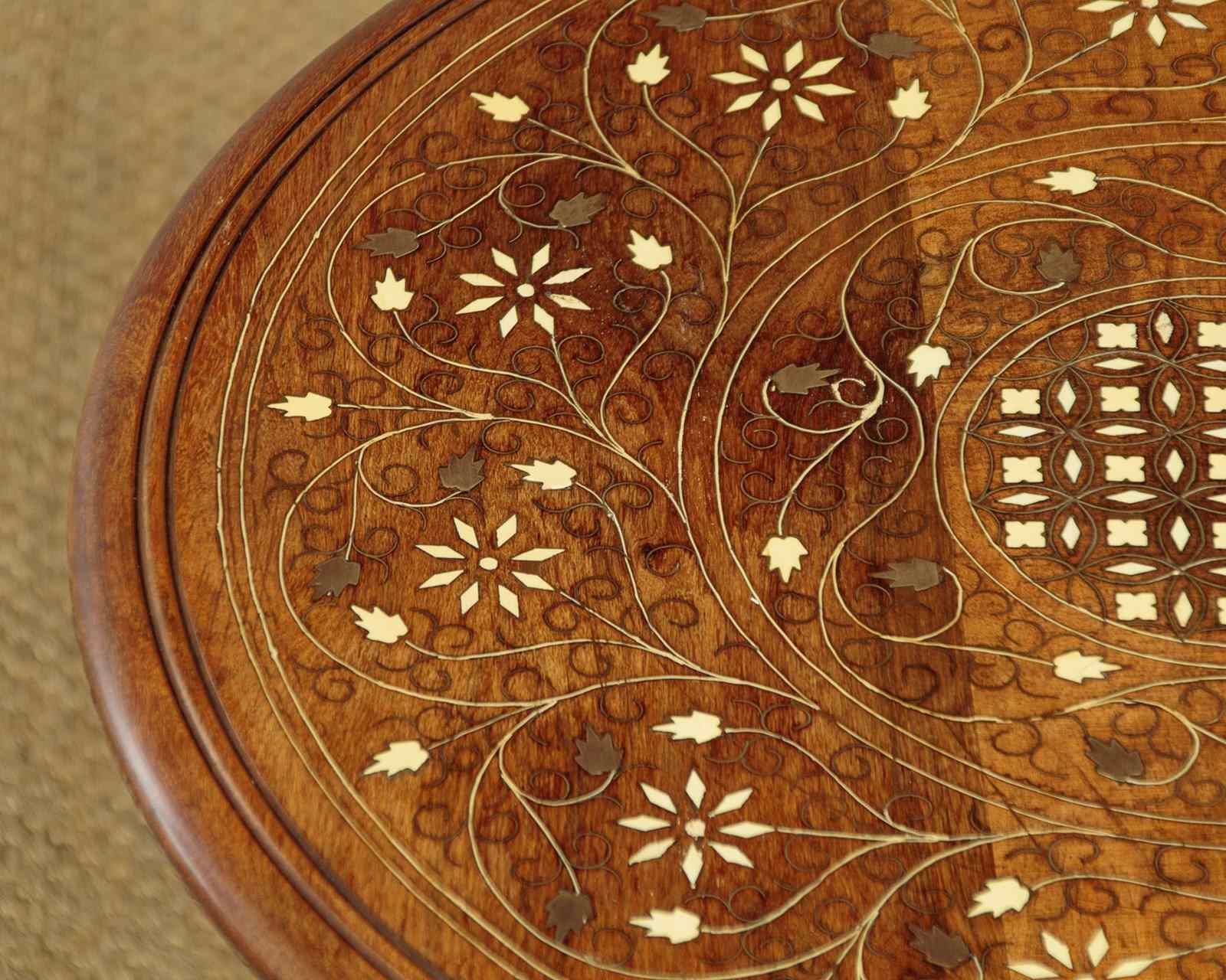 Pair of low Arabic or Moorish style side tables c.1960. 21" diameter tops in walnut or similar with fine inlaid decoration in brass and bone to create elaborate Islamic style patters with complimentary floral and foliate detail (note the brass leaves used on both tables). With a simple moulded and rounded edge to both tops. Raised on octagonal bases with matching pierced decoration to the panels and carved detail to the frames. Small paper labels to the underside of both tables priced in Saudi Riyals. Excellent colour and condition, cleaned and waxed in our workshops.
