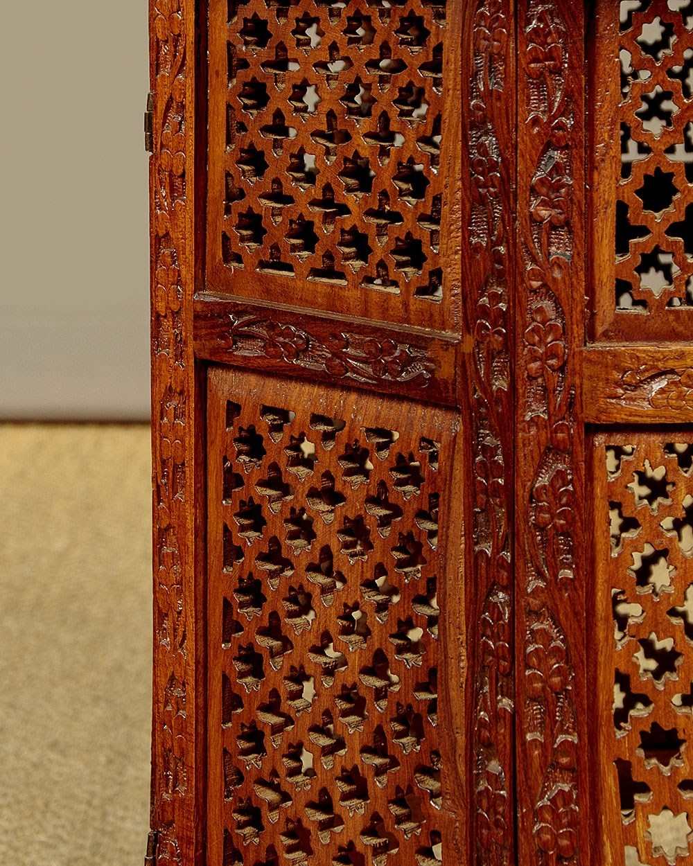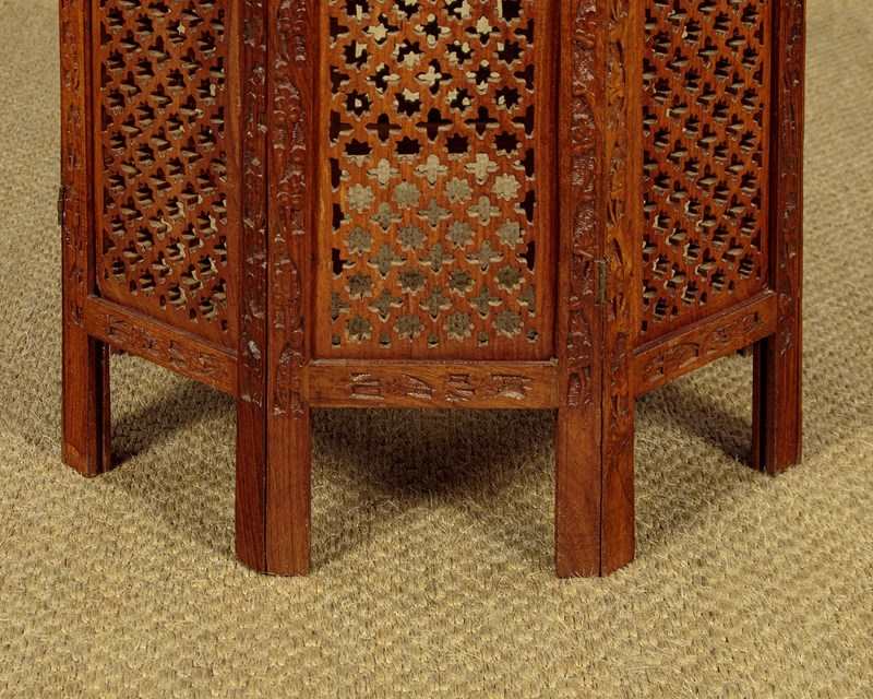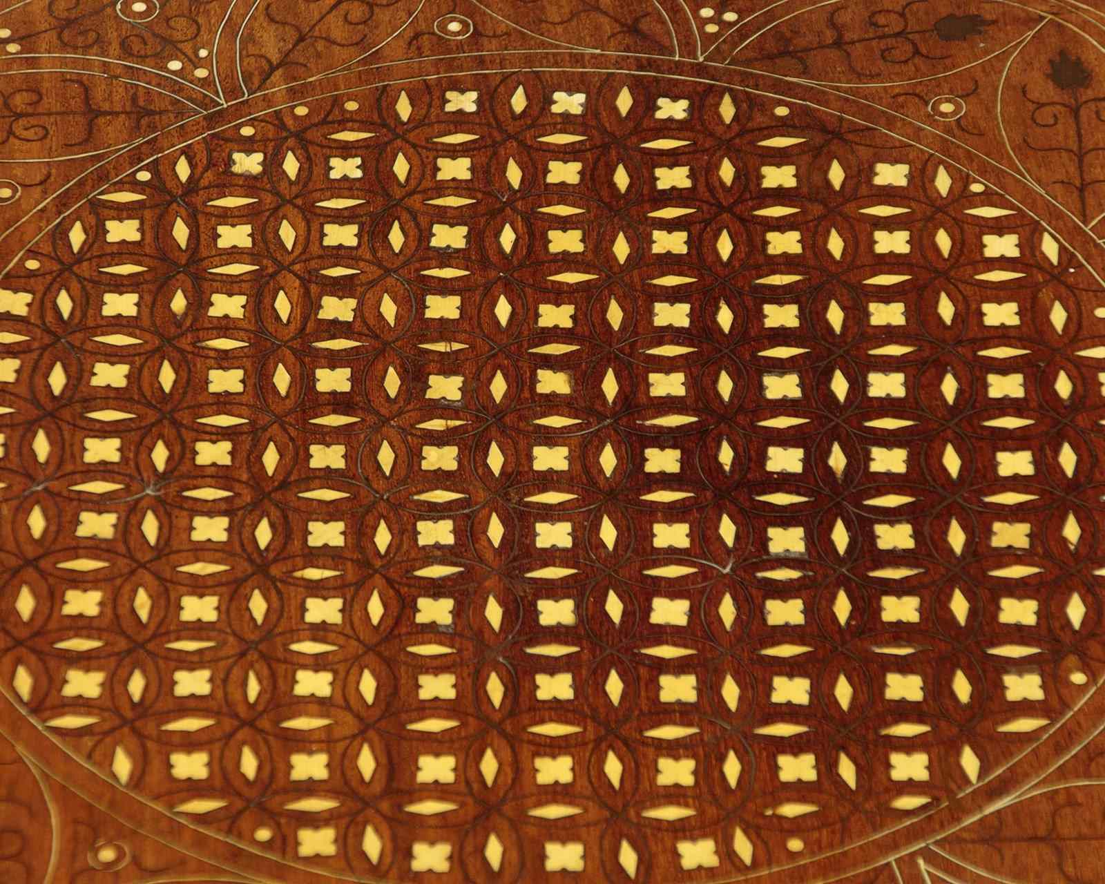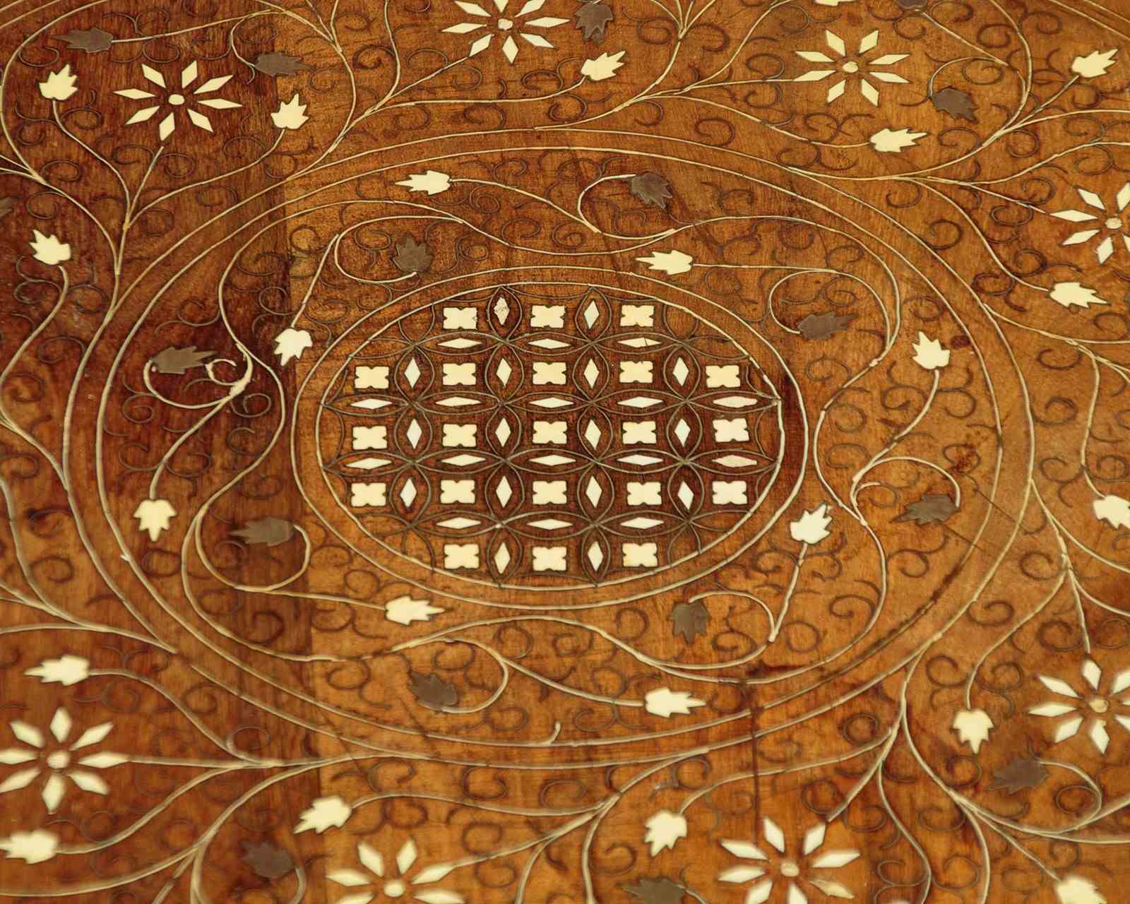 Pair of low Arabic or Moorish style side tables c.1960. 21" diameter tops in walnut or similar with fine inlaid decoration in brass and bone to create elaborate Islamic style patters with complimentary floral and foliate detail (note the brass leaves used on both tables). With a simple moulded and rounded edge to both tops. Raised on octagonal bases with matching pierced decoration to the panels and carved detail to the frames. Small paper labels to the underside of both tables priced in Saudi Riyals. Excellent colour and condition, cleaned and waxed in our workshops.