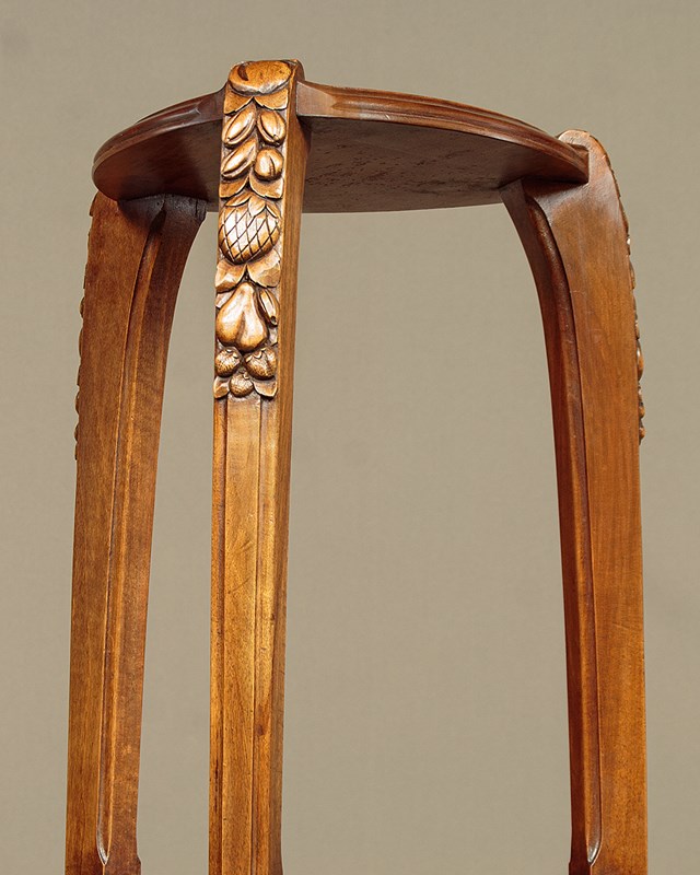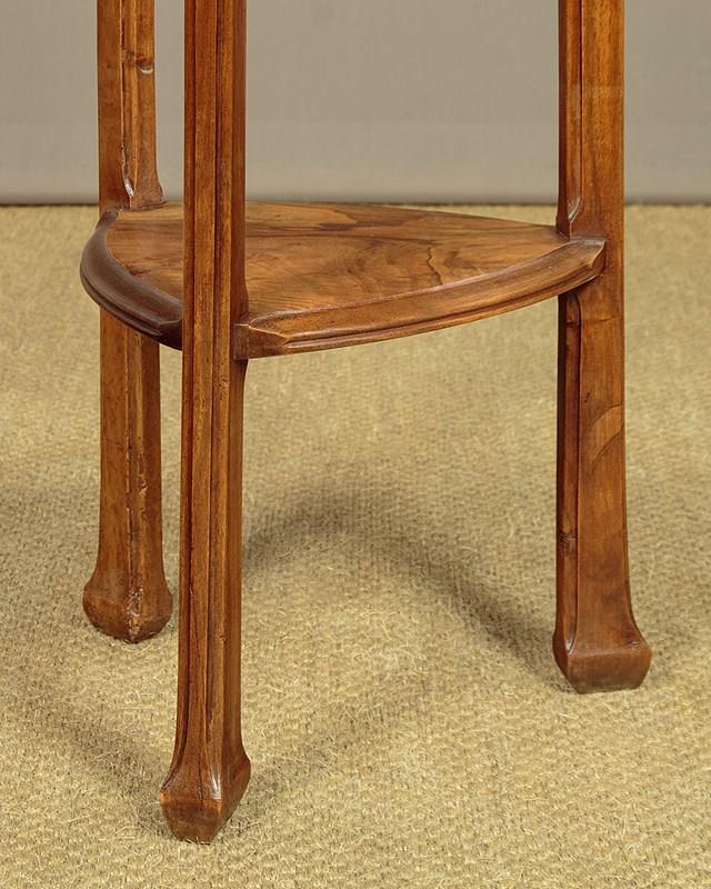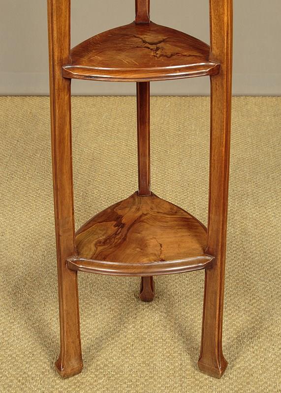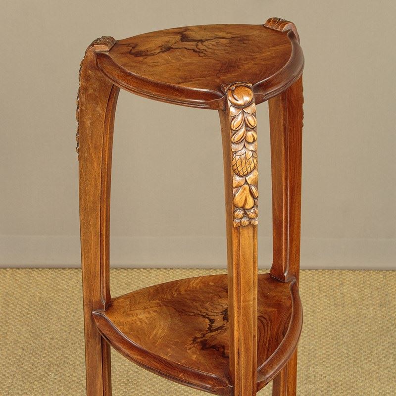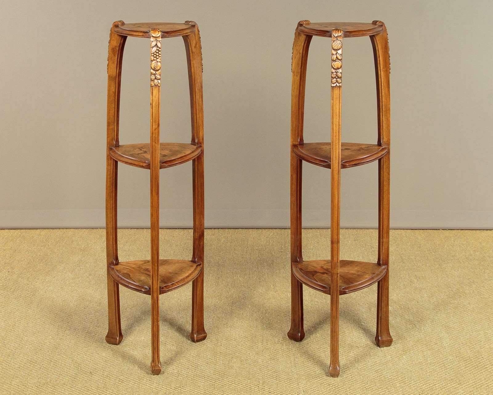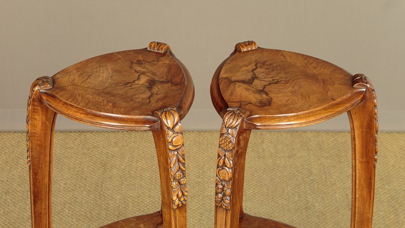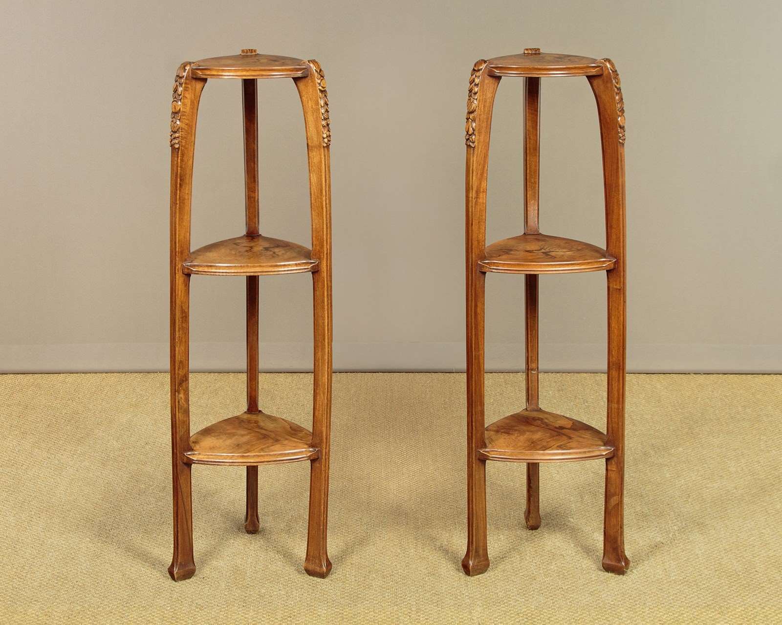 Pair of slim Art Nouveau or Art Deco style walnut three tier stands or what-nots c.1920. Three shelves of rounded triangular form with burr walnut veneers and moulded edges. On organic shaped stiles with carved flowers and fruit at the shoulders, moulded edges and bulbous feet. A little bit of bubbling to the veneers on the shelves, otherwise very good colour and condition, cleaned and waxed in our workshops.