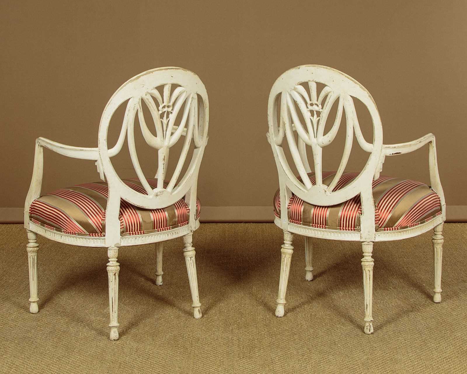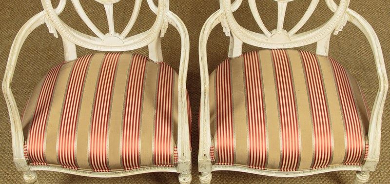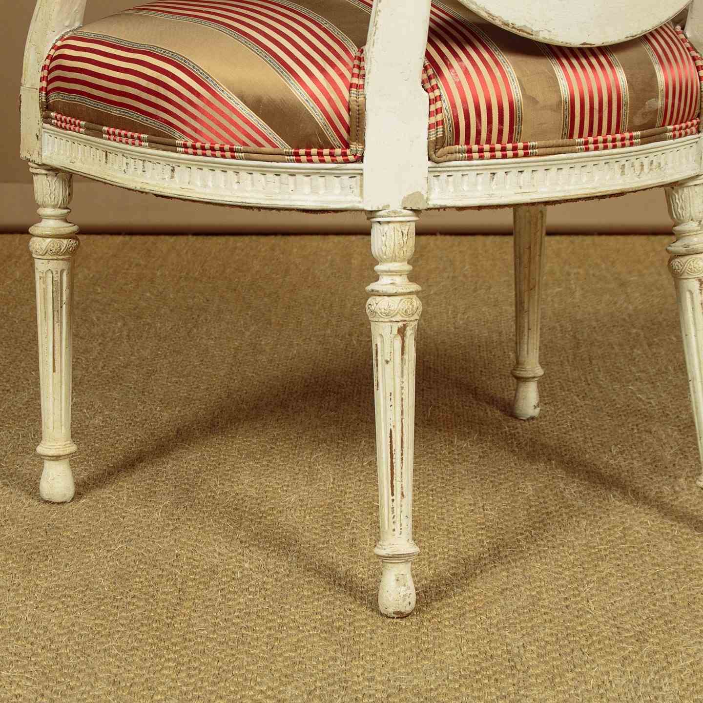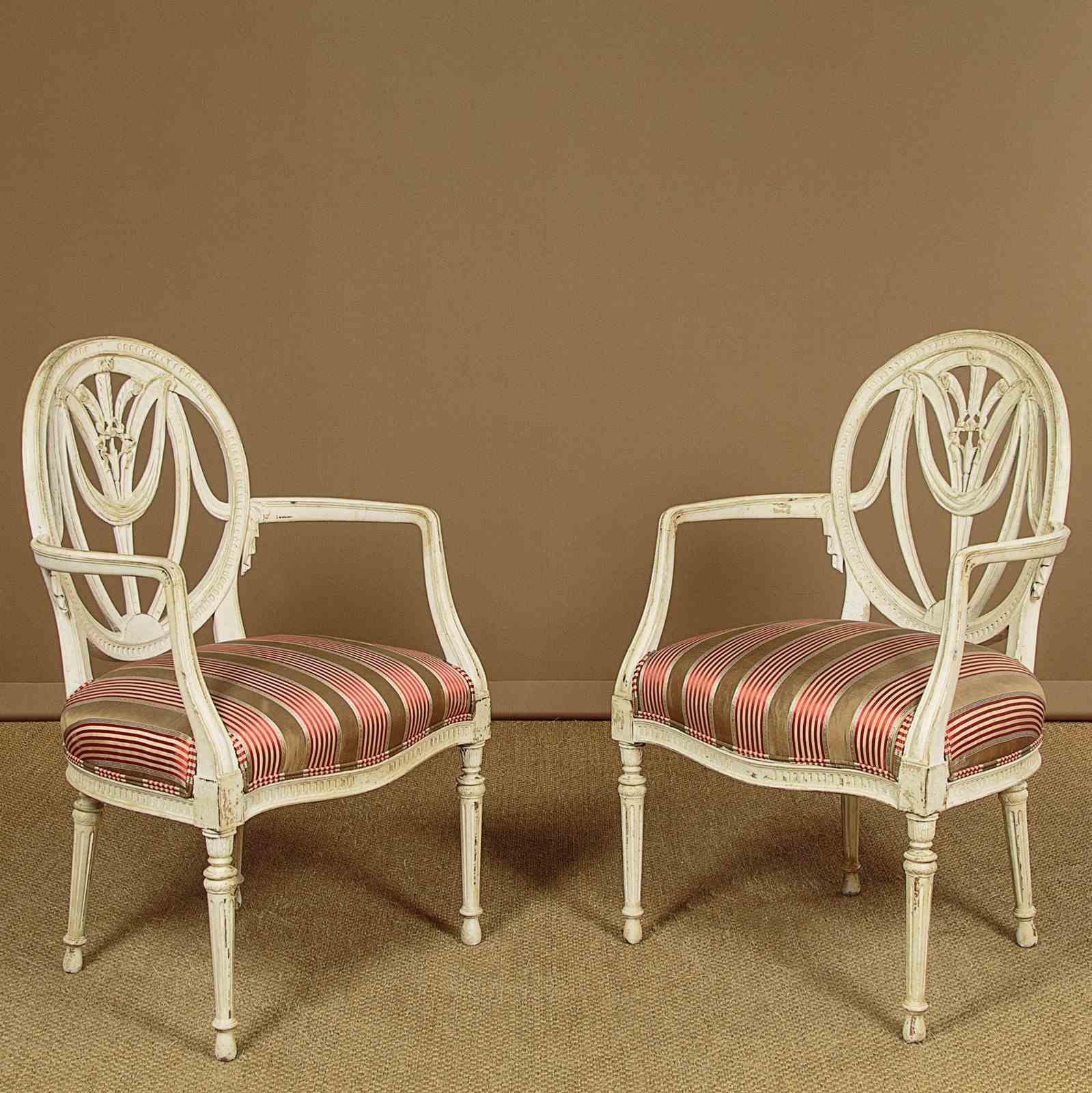 A pair of elegant French carved and painted open armchairs c.1900. Oval back rests carved with a three feathers motif and cloth swags. Slim curving arms on swept supports. Sprung seats upholstered in a Regency stripe silk fabric. Shaped and fluted rails below the seat and raised on turned and fluted legs with carved detail the tops front and rear. Some obvious wear to the paintwork which is rubbed through in places to reveal grey underpainting and the hardwood frame below. Serviceable covers with some small watermarks and minor wear. Solid and sturdy with good firm springs in the seats.