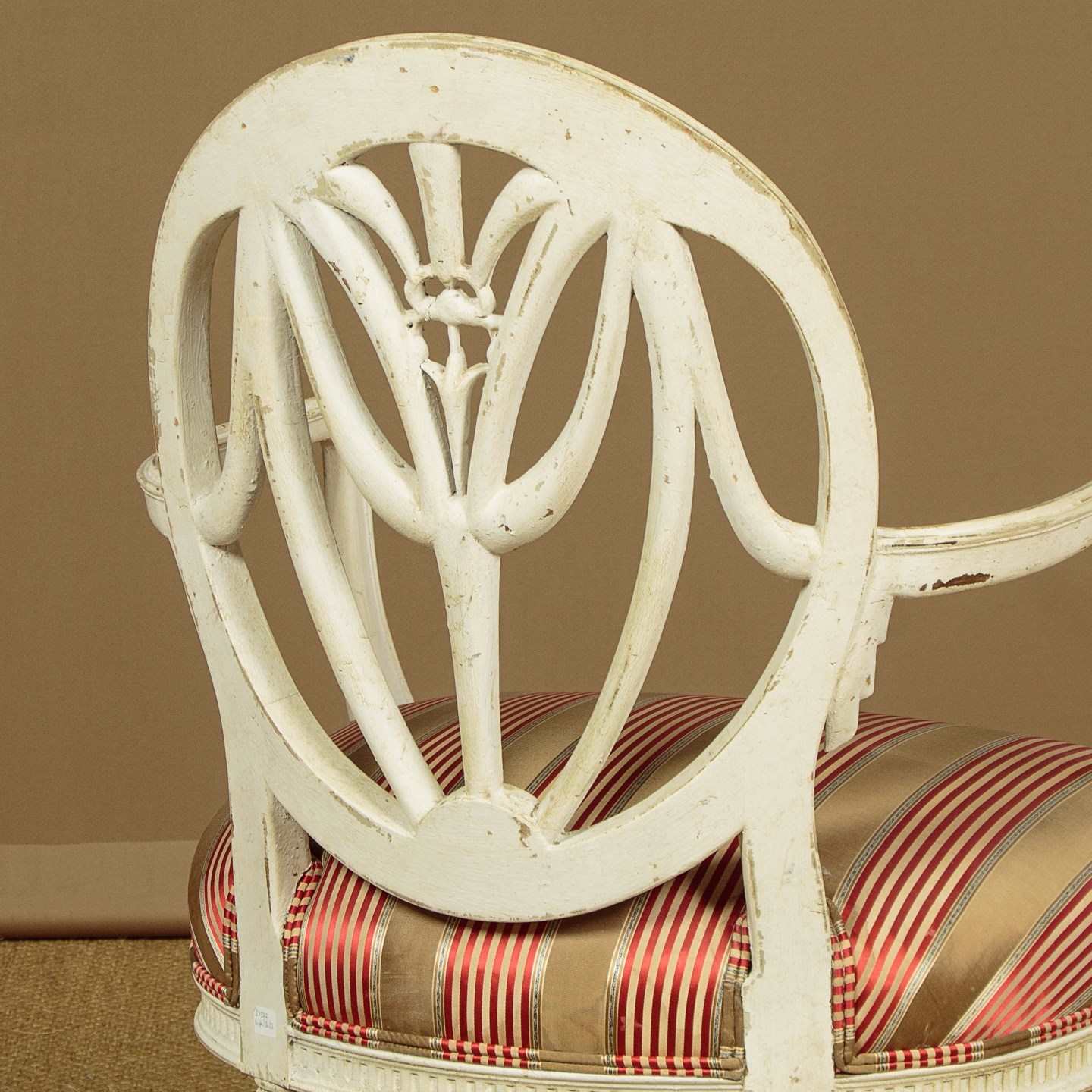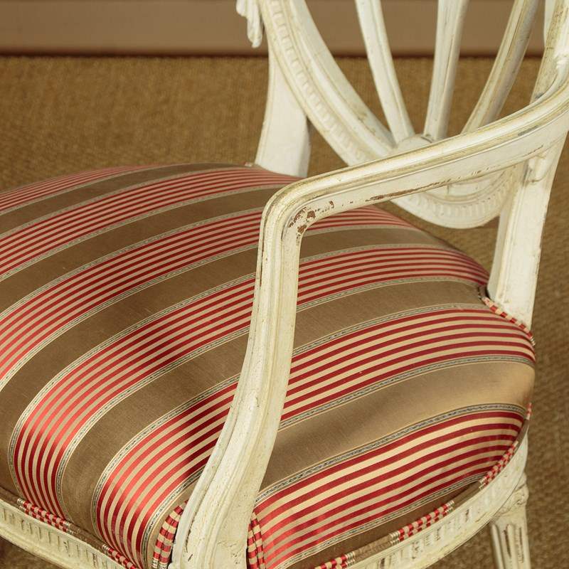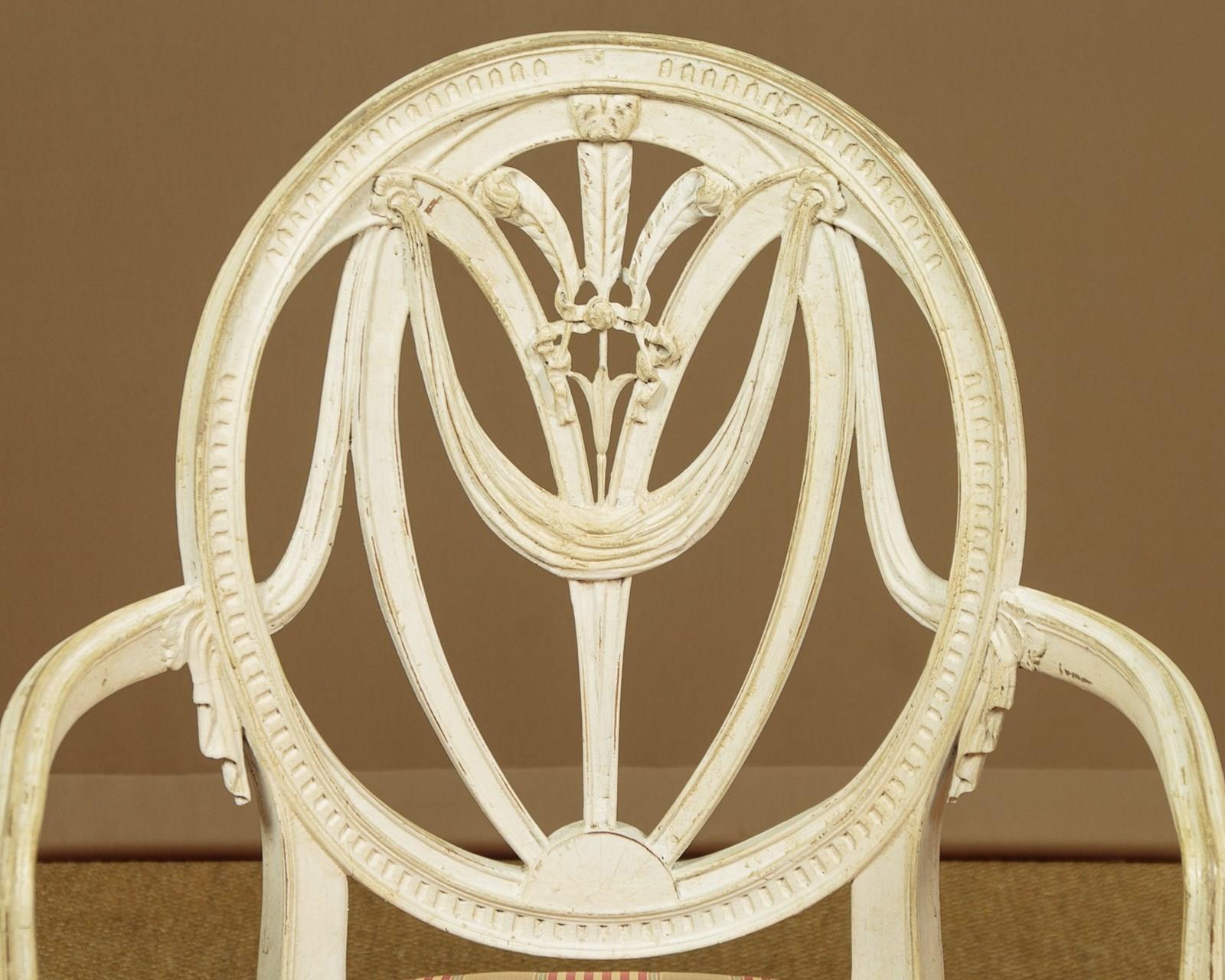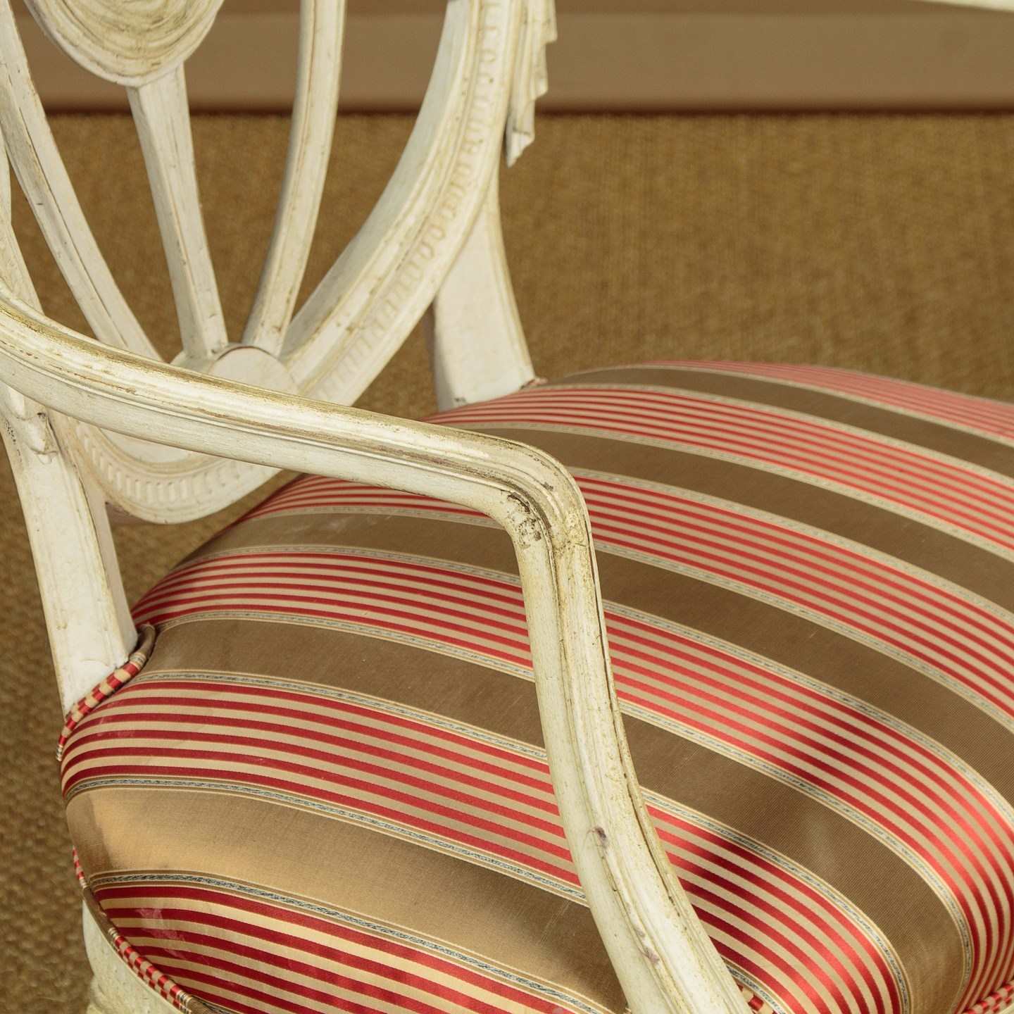 A pair of elegant French carved and painted open armchairs c.1900. Oval back rests carved with a three feathers motif and cloth swags. Slim curving arms on swept supports. Sprung seats upholstered in a Regency stripe silk fabric. Shaped and fluted rails below the seat and raised on turned and fluted legs with carved detail the tops front and rear. Some obvious wear to the paintwork which is rubbed through in places to reveal grey underpainting and the hardwood frame below. Serviceable covers with some small watermarks and minor wear. Solid and sturdy with good firm springs in the seats.