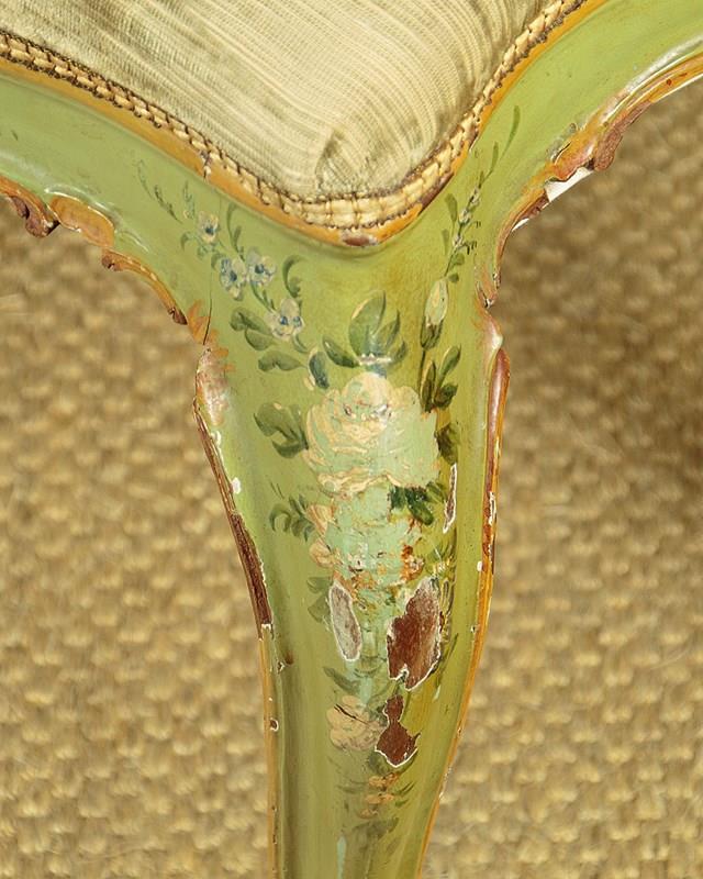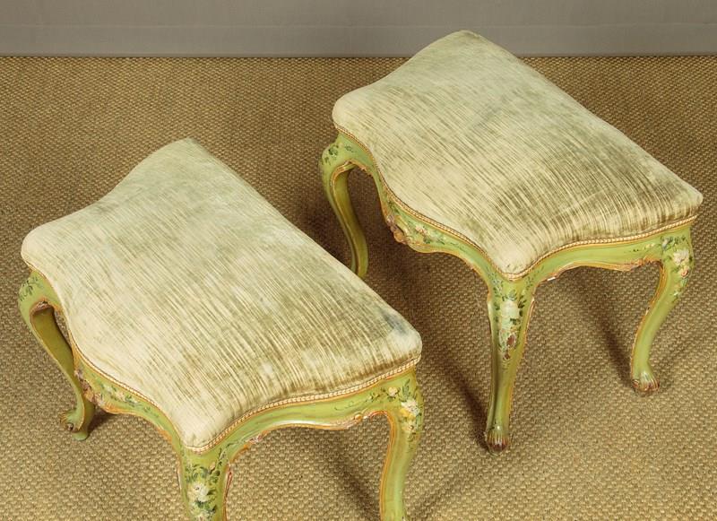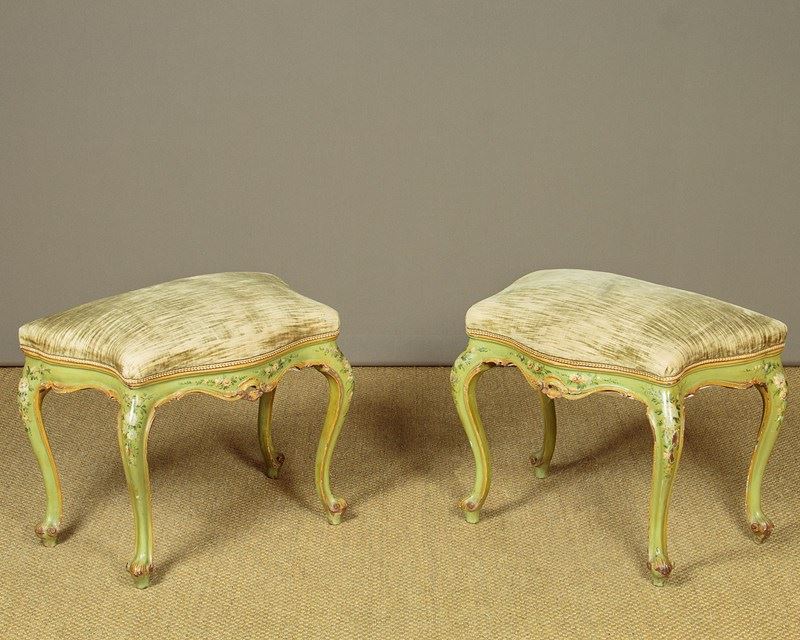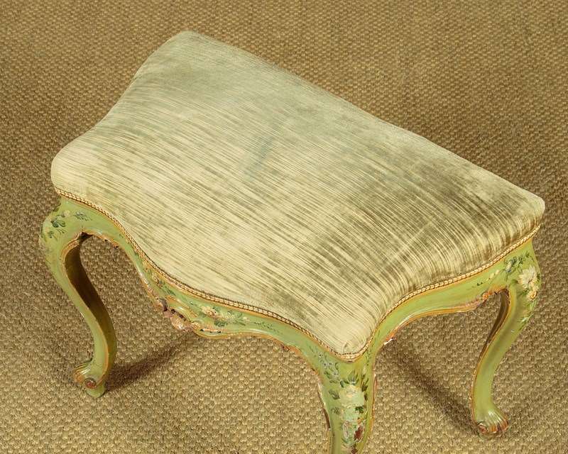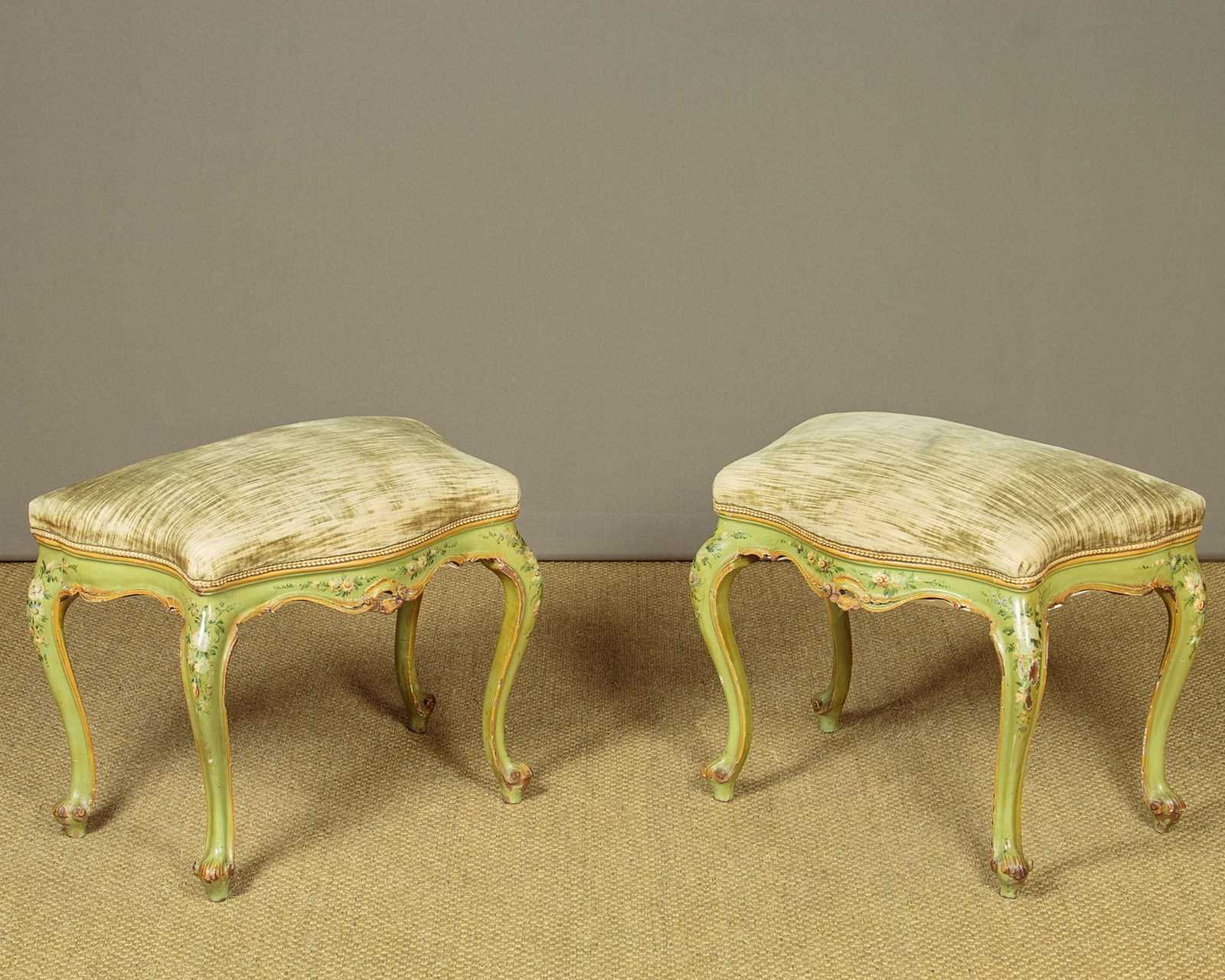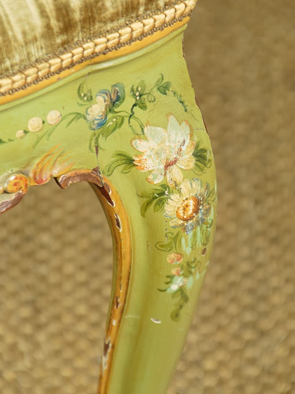 Unusual pair of French bedroom or dressing stools with their original decorative paintwork c.1930. Sprung seats with serpentine front edge and sides and straight rear edge to stand flat against a wall. On shapely hardwood frames with original paintwork featuring flowers against a green ground. Moulded edges highlighted in gold paint with a pierced detail at the front. Carved detail to the feet front and rear. Presented as found with some obvious wear to the upholstery and paintwork. Generally good original condition.