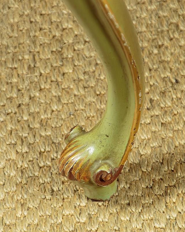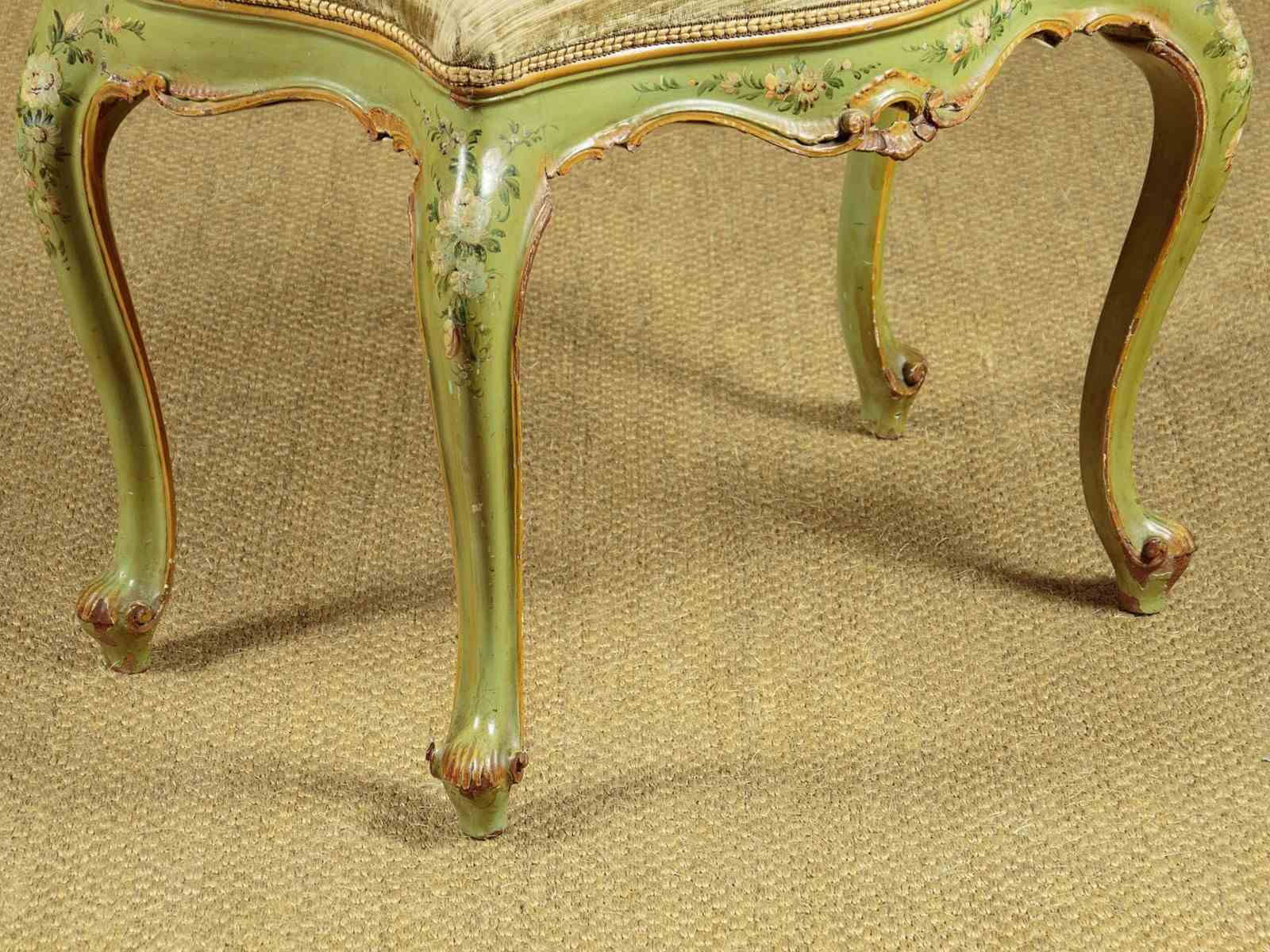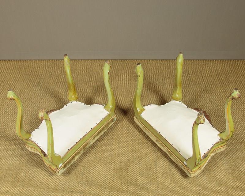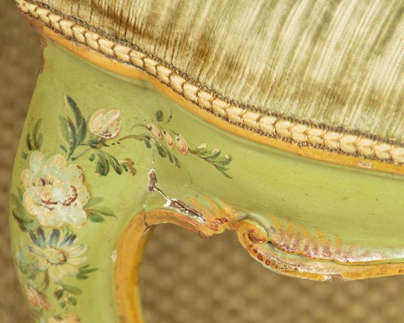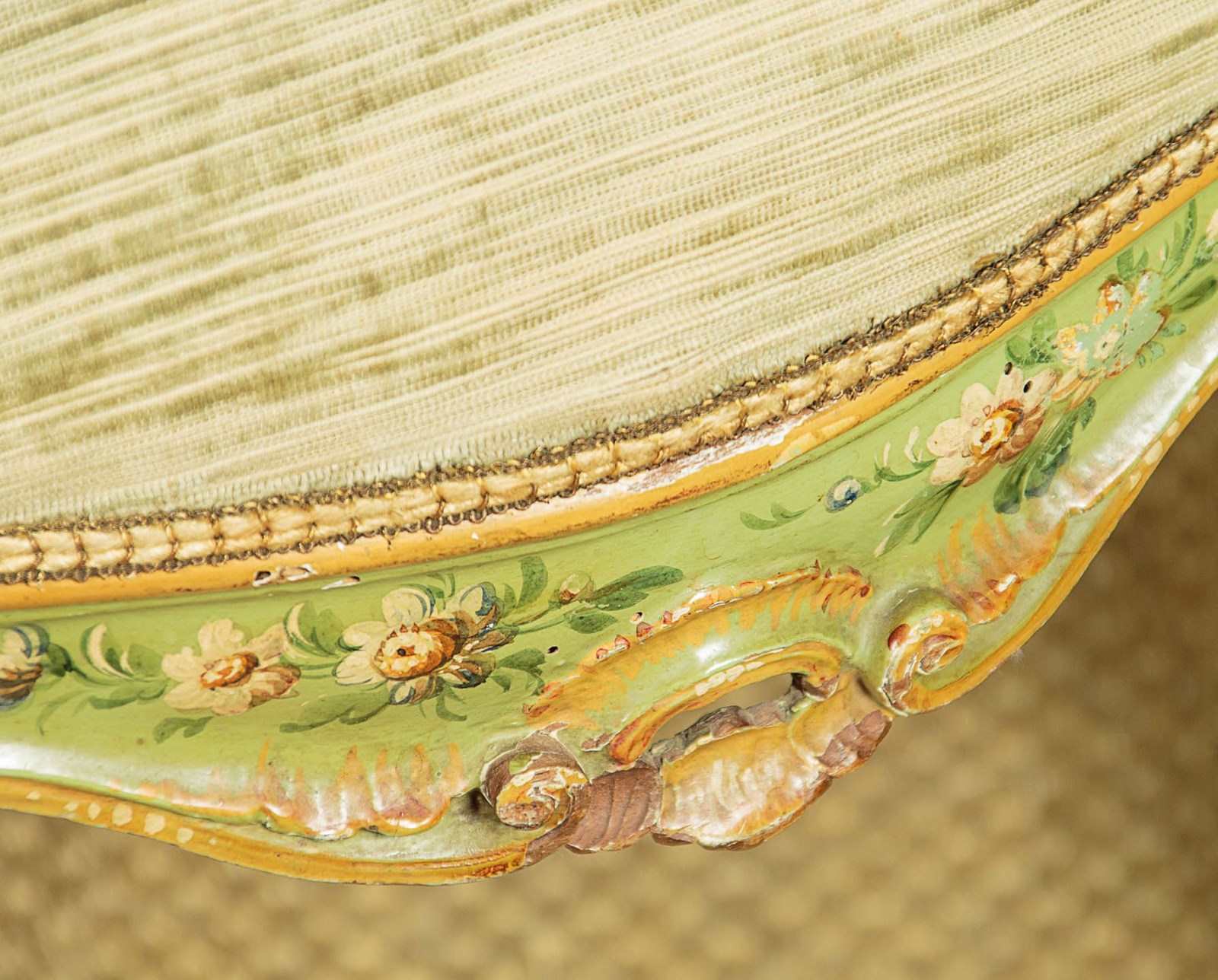 Unusual pair of French bedroom or dressing stools with their original decorative paintwork c.1930. Sprung seats with serpentine front edge and sides and straight rear edge to stand flat against a wall. On shapely hardwood frames with original paintwork featuring flowers against a green ground. Moulded edges highlighted in gold paint with a pierced detail at the front. Carved detail to the feet front and rear. Presented as found with some obvious wear to the upholstery and paintwork. Generally good original condition.