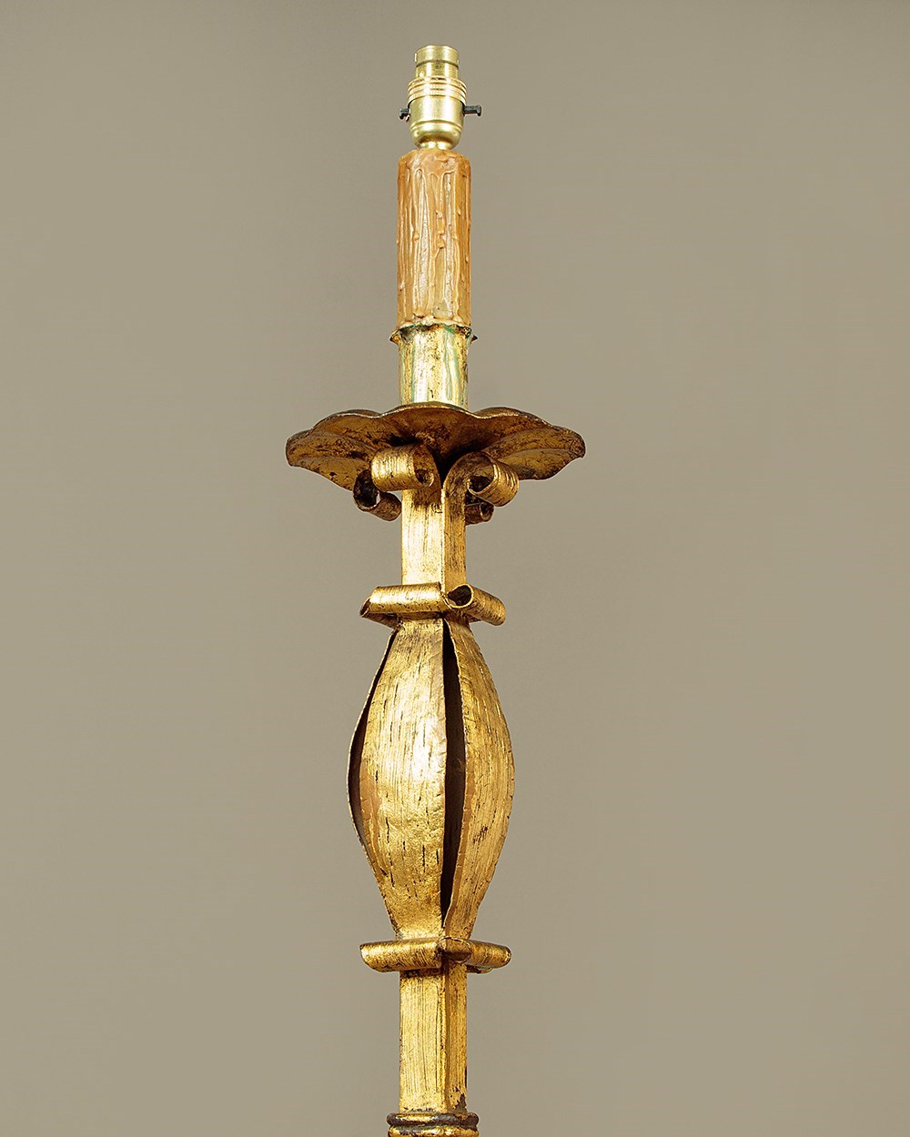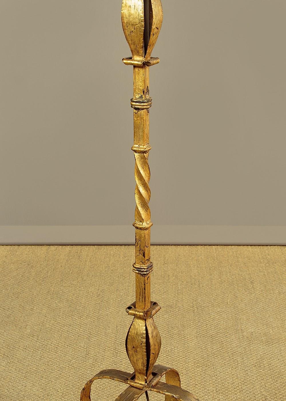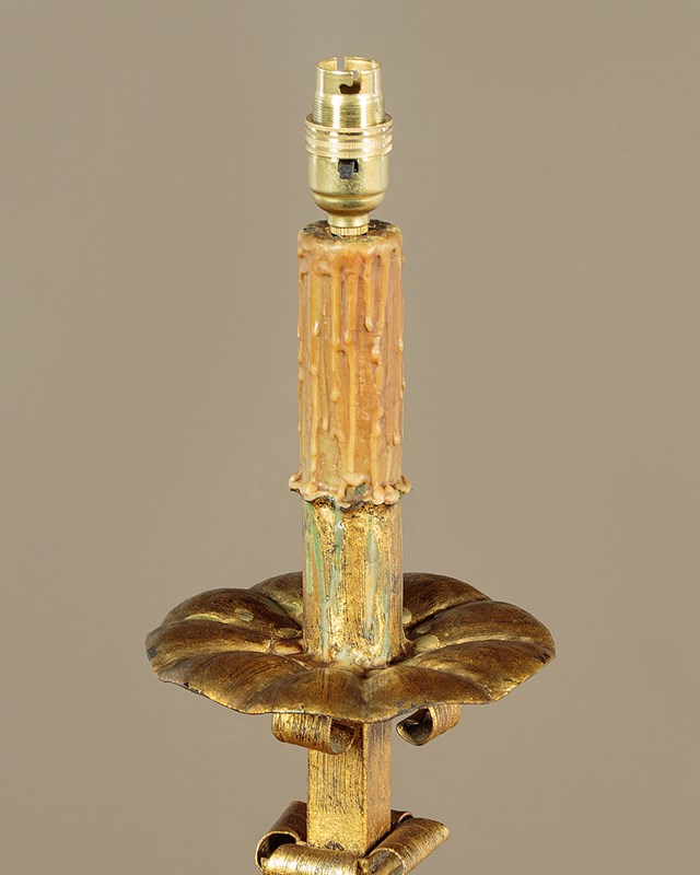 Unusual pair of Gothic gilded wrought iron standard lamps c.1920. Bulbs on wax covered faux candle stems above Gothic style wrought iron columns with a distressed gilt finish. Raised on shaped legs with scrolling detail to the feet. Very good condition, cleaned rewired and PAT tested.