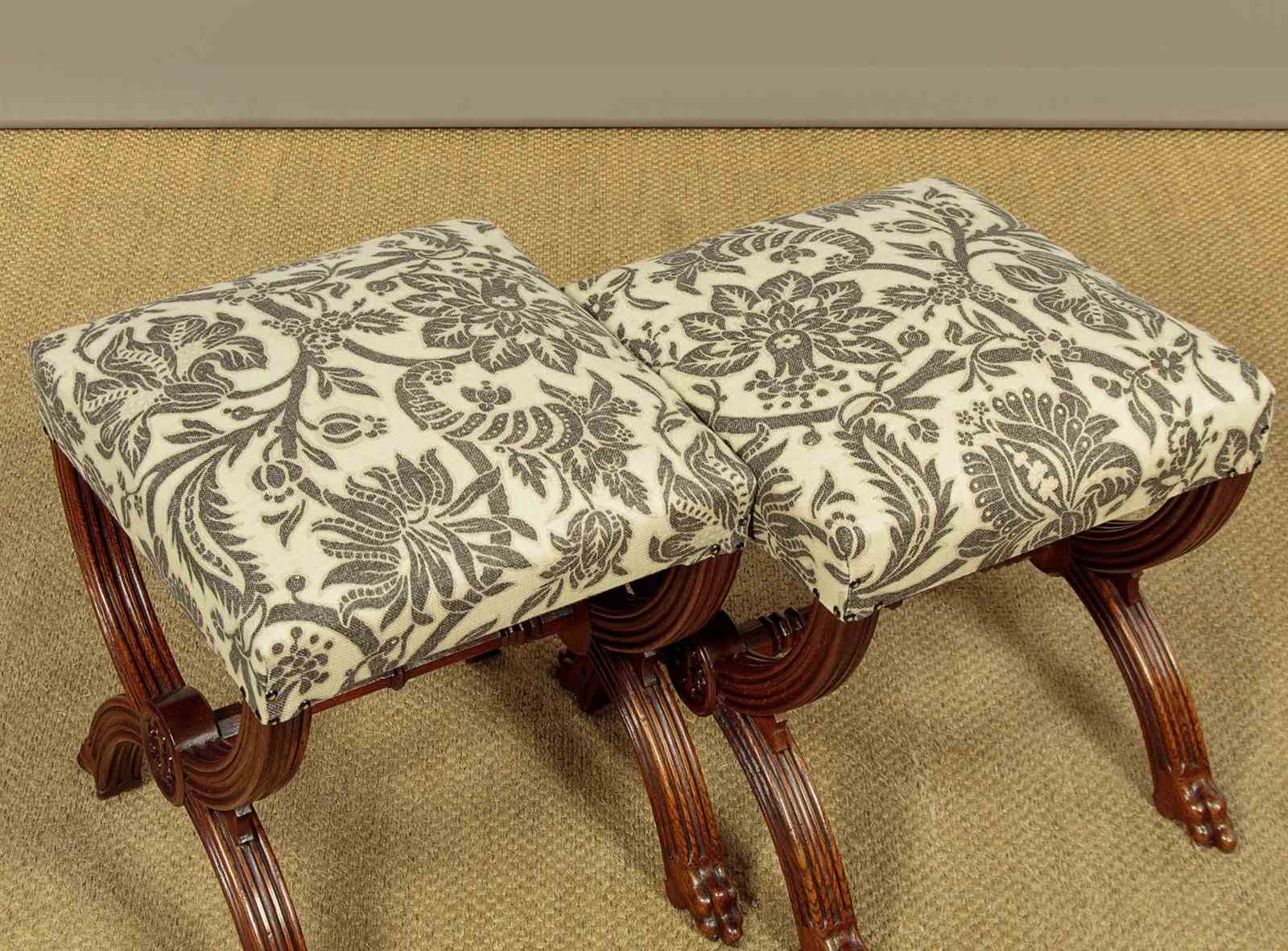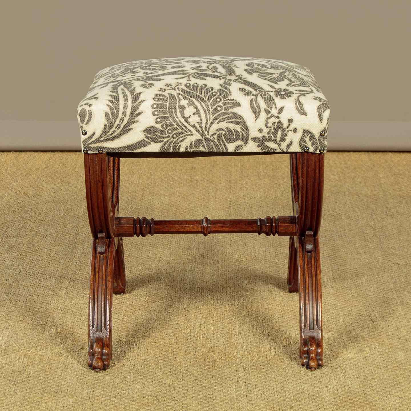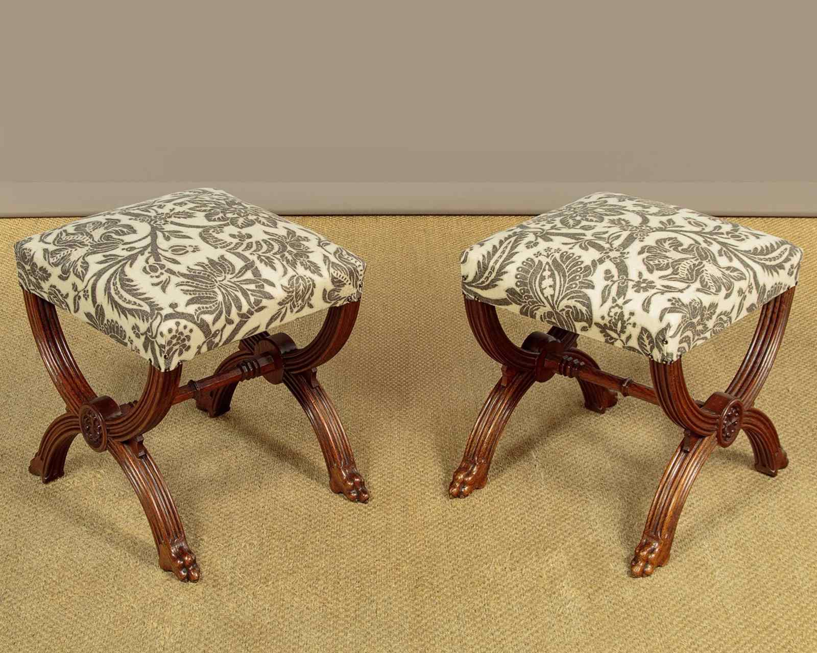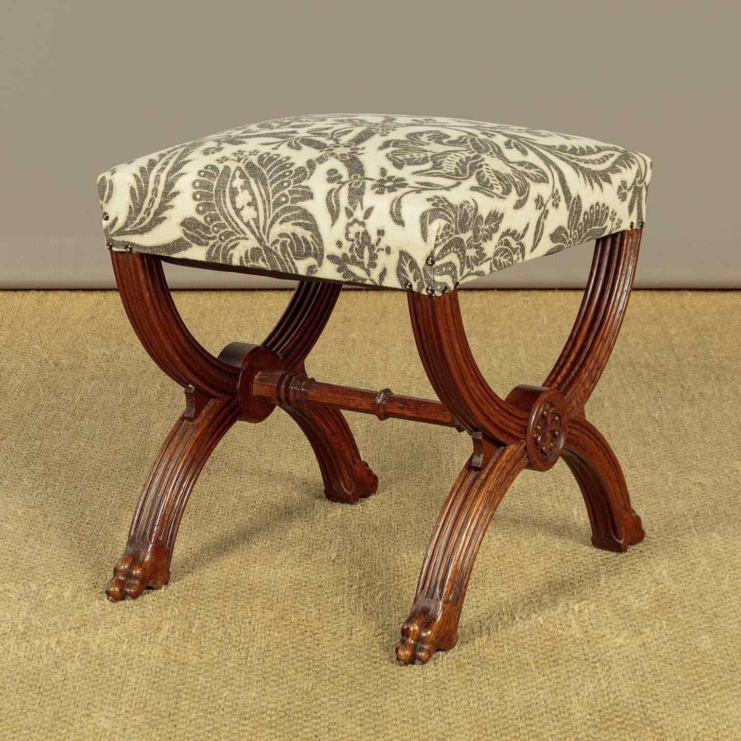 Splendid pair of Gothic revival oak stools c.1880. Sprung seats freshly upholstered in a damask prink linen. Superb X shaped frames in solid oak. Moulded legs with claw feet, joined with octagonal carved stretchers. Note the Gothic patonce crosses carved on the ends of the stools. Excellent condition, cleaned and waxed in our workshops.