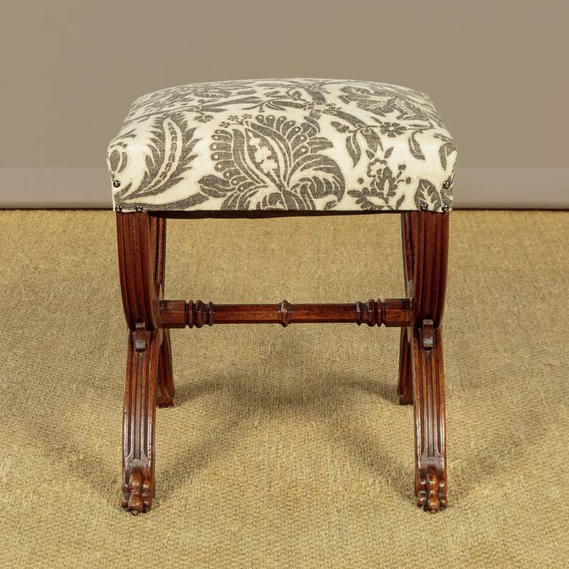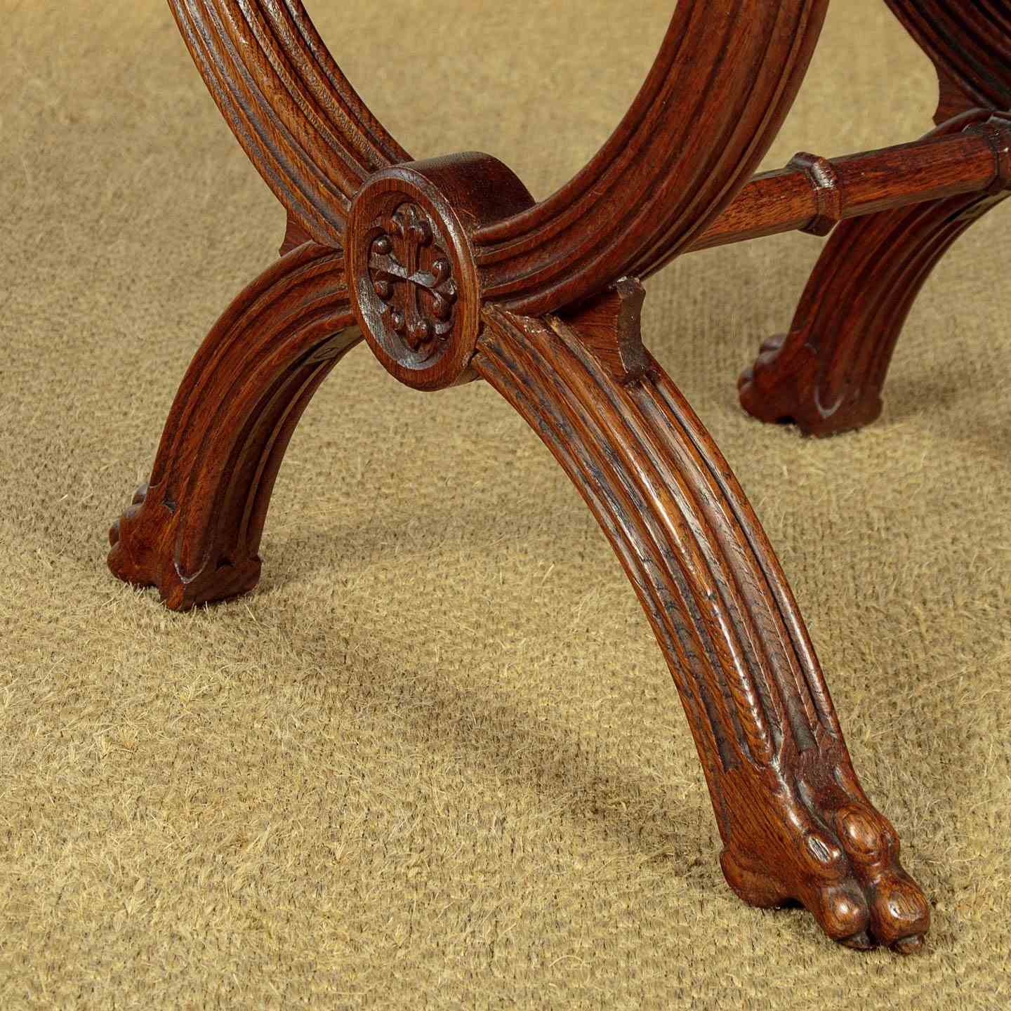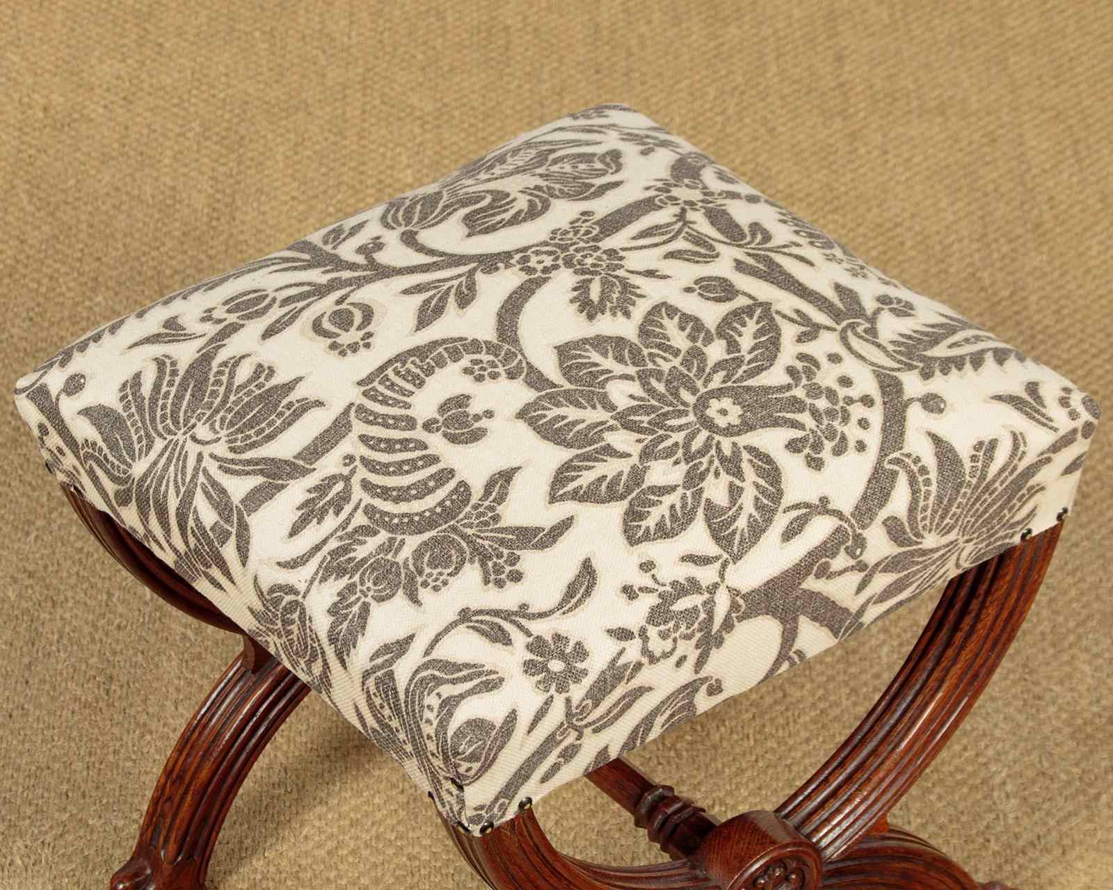 Splendid pair of Gothic revival oak stools c.1880. Sprung seats freshly upholstered in a damask prink linen. Superb X shaped frames in solid oak. Moulded legs with claw feet, joined with octagonal carved stretchers. Note the Gothic patonce crosses carved on the ends of the stools. Excellent condition, cleaned and waxed in our workshops.