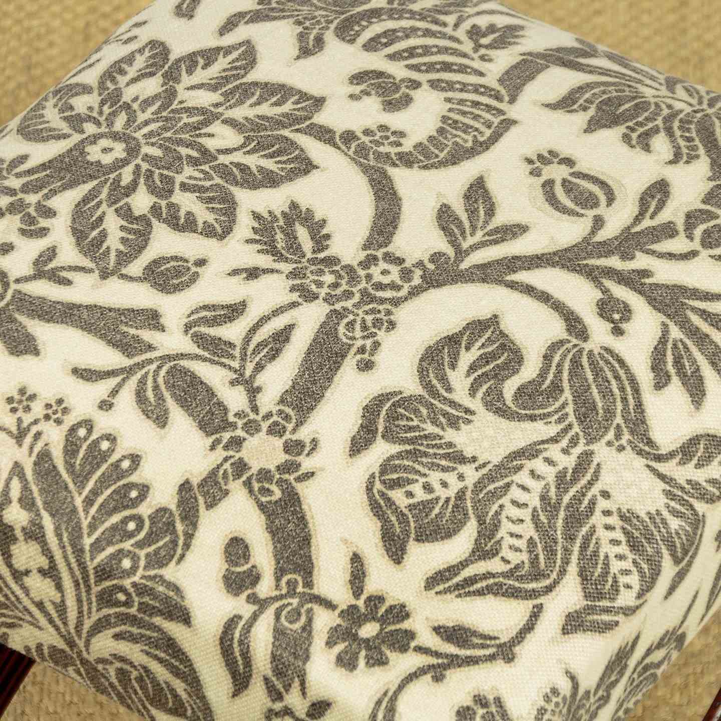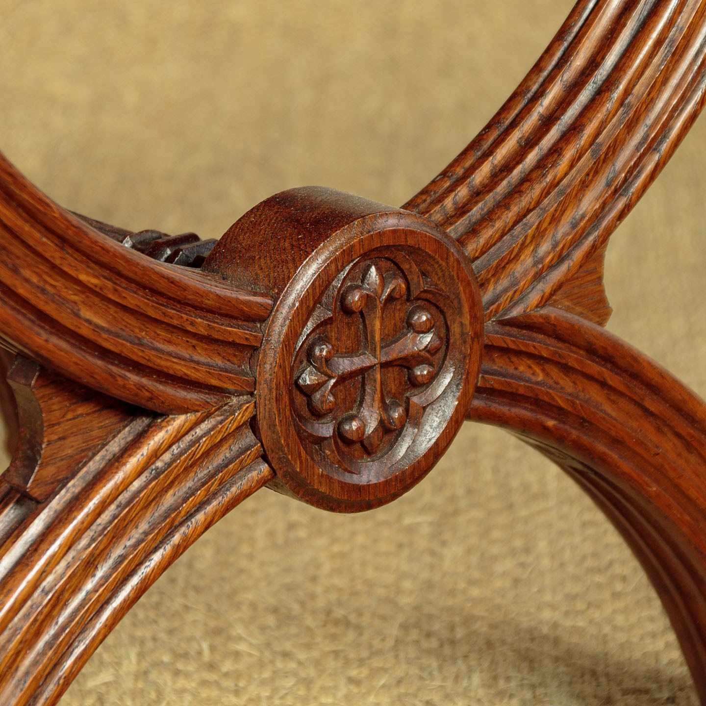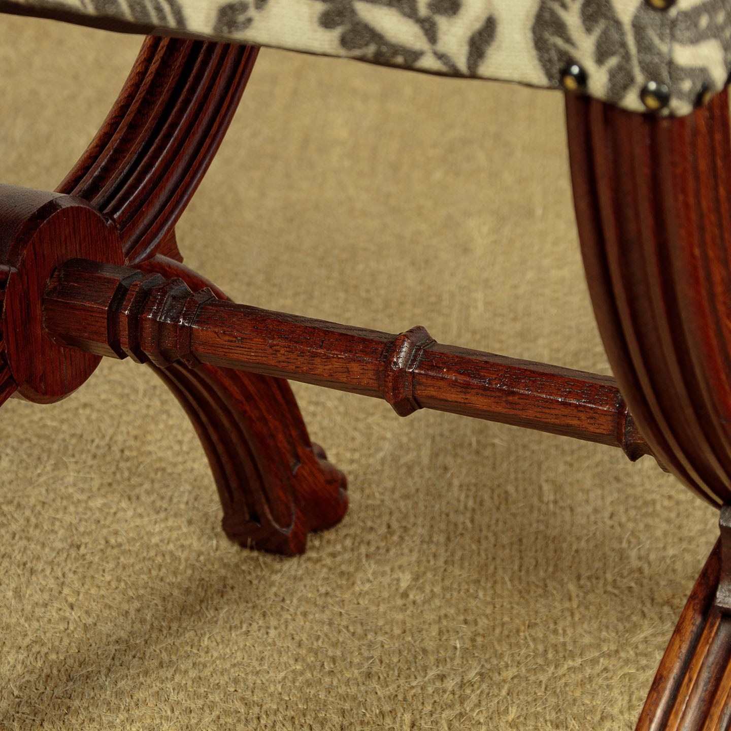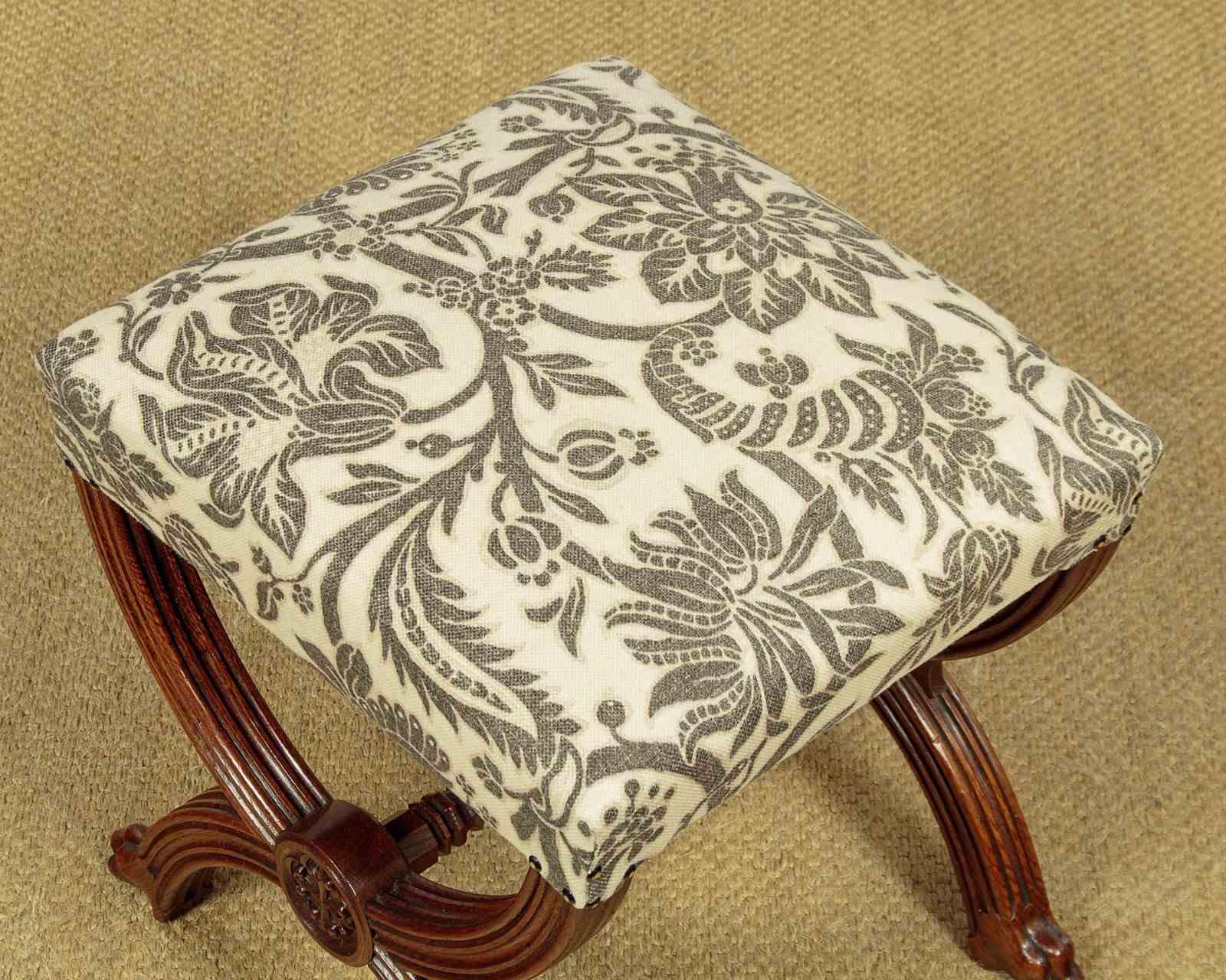 Splendid pair of Gothic revival oak stools c.1880. Sprung seats freshly upholstered in a damask prink linen. Superb X shaped frames in solid oak. Moulded legs with claw feet, joined with octagonal carved stretchers. Note the Gothic patonce crosses carved on the ends of the stools. Excellent condition, cleaned and waxed in our workshops.