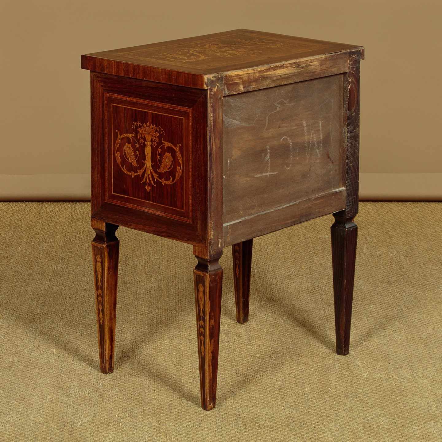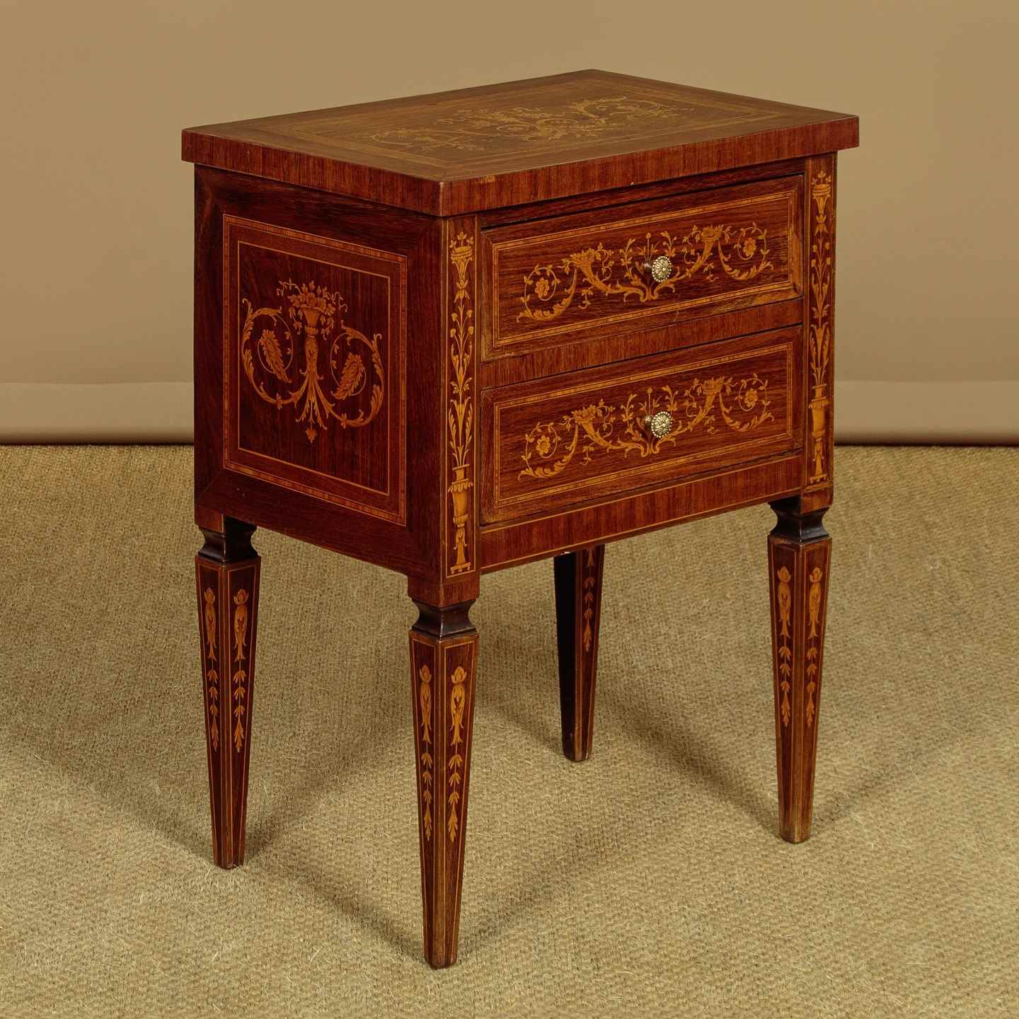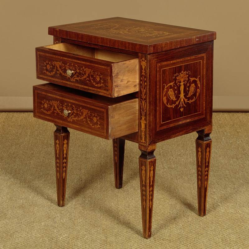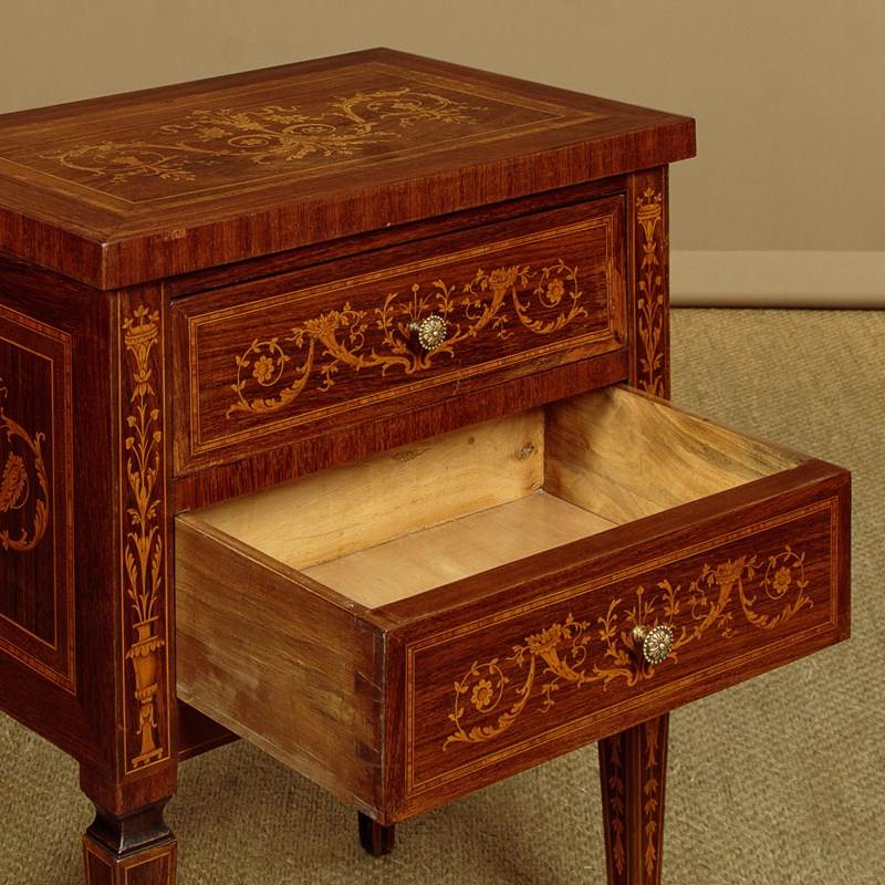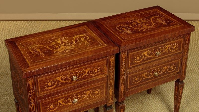 Beautiful pair of Italian marquetry inlaid side tables or bedsides c.1930. Two drawer cabinets veneered in rosewood and inlaid with superb quality Classical style marquetry decoration of scrolling foliate forms across the tops, drawer front and sides. Set within crossbanded satinwood and boxwood strung borders. Note the vase and flower decoration to the uprights flanking the drawer fronts. Raised on square tapering legs also marquetry inlaid. Original patterned brass knobs and maker's labels for Mobili IMEA of La Spezia on the Ligurian coast. Excellent colour and condition, cleaned and waxed in our workshops.