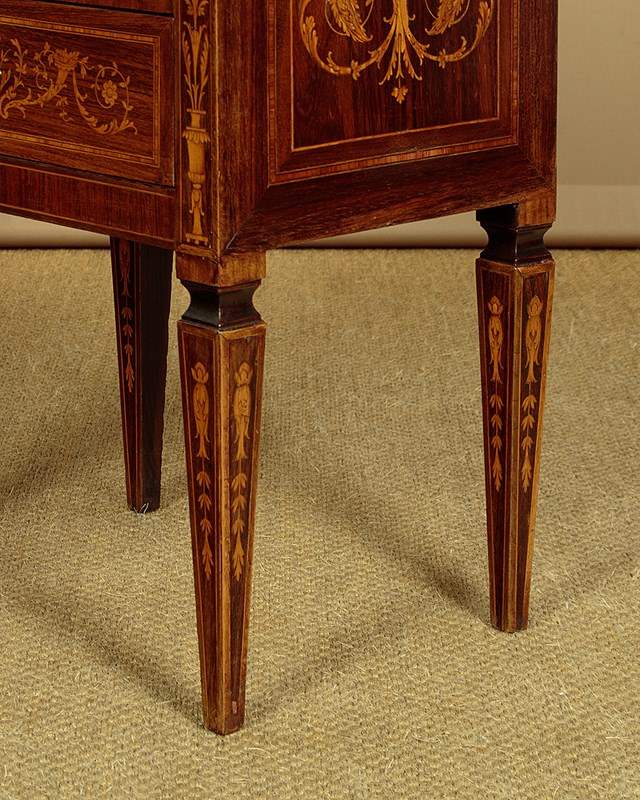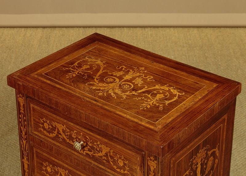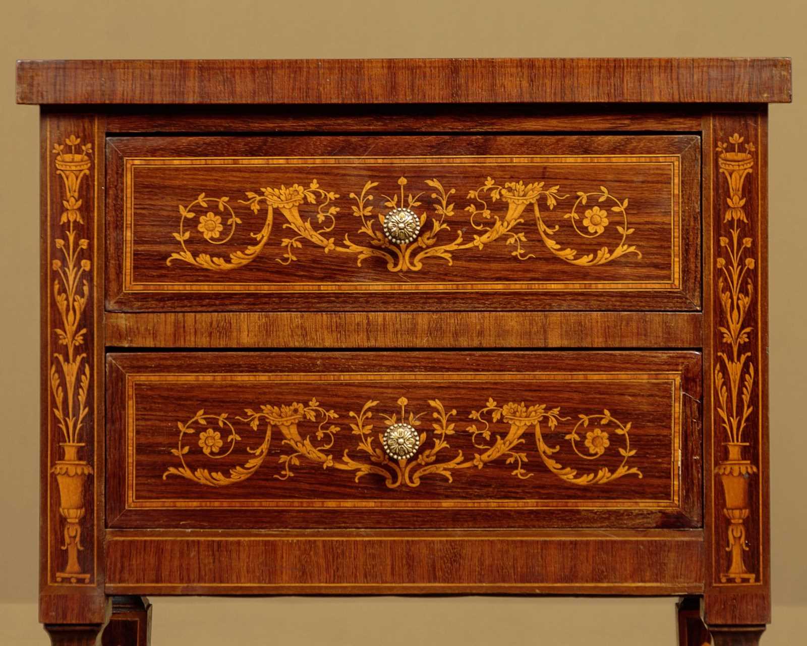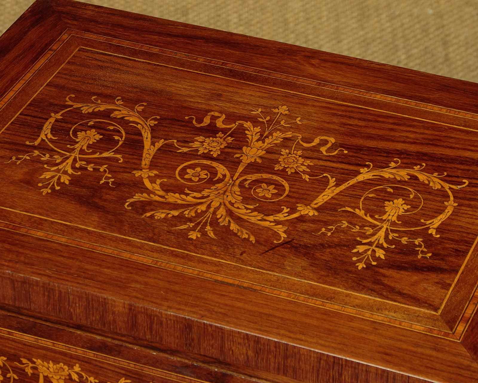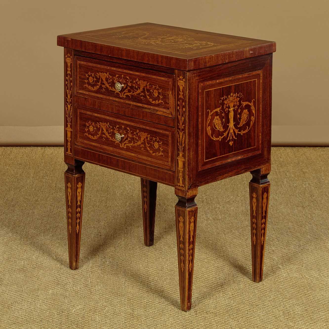 Beautiful pair of Italian marquetry inlaid side tables or bedsides c.1930. Two drawer cabinets veneered in rosewood and inlaid with superb quality Classical style marquetry decoration of scrolling foliate forms across the tops, drawer front and sides. Set within crossbanded satinwood and boxwood strung borders. Note the vase and flower decoration to the uprights flanking the drawer fronts. Raised on square tapering legs also marquetry inlaid. Original patterned brass knobs and maker's labels for Mobili IMEA of La Spezia on the Ligurian coast. Excellent colour and condition, cleaned and waxed in our workshops.