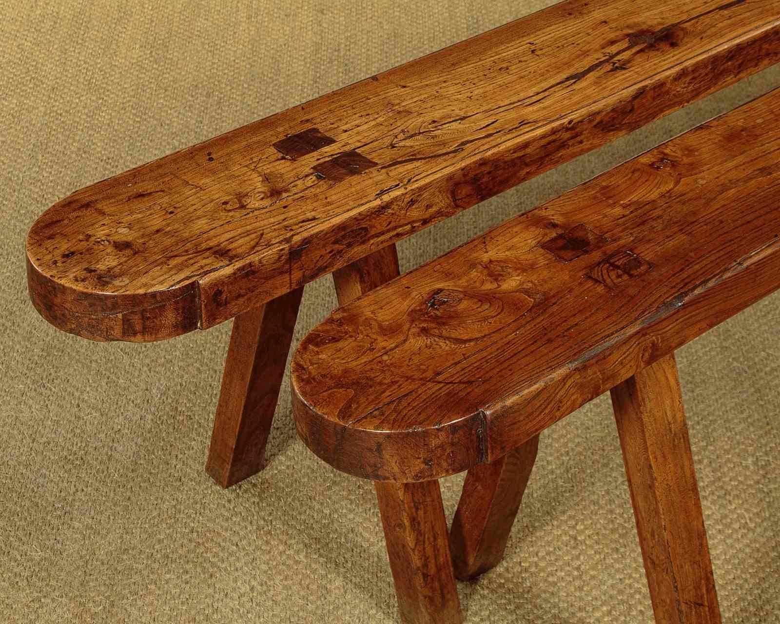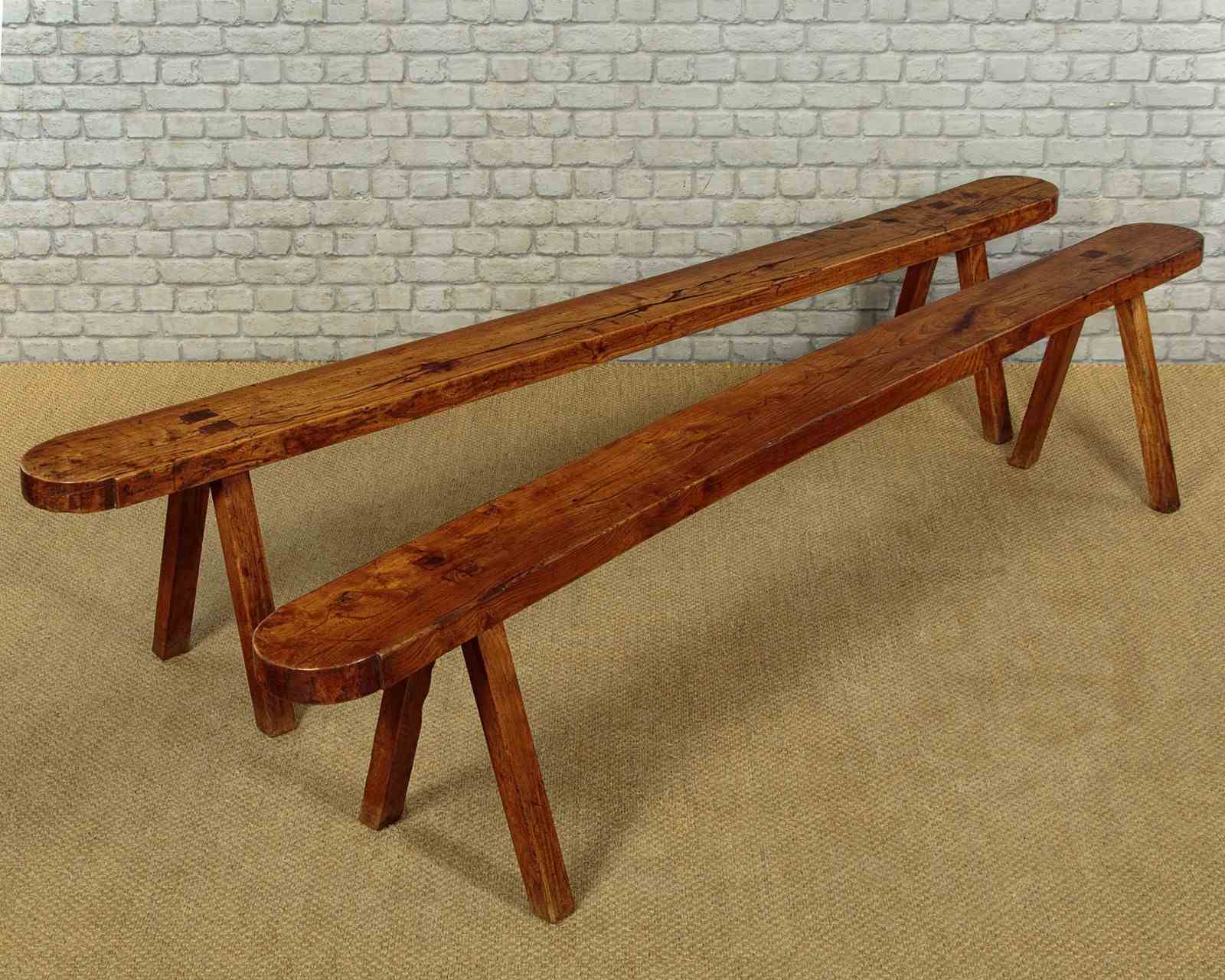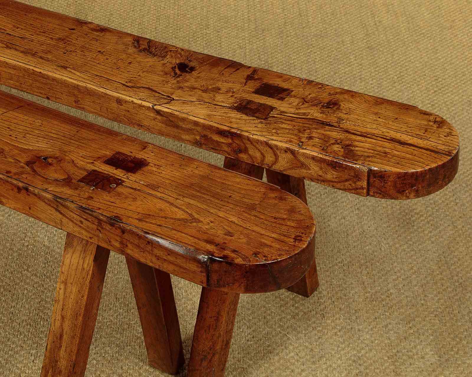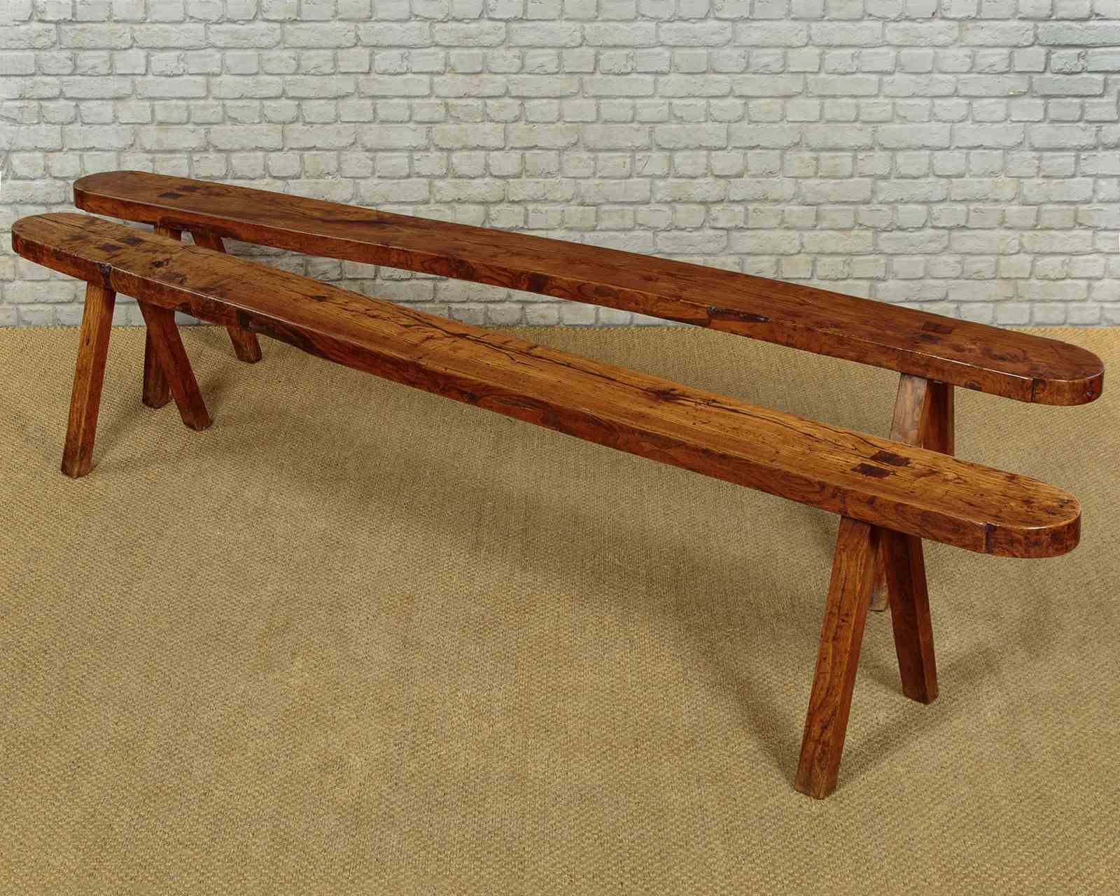 Fine pair of long late 19th.c. elm benches c.1890. Measuring 92½" (235cm), made from beautifully figured 2" thick solid elm boards (width 7") with rounded ends. Raised on splayed legs, also in elm. Very good condition, solid and sturdy with excellent colour and patina. Cleaned and waxed in our workshops.