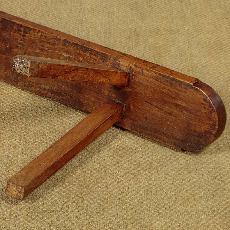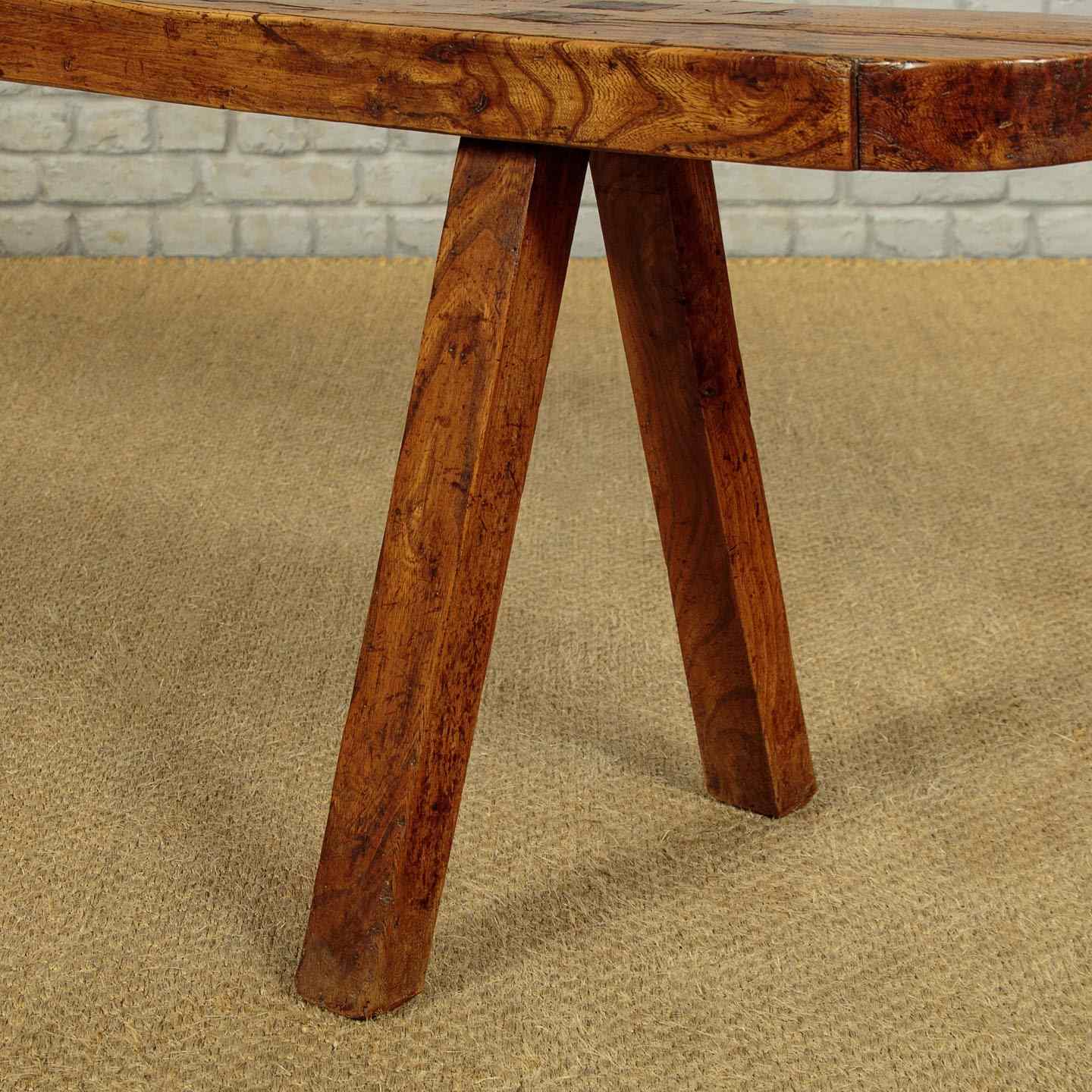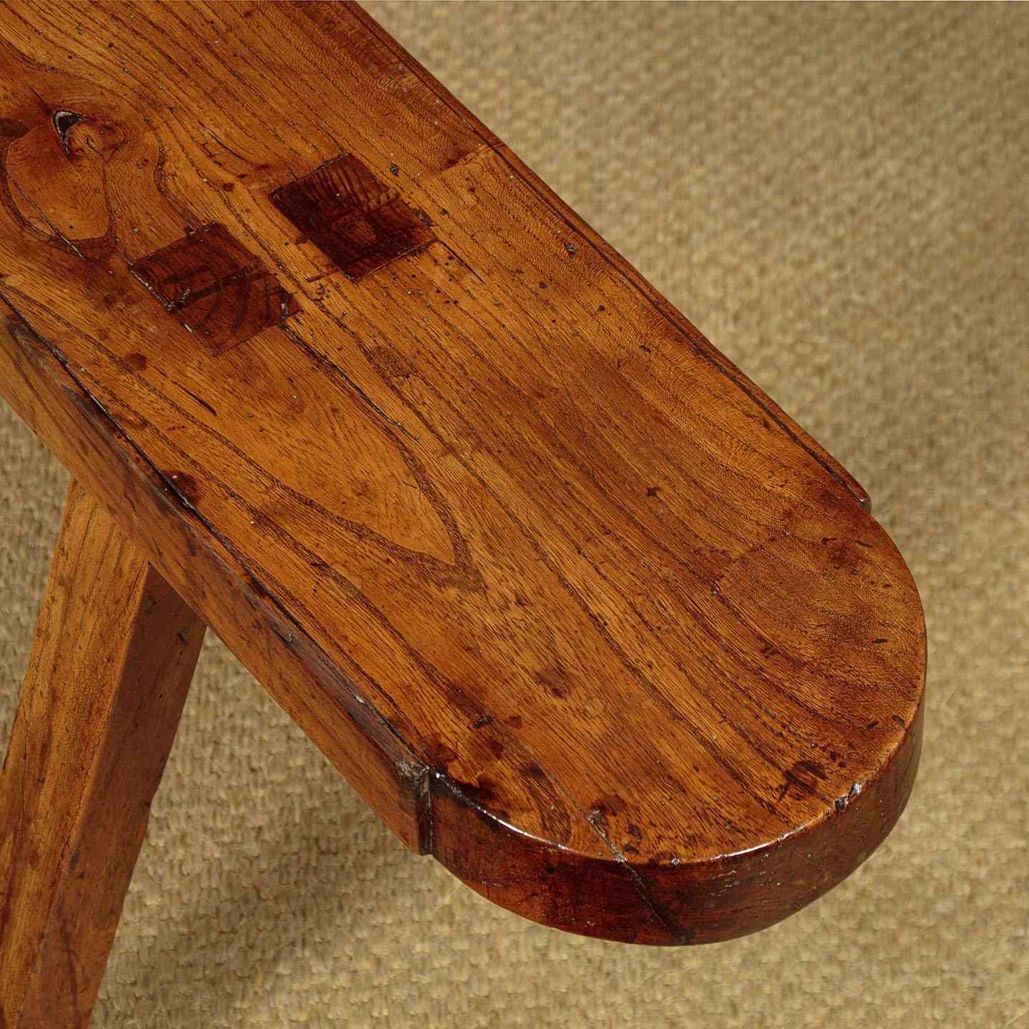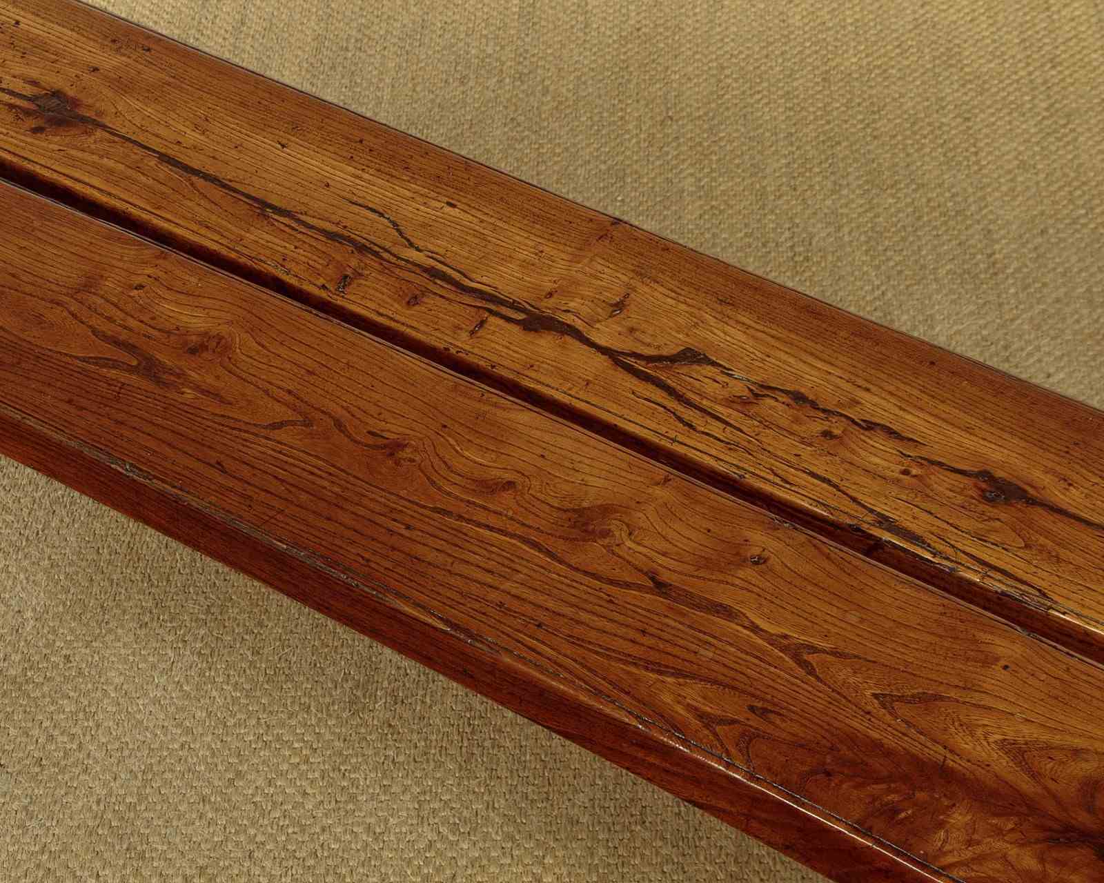 Fine pair of long late 19th.c. elm benches c.1890. Measuring 92½" (235cm), made from beautifully figured 2" thick solid elm boards (width 7") with rounded ends. Raised on splayed legs, also in elm. Very good condition, solid and sturdy with excellent colour and patina. Cleaned and waxed in our workshops.