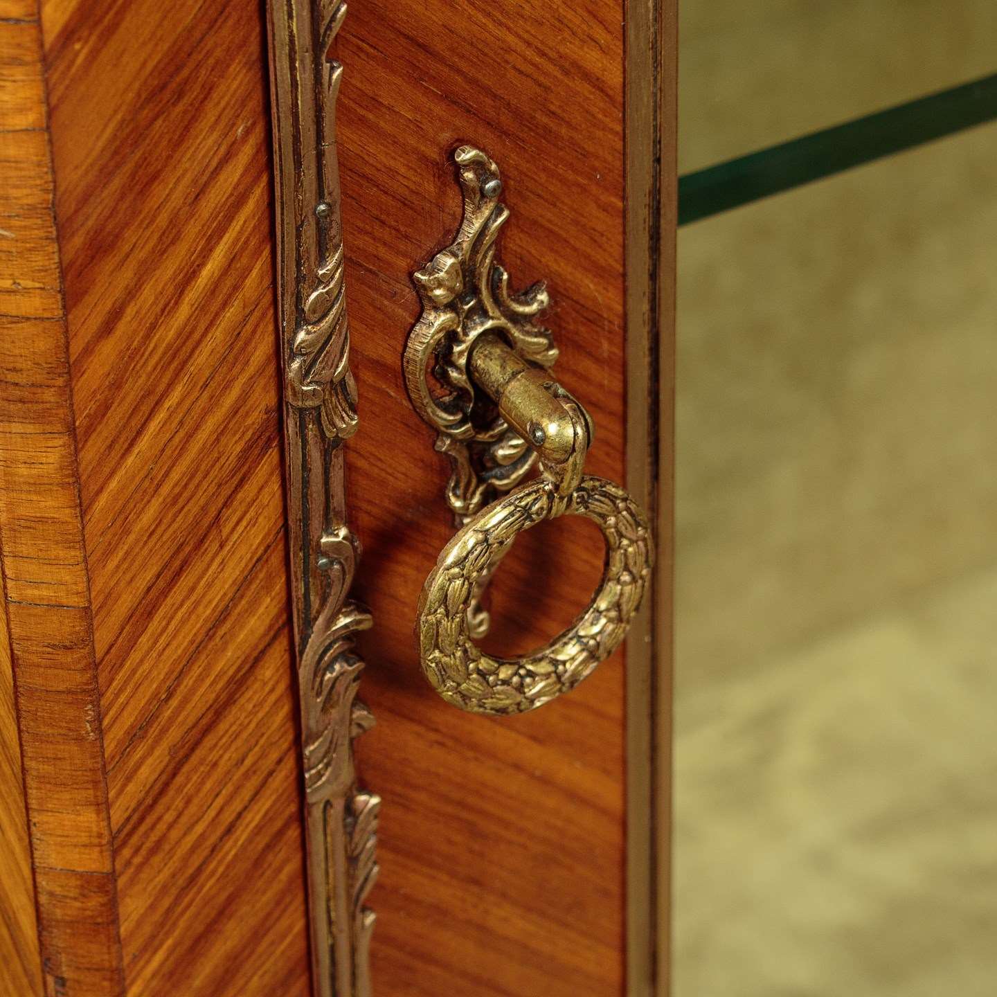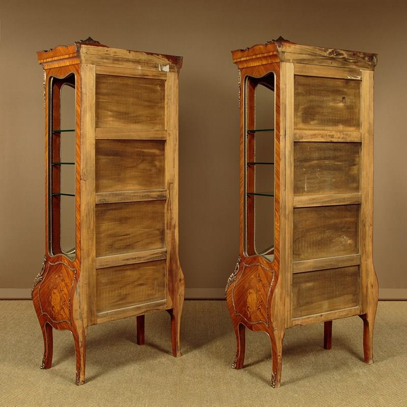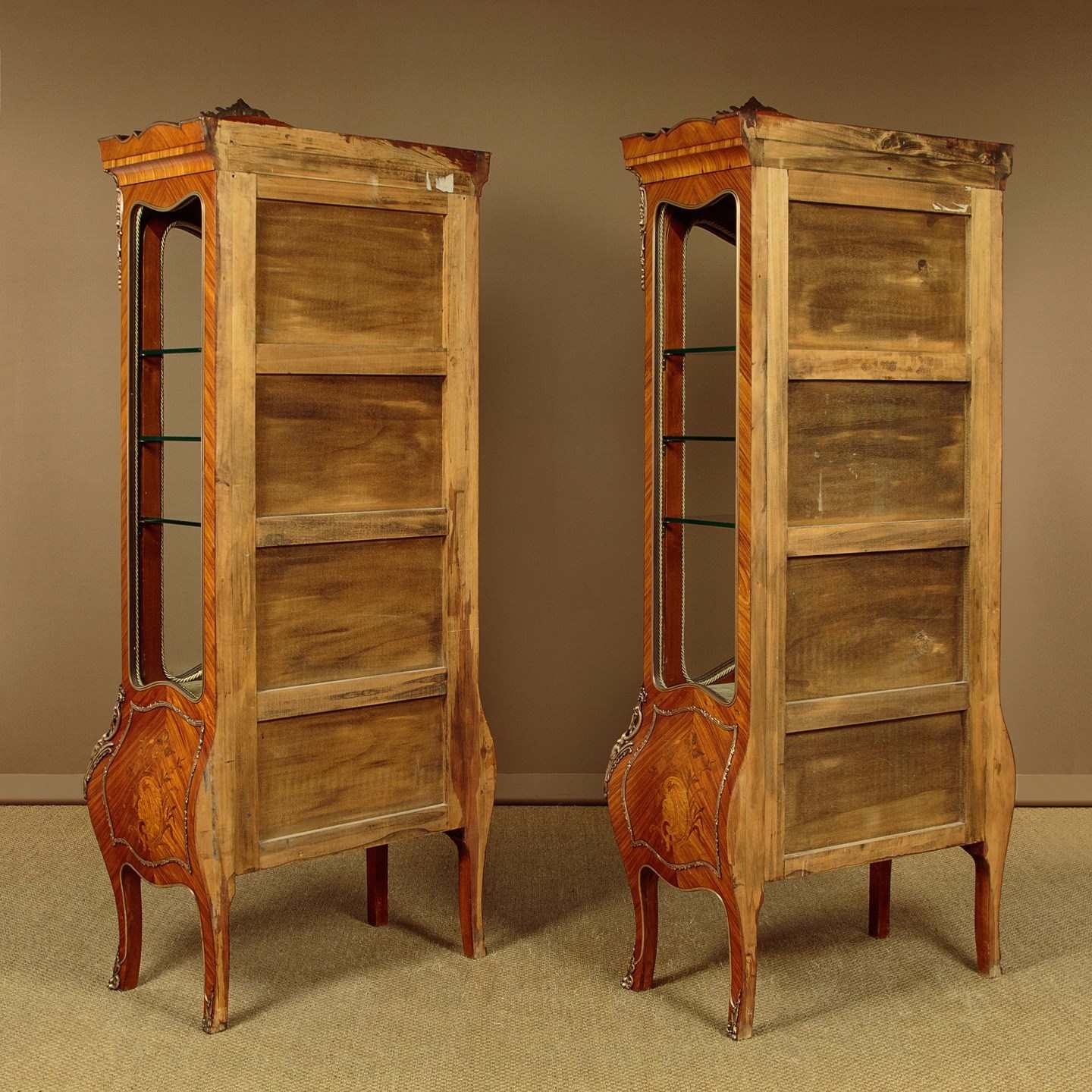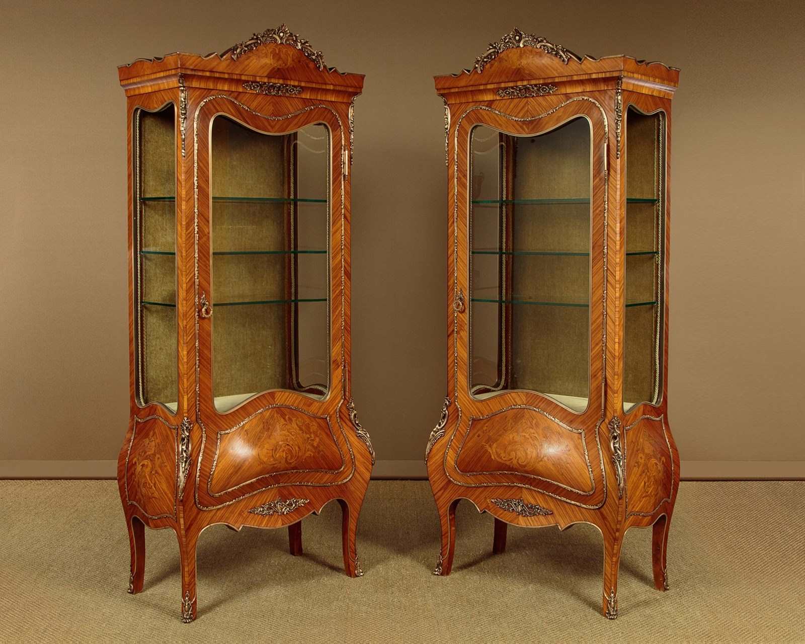 Superb pair of Louis XV style inlaid and brass mounted tulipwood display cabinets or vitrine c.1960. Glazed display cabinets each with a left hand opening door and fitted inside with three glass shelves (internal depth 10½") with green velvet lining and useful blind storage in the base. Tall cornice, shaped glazing and bombe shaped panels in the base. Tulipwood veneers with extensive brass mounts and mouldings and inlaid parquetry decoration. Original keys with unusual hinged laurel wreath bows. Excellent condition, cleaned and waxed in our workshops.