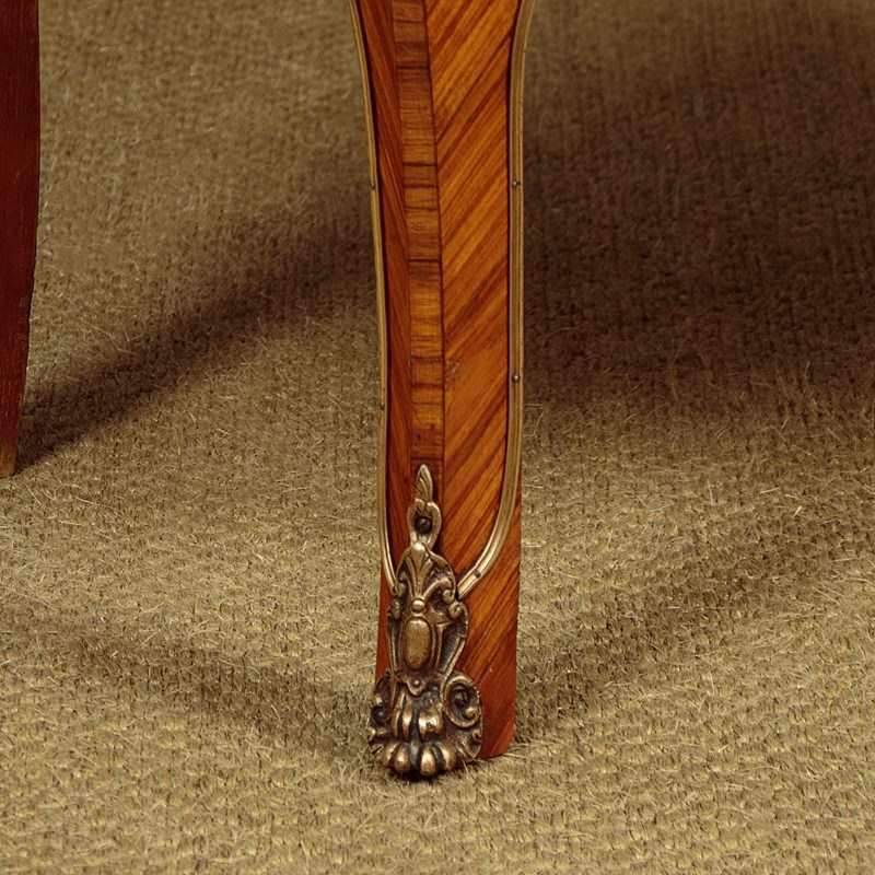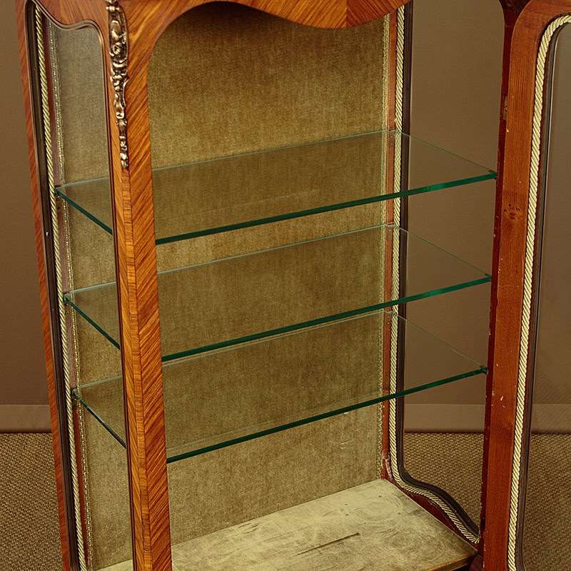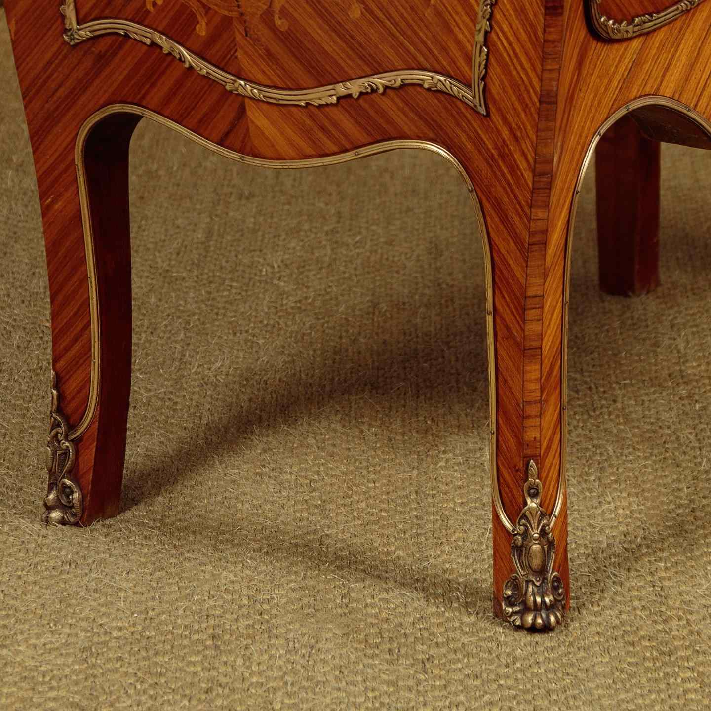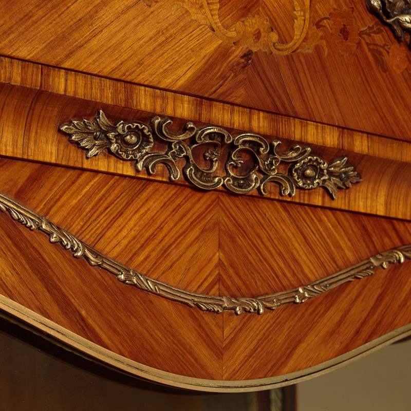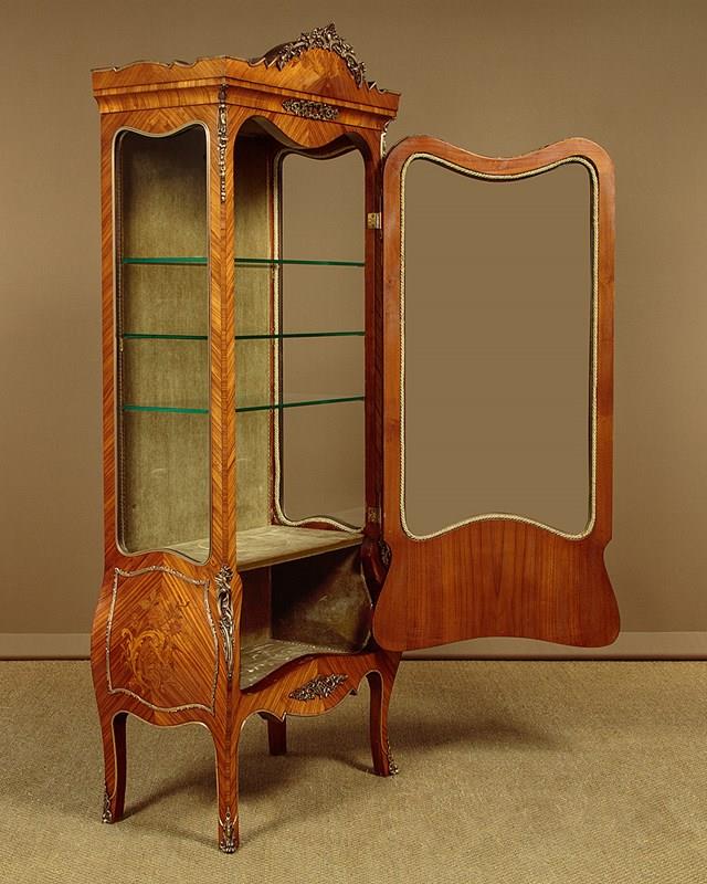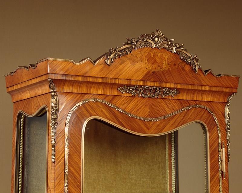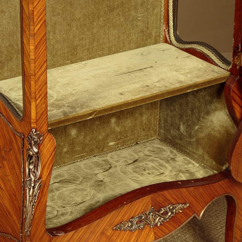 Superb pair of Louis XV style inlaid and brass mounted tulipwood display cabinets or vitrine c.1960. Glazed display cabinets each with a left hand opening door and fitted inside with three glass shelves (internal depth 10½") with green velvet lining and useful blind storage in the base. Tall cornice, shaped glazing and bombe shaped panels in the base. Tulipwood veneers with extensive brass mounts and mouldings and inlaid parquetry decoration. Original keys with unusual hinged laurel wreath bows. Excellent condition, cleaned and waxed in our workshops.