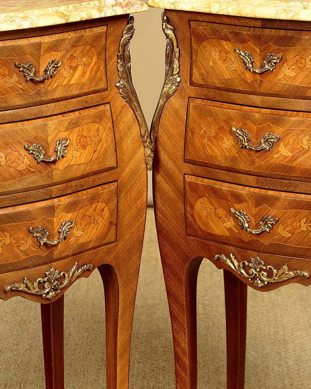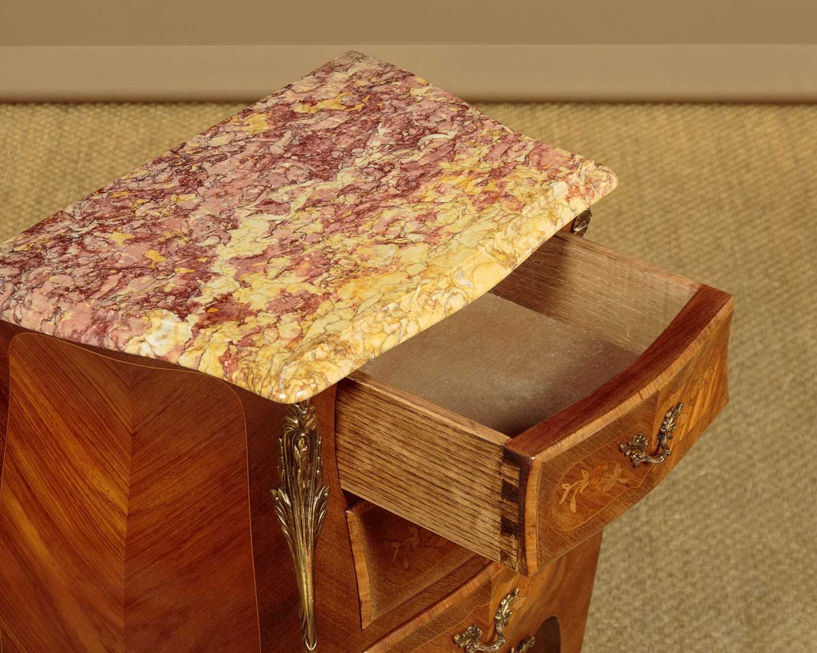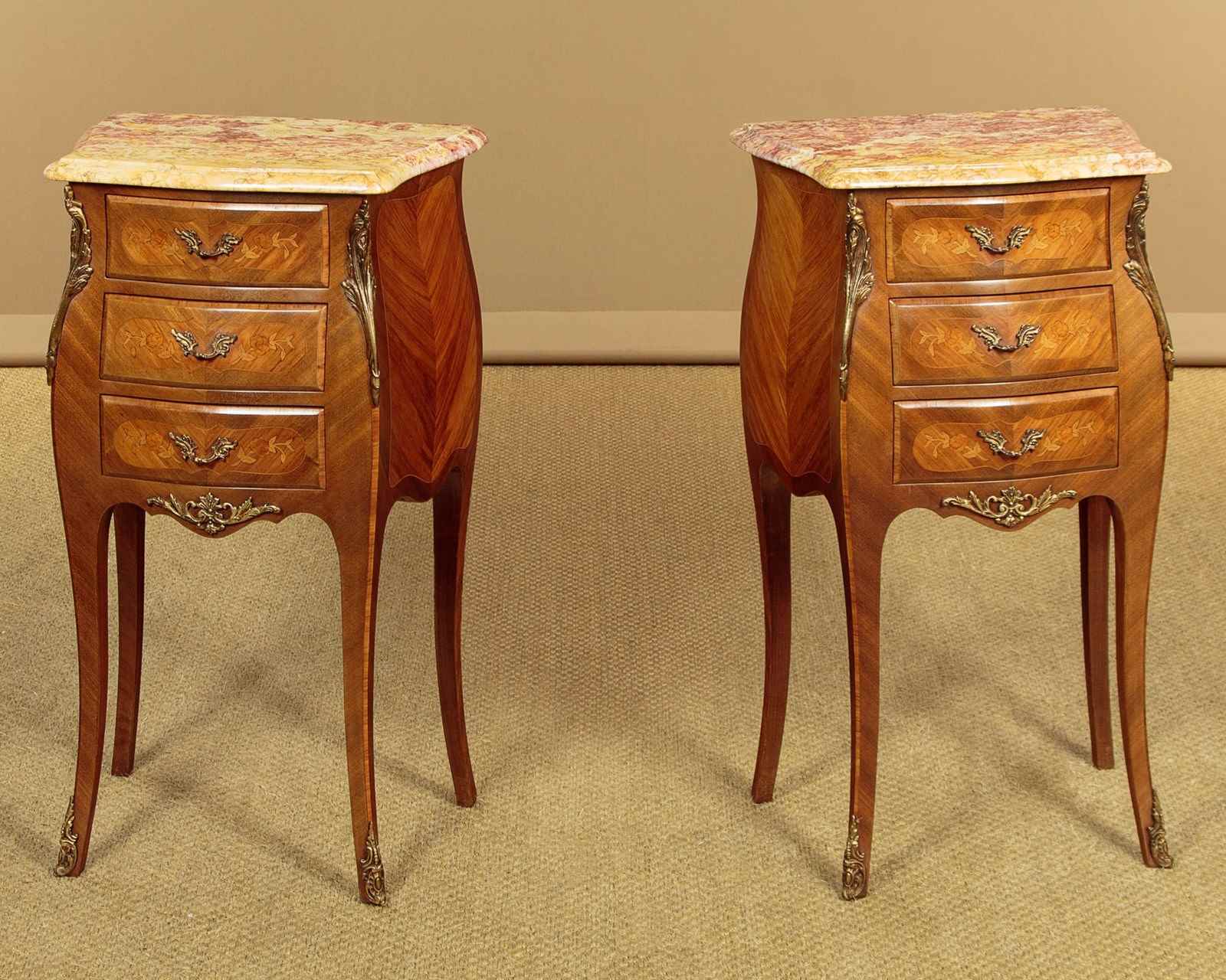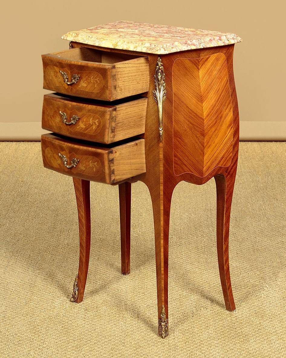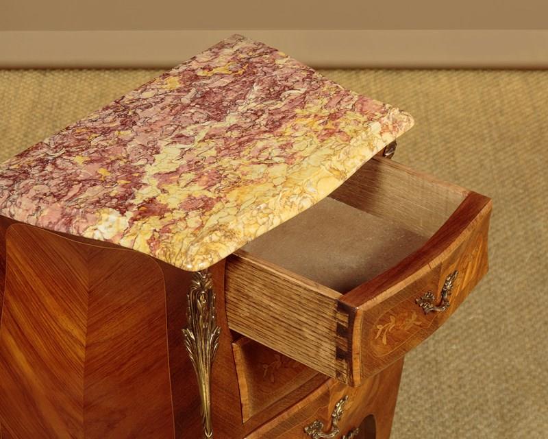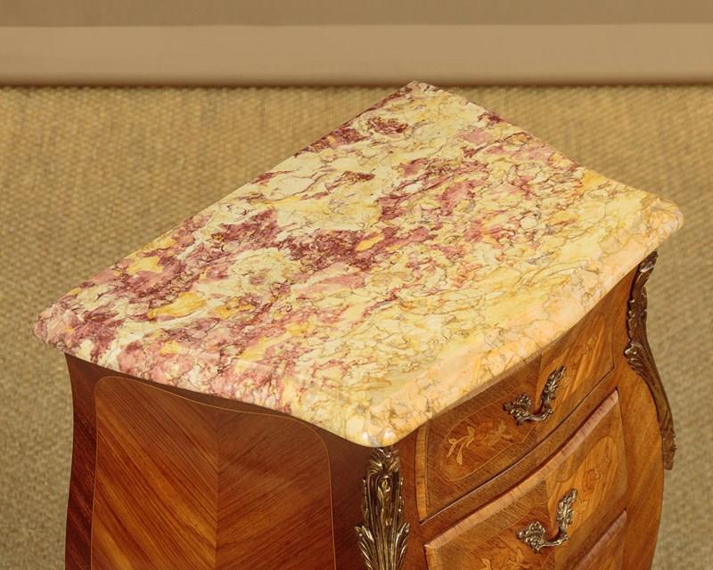 Smart little pair of French Louis XV style marble top bedside cabinets c.1960. Highly figured marble tops with serpentine shaped and moulded edges. Over bombe shaped chests of three small drawers. With symmetrically arranged tulip wood veneers inlaid with floral marquetry work decoration to the drawer fronts. Decorative brass handles and large brass mounts to the shoulders and the centre of the apron below the drawers. Raised on slim curving legs with brass mounts to the front feet. Excellent colour and condition, cleaned and waxed in our workshops.
