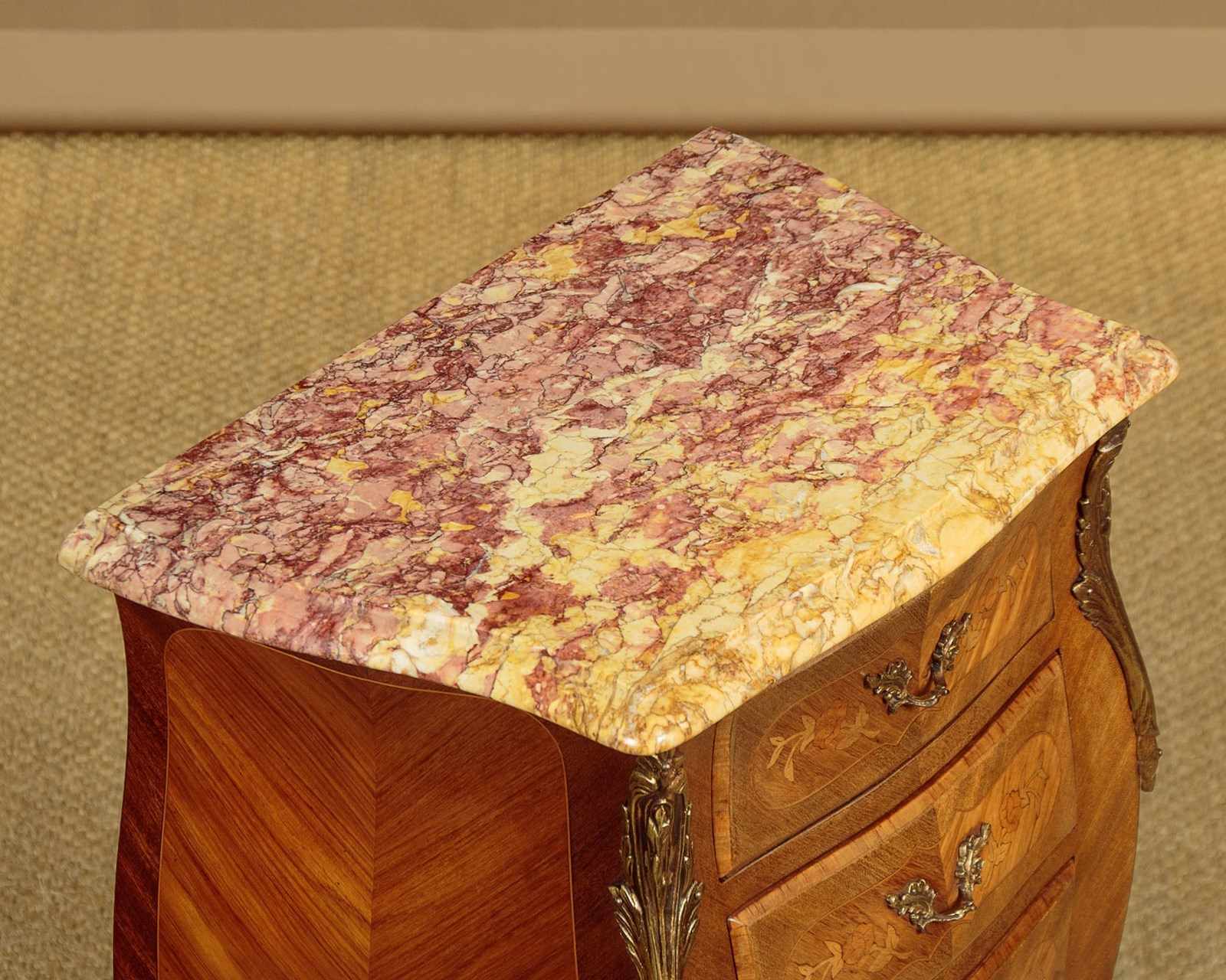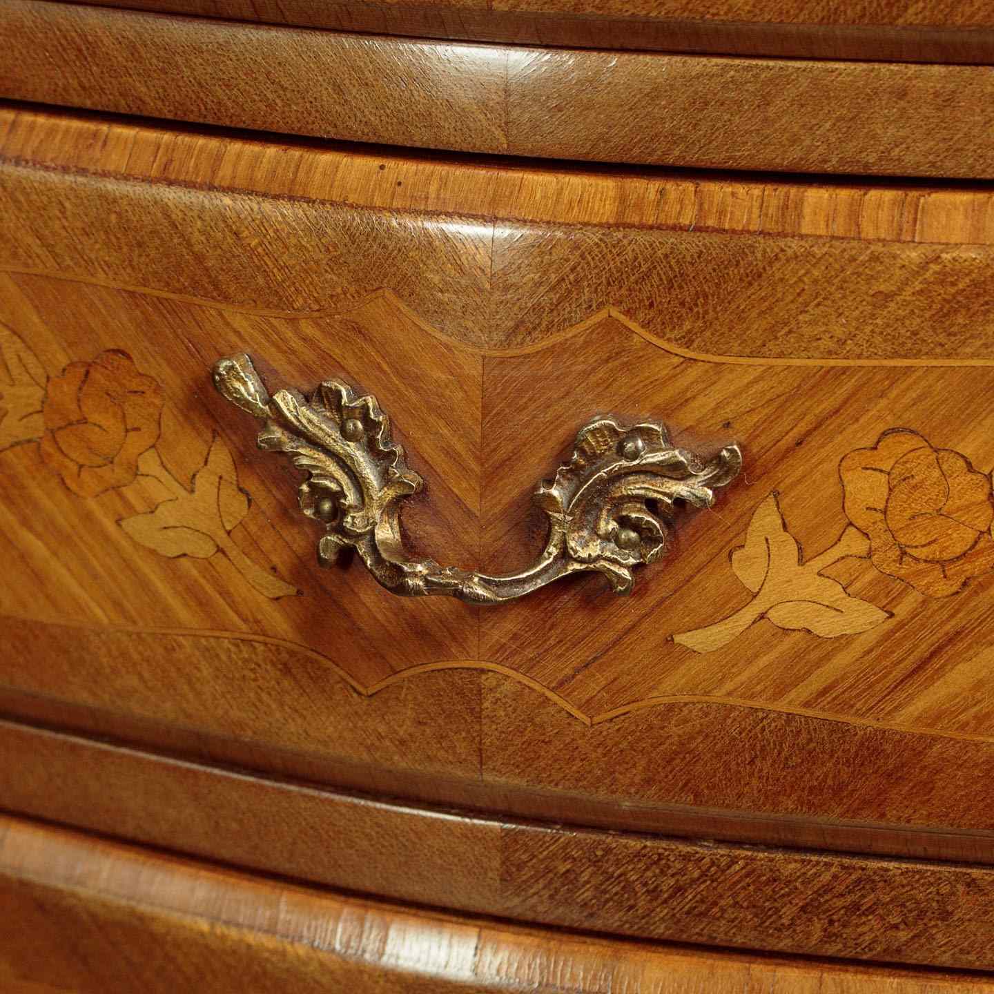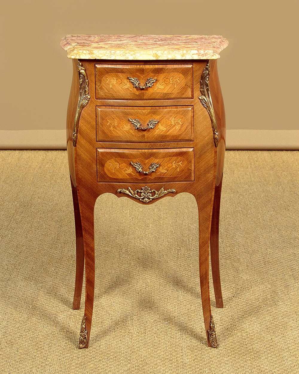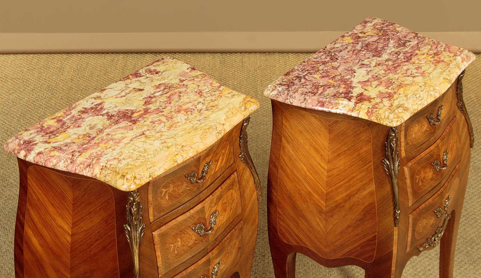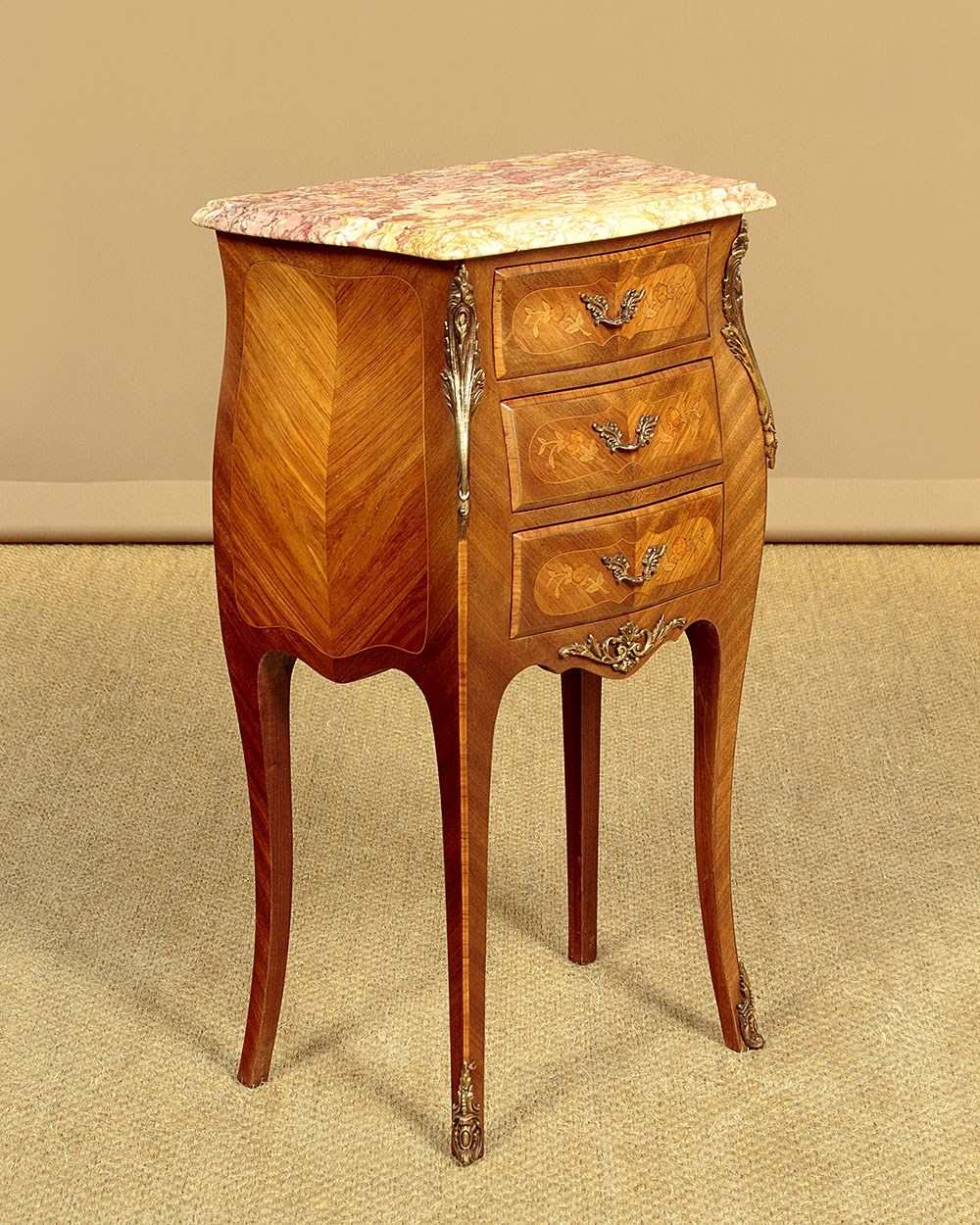 Smart little pair of French Louis XV style marble top bedside cabinets c.1960. Highly figured marble tops with serpentine shaped and moulded edges. Over bombe shaped chests of three small drawers. With symmetrically arranged tulip wood veneers inlaid with floral marquetry work decoration to the drawer fronts. Decorative brass handles and large brass mounts to the shoulders and the centre of the apron below the drawers. Raised on slim curving legs with brass mounts to the front feet. Excellent colour and condition, cleaned and waxed in our workshops.