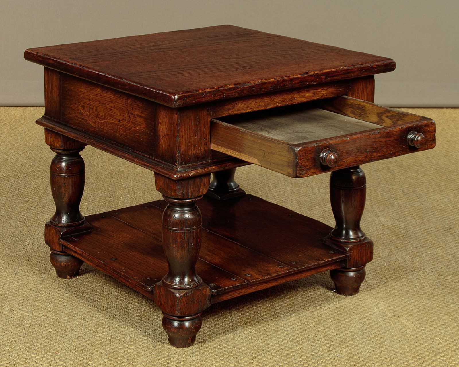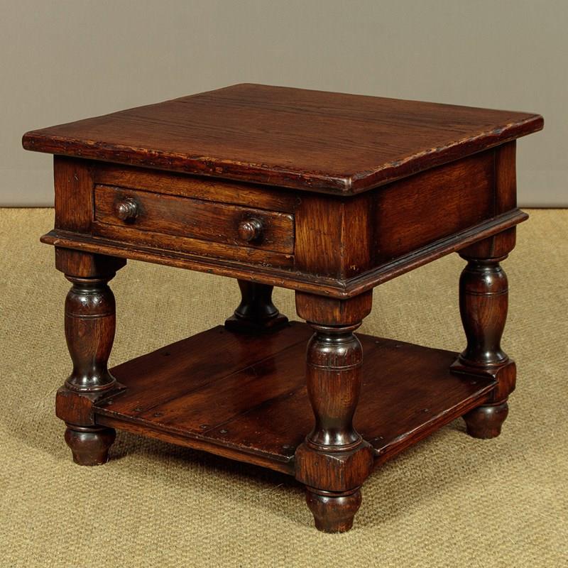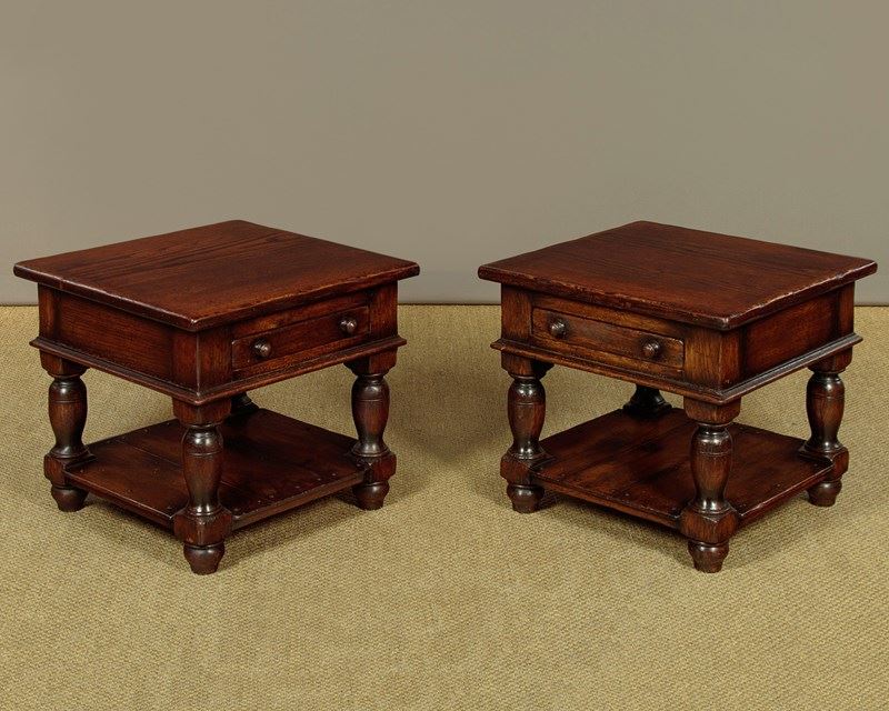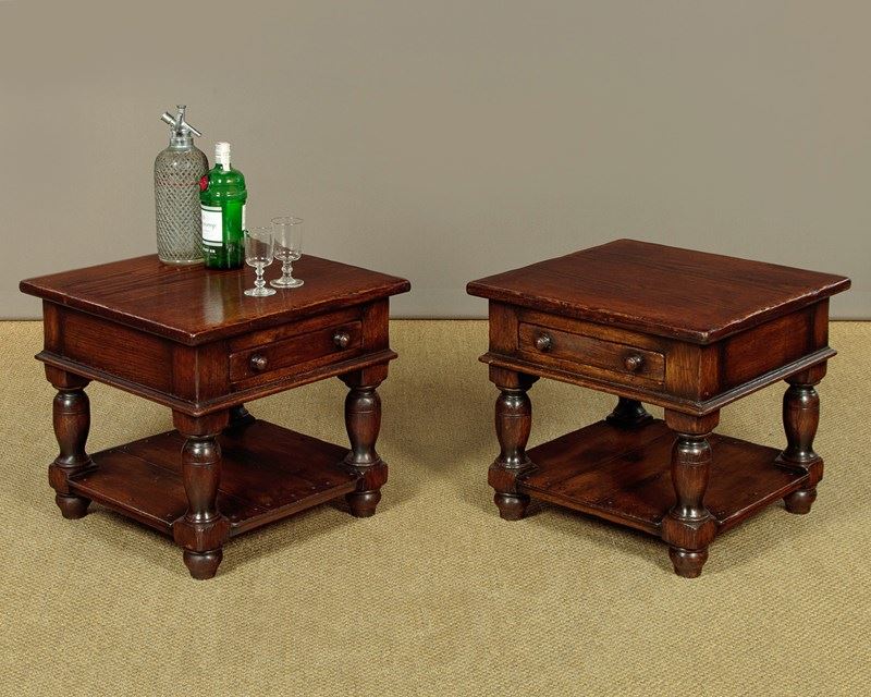 Pair of sturdy low oak side or coffee tables. In the manner of quality 20th.c. British makers such as Titchmarsh & Goodwin. 22" square tops over a slim oak lined drawer to one side with turned knobs. Solid oak sides and a moulded edge all round. Raised on stout turned and block legs joined with a low stretcher shelf. Excellent condition, cleaned and waxed in our workshops.