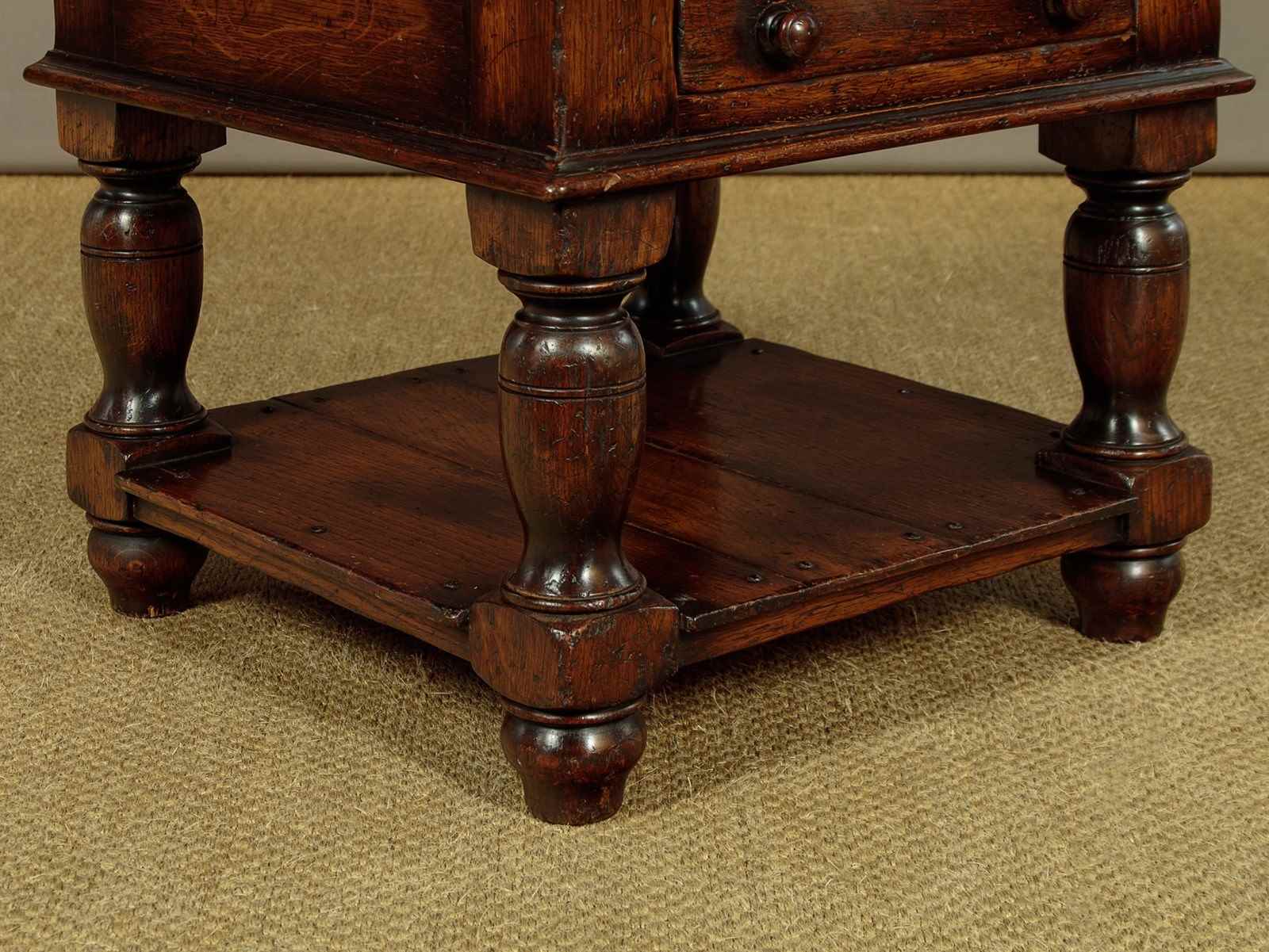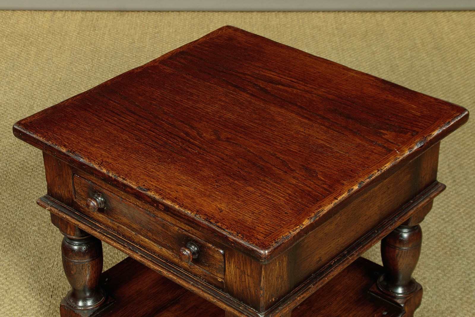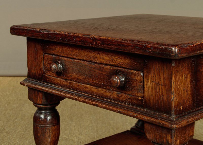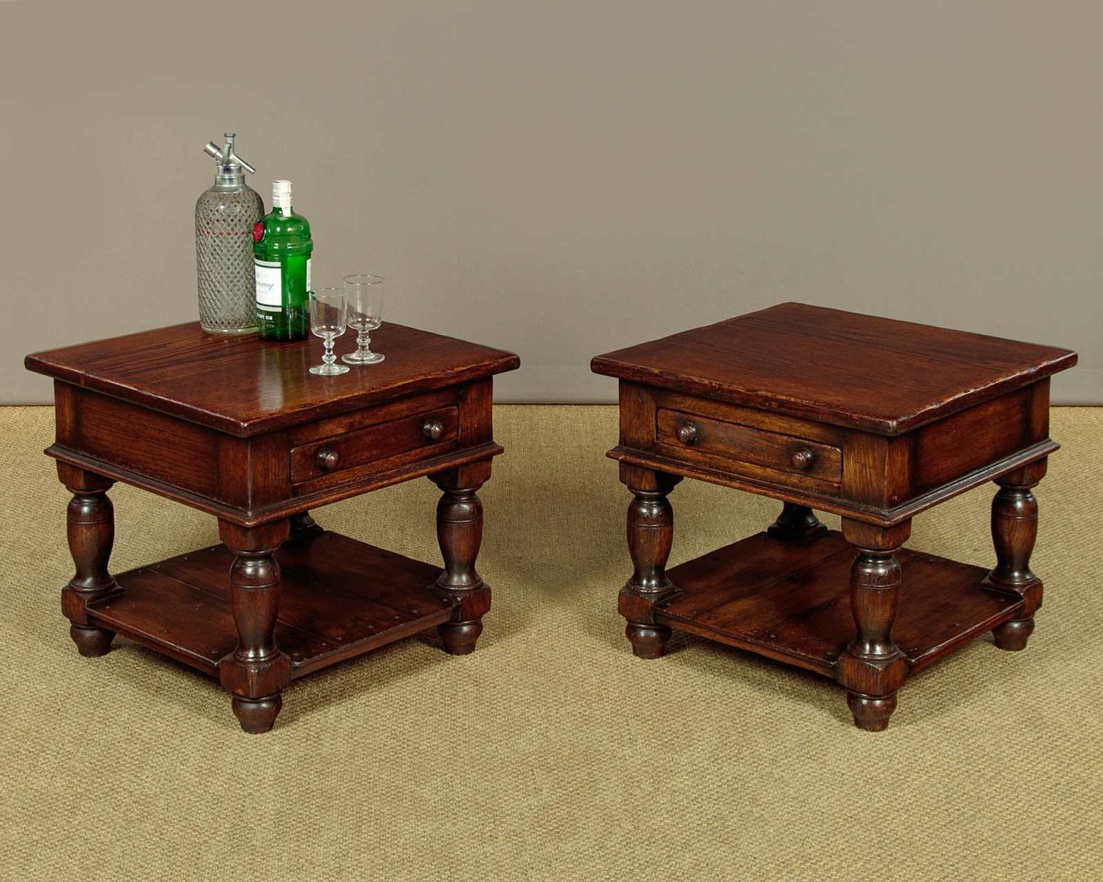 Pair of sturdy low oak side or coffee tables. In the manner of quality 20th.c. British makers such as Titchmarsh & Goodwin. 22" square tops over a slim oak lined drawer to one side with turned knobs. Solid oak sides and a moulded edge all round. Raised on stout turned and block legs joined with a low stretcher shelf. Excellent condition, cleaned and waxed in our workshops.