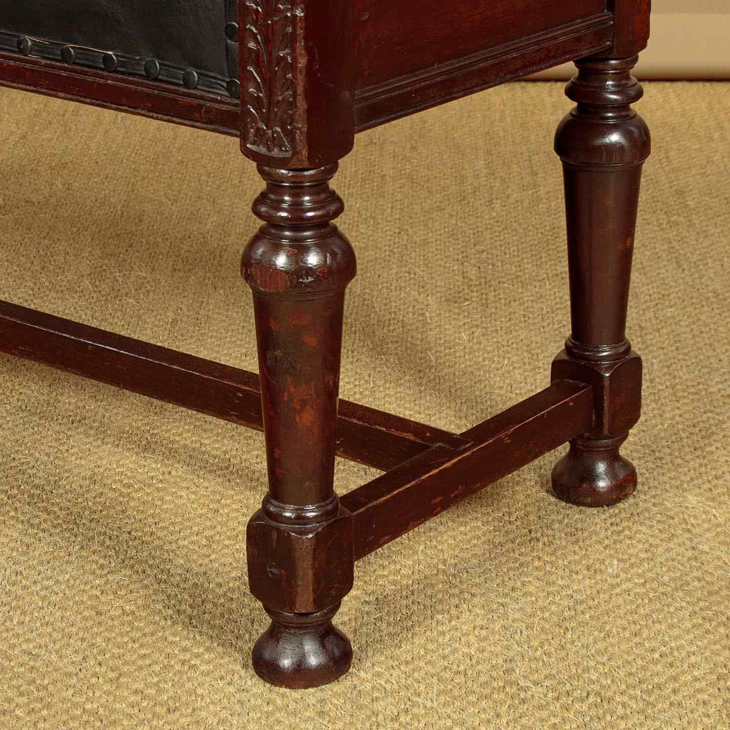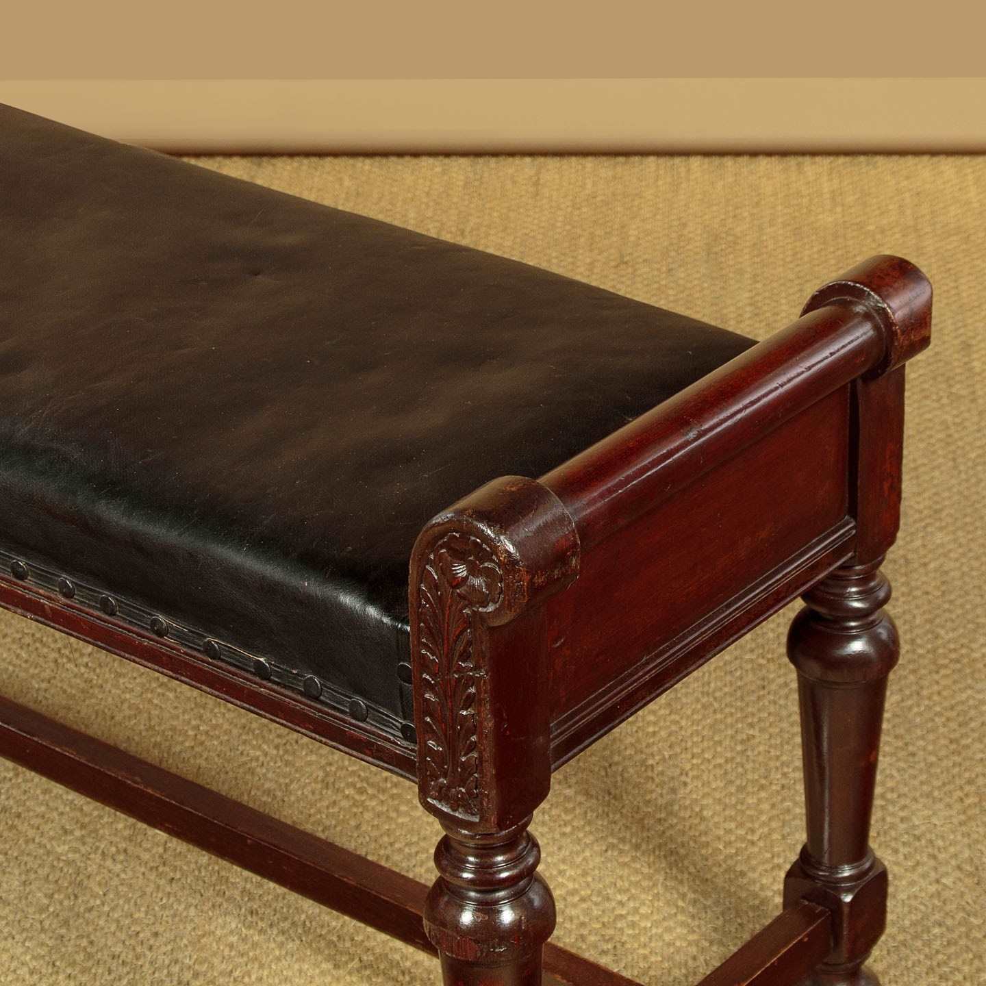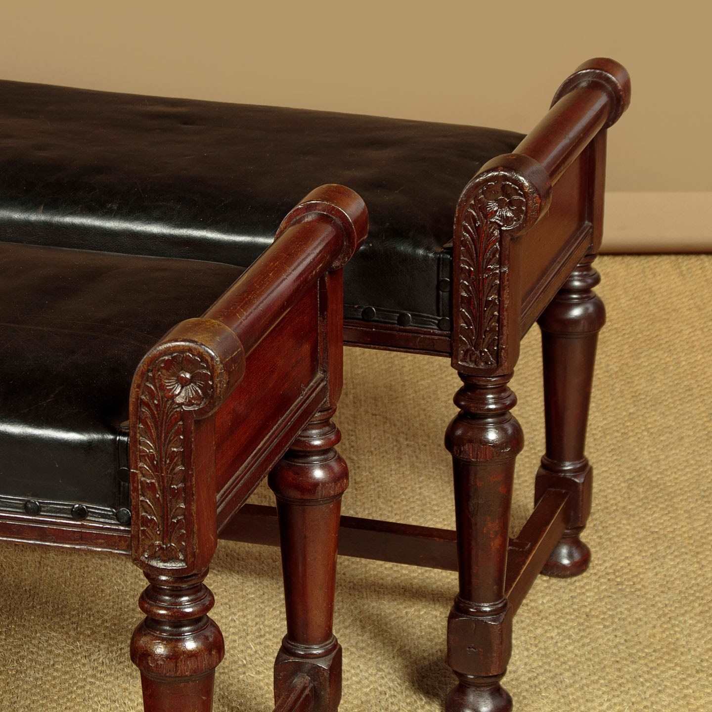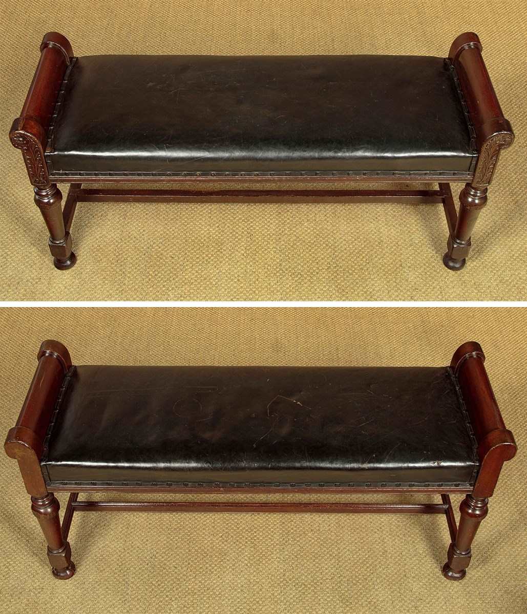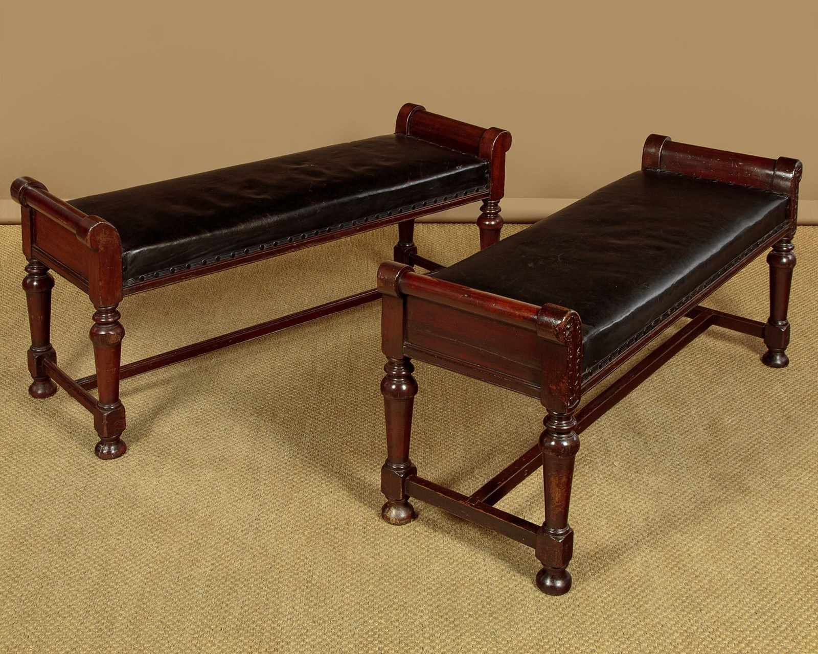 Handsome pair of late 19th.c. mahogany and leather benches c.1880. 41" x 16" padded seats (height 18") in black leather. Solid mahogany frames with raised roll-over ends carved with a flower detail to one face on both stools (the other face left plain). Raised on turned and tapering legs joined with an H stretcher for strength. Some obvious old wear but solid and sturdy, cleaned and waxed in our workshops.