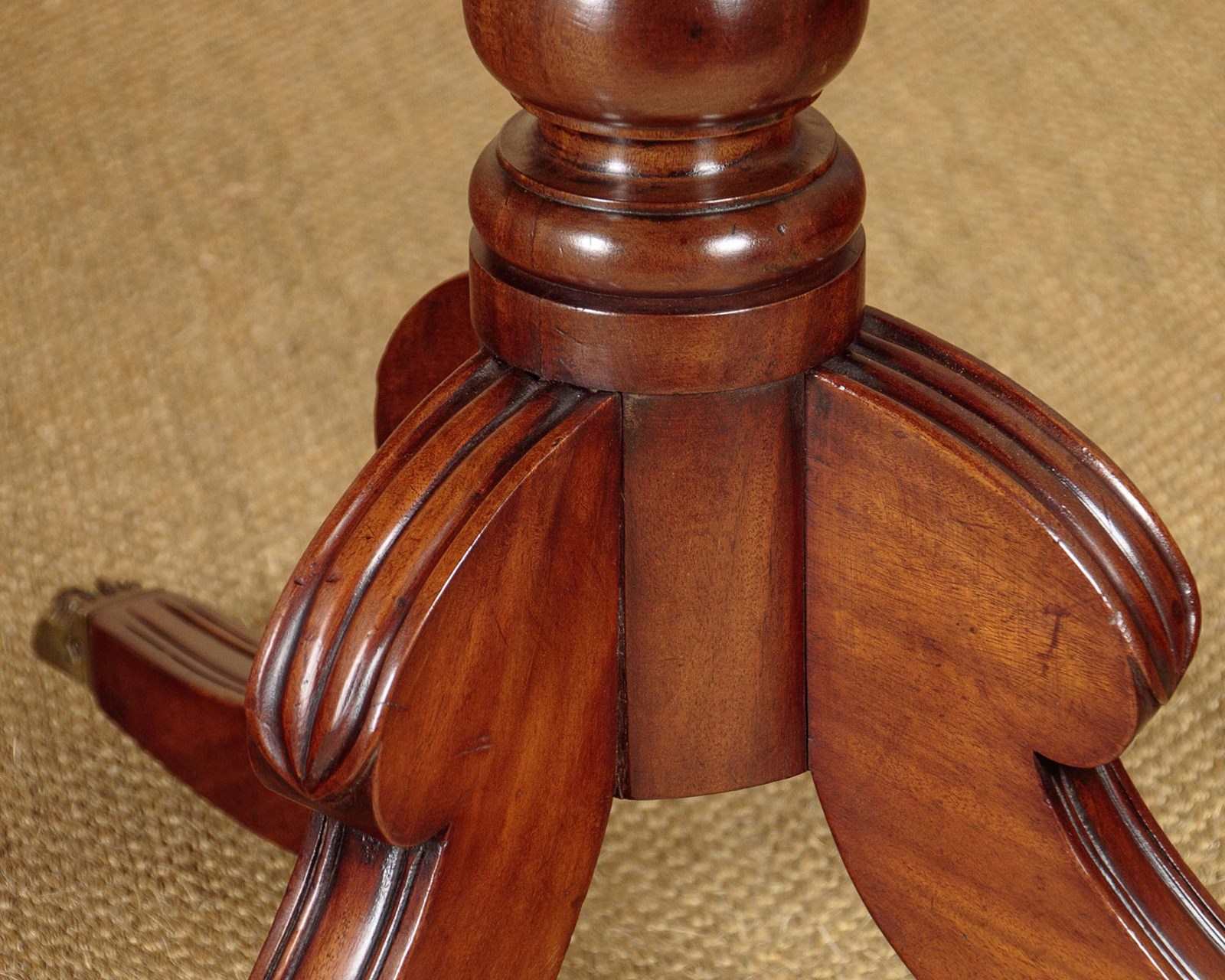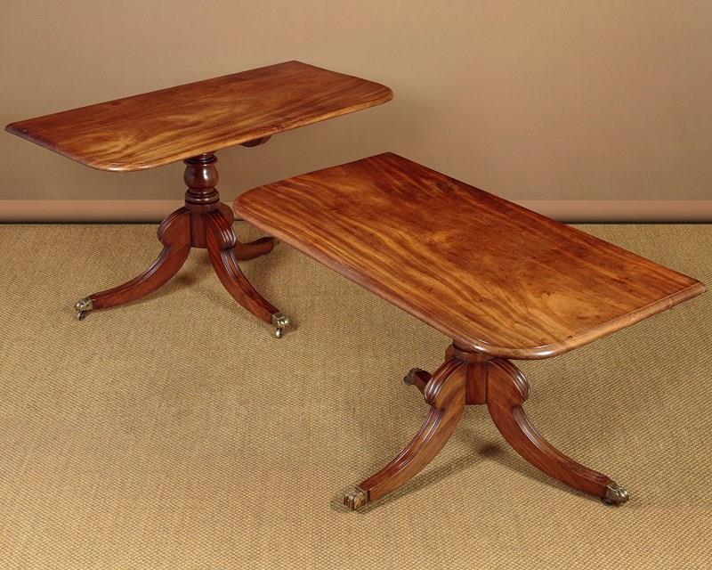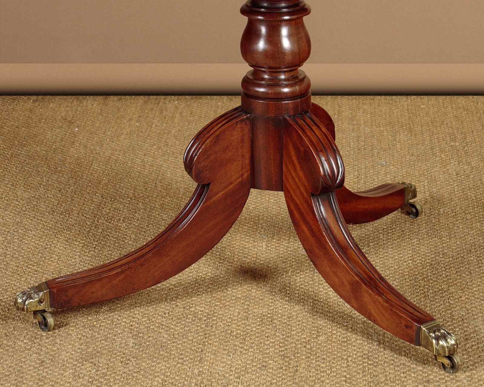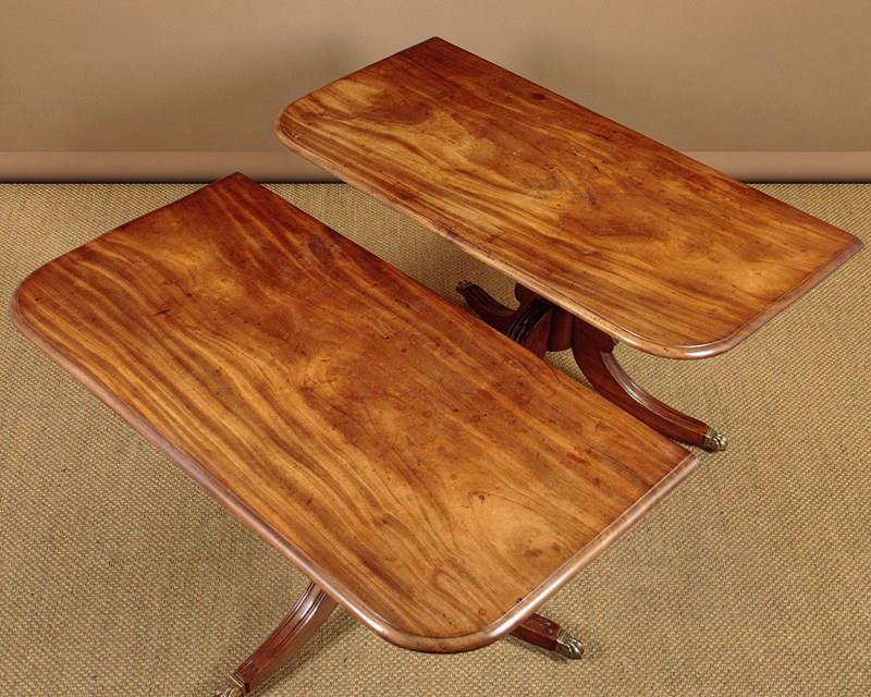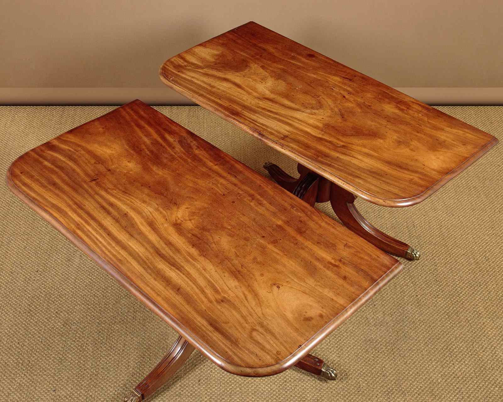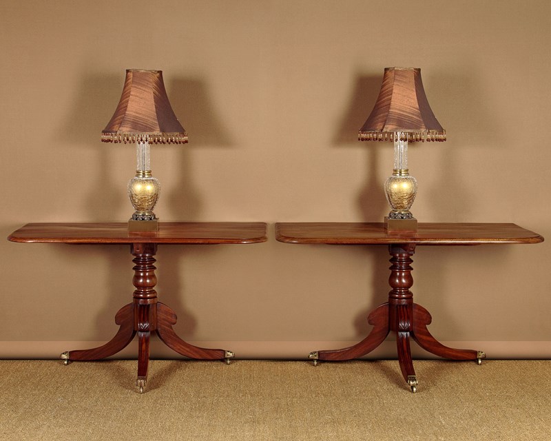 Good pair of Regency mahogany side tables c.1820. 48" x 24" single piece solid mahogany tops of good grain with rounded front corners and moulded edges. Raised on crisp turned columns and shapely tripod legs with moulded detail and brass claw feet and castors. Some old marks to the tops, otherwise very good condition and attractive colour. Cleaned and waxed in our workshops.