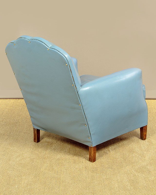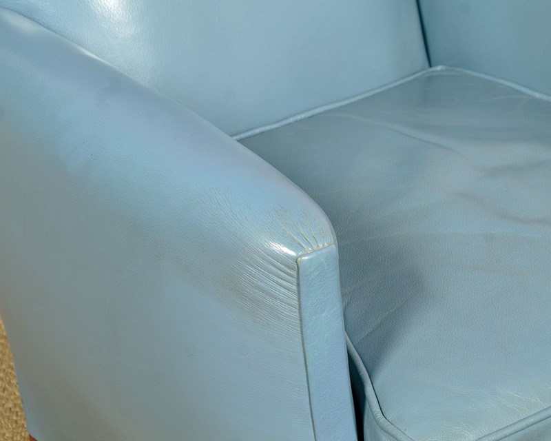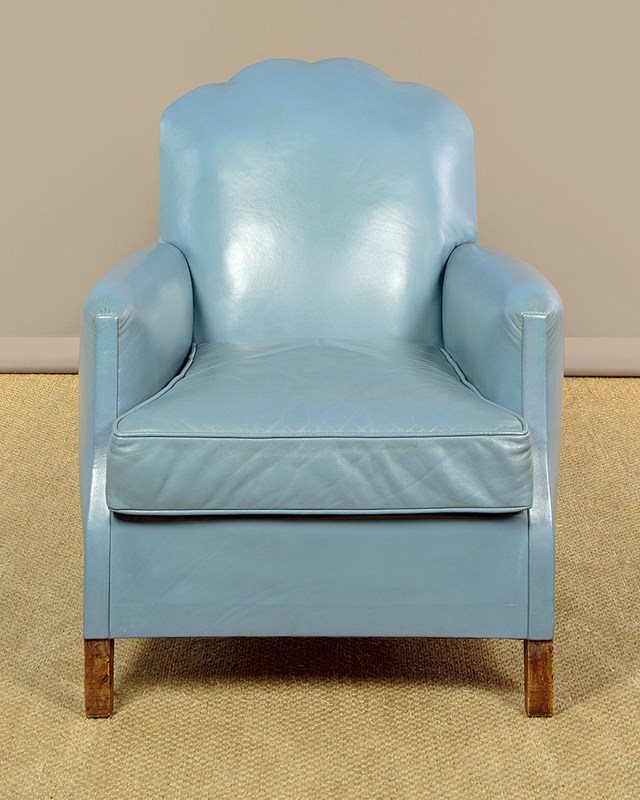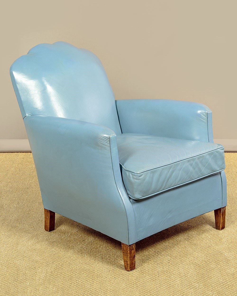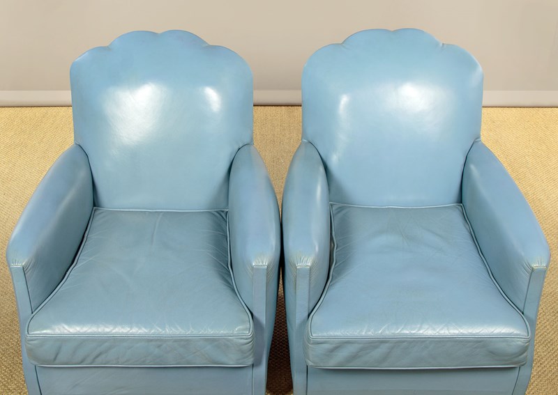 Delightful pair of Art Deco style leather easy armchairs c.1950. Low sloping sprung and padded backs with attractive cloud shaped tops. Over slim rounded arms and deep sprung seats (height 16½") with loose cushions. Upholstered in a sky blue leather with piped edges to the cushions and chromed studs at the rear. Raised on short tapering legs in stained beechwood. Very good condition, cleaned and waxed in our workshops.