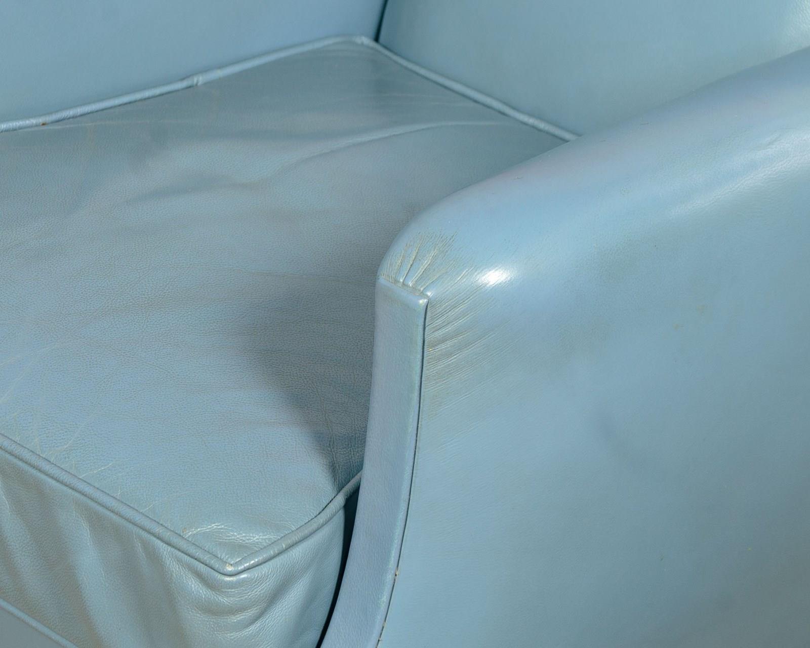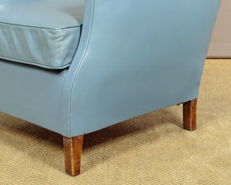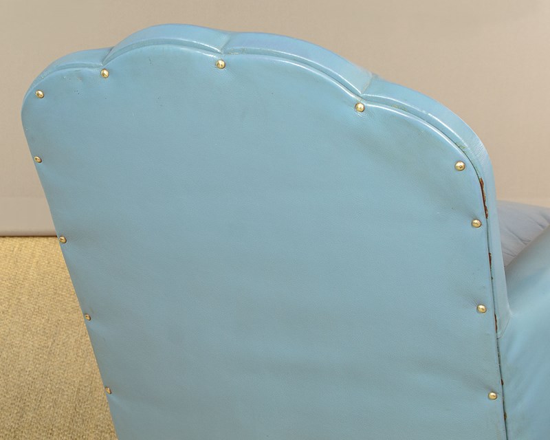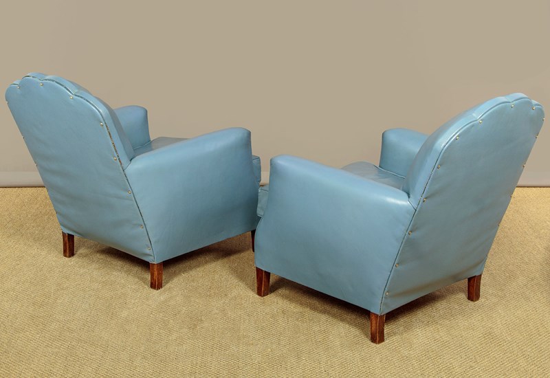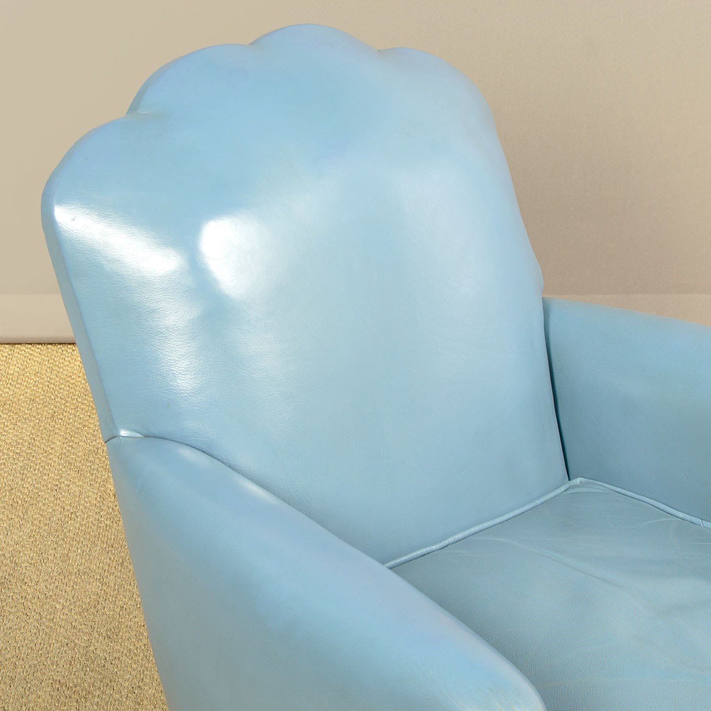 Delightful pair of Art Deco style leather easy armchairs c.1950. Low sloping sprung and padded backs with attractive cloud shaped tops. Over slim rounded arms and deep sprung seats (height 16½") with loose cushions. Upholstered in a sky blue leather with piped edges to the cushions and chromed studs at the rear. Raised on short tapering legs in stained beechwood. Very good condition, cleaned and waxed in our workshops.