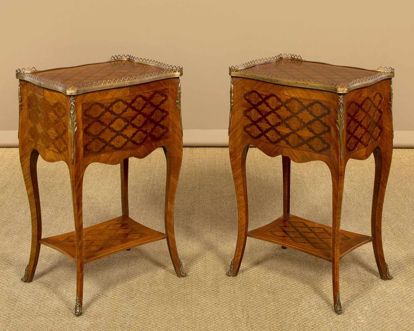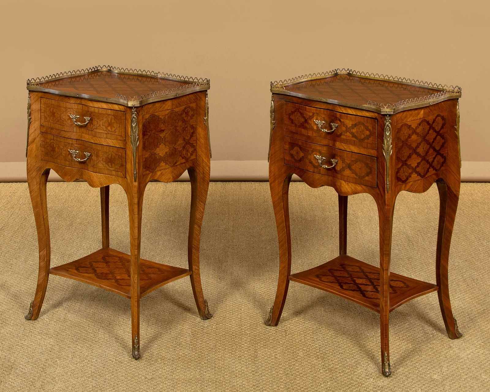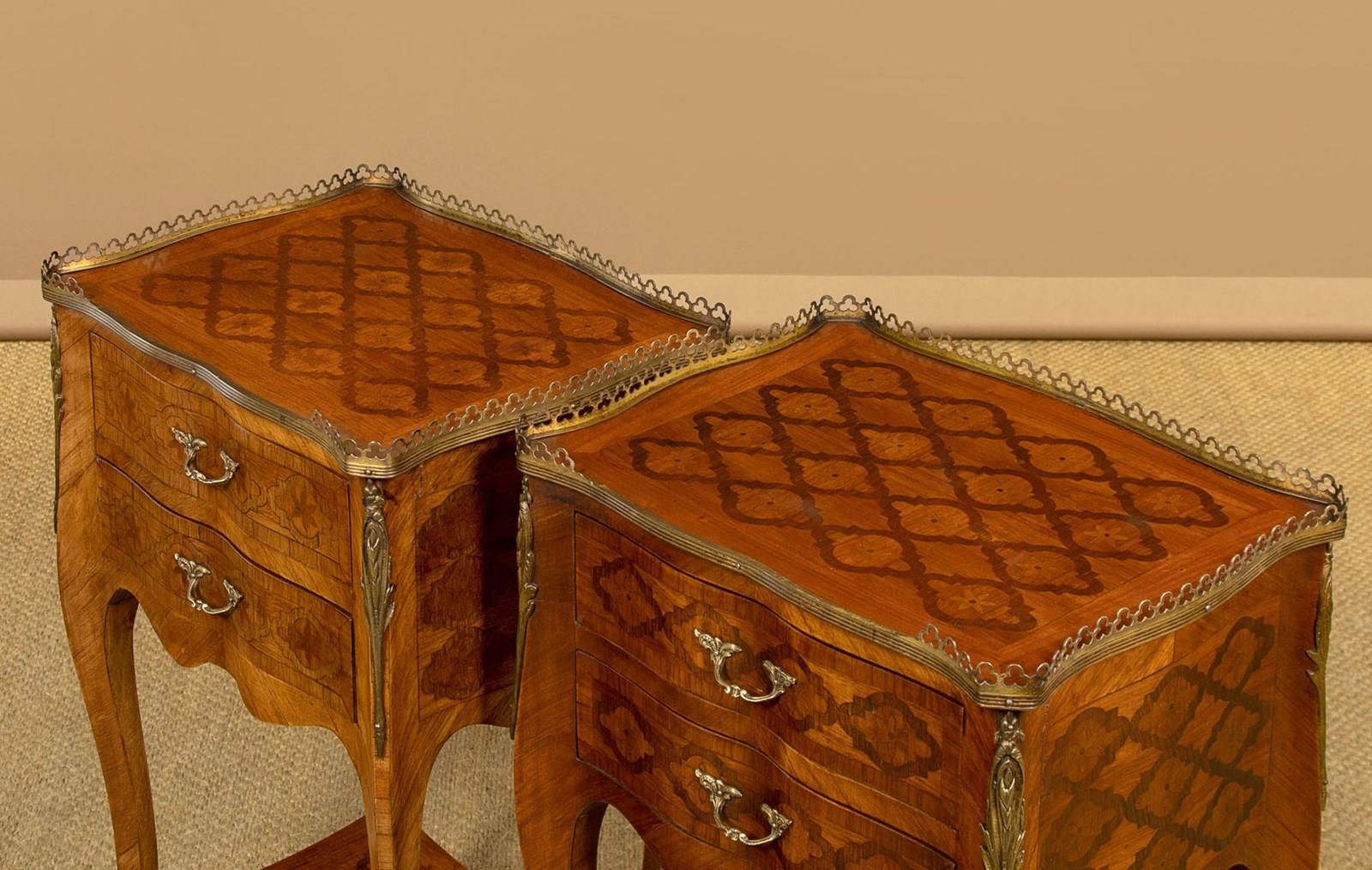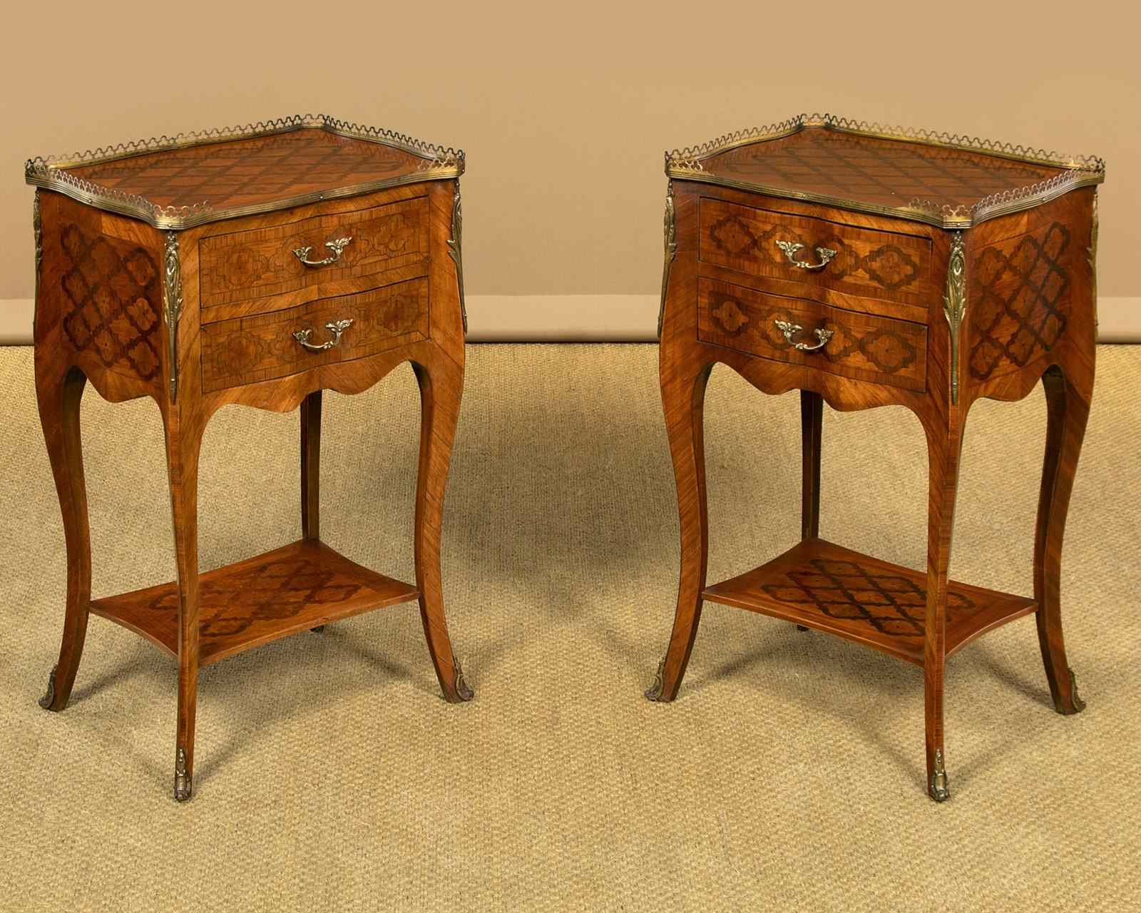 Very smart pair of French parquetry side tables c.1960. Ideal as bedsides or as lamp tables in a living room. Tops with quality trefoil pierced brass gallery to the sides and rear, over two small drawers. Serpentine shaped on all four sides and decorated all round with a repeated geometrical parquetry work pattern in contrasting woods inlaid into the walnut veneered ground. Decorative brass handles and brass mounts front and rear. Slim shaped legs joined with a useful low stretcher shelf, also with matching parquetry veneers, and with brass mounts to the feet. Very good colour and condition, cleaned and waxed in our workshops.