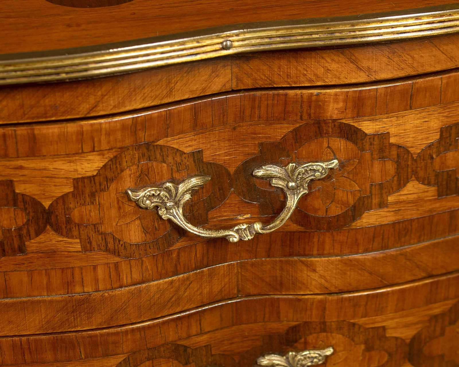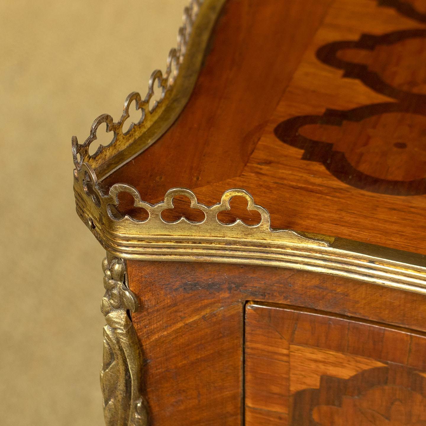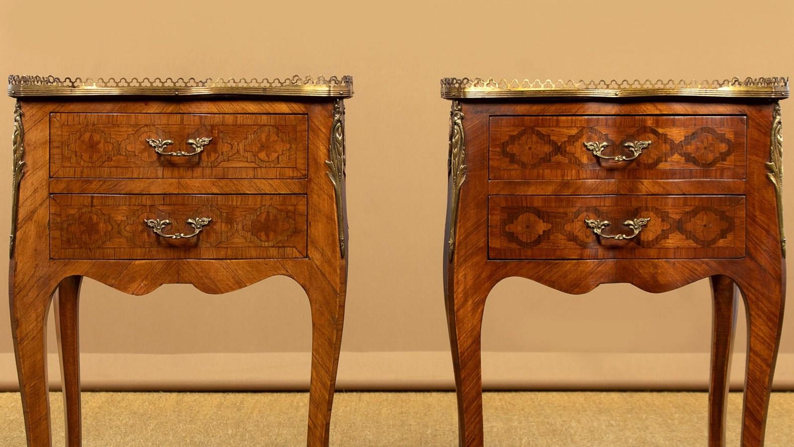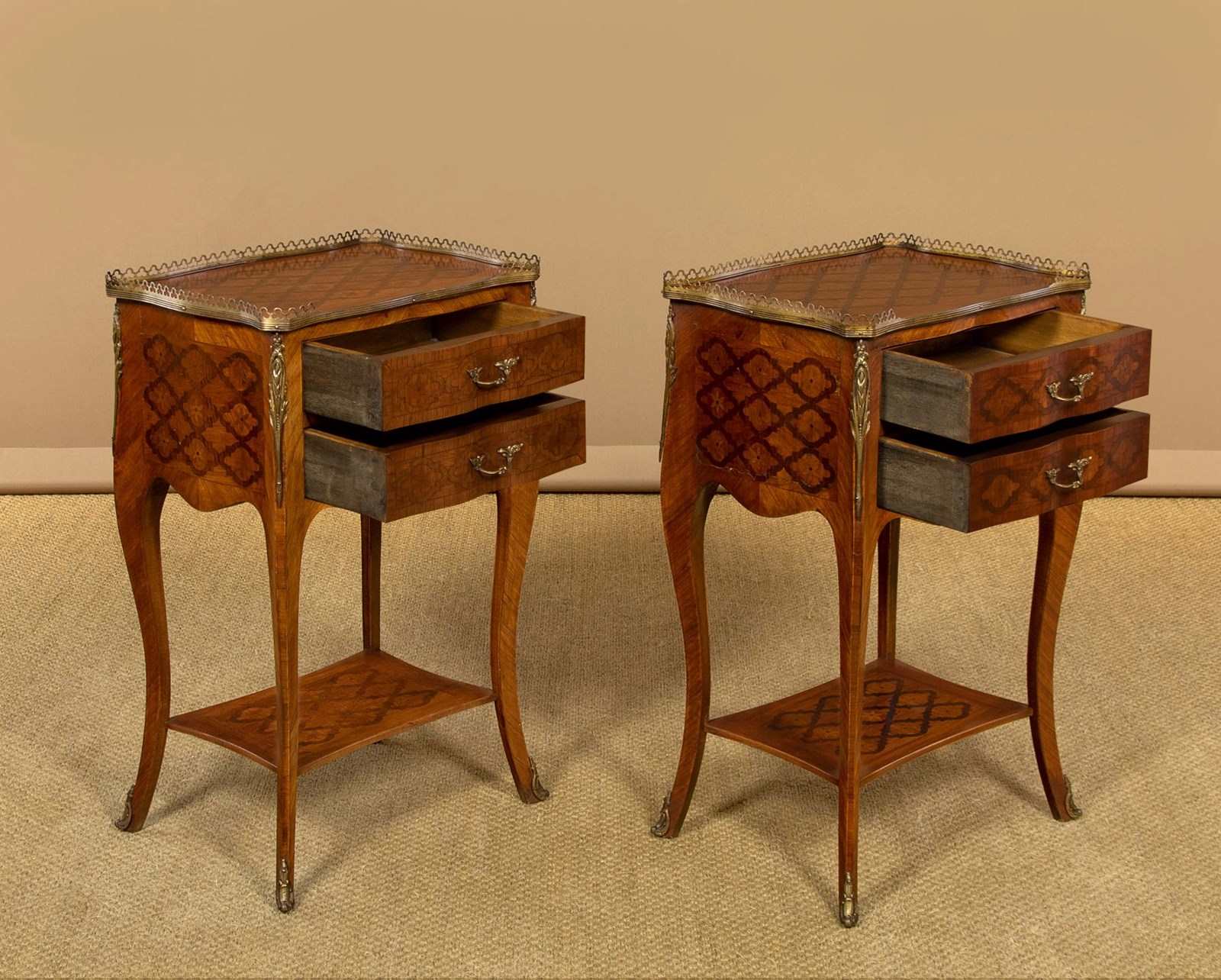 Very smart pair of French parquetry side tables c.1960. Ideal as bedsides or as lamp tables in a living room. Tops with quality trefoil pierced brass gallery to the sides and rear, over two small drawers. Serpentine shaped on all four sides and decorated all round with a repeated geometrical parquetry work pattern in contrasting woods inlaid into the walnut veneered ground. Decorative brass handles and brass mounts front and rear. Slim shaped legs joined with a useful low stretcher shelf, also with matching parquetry veneers, and with brass mounts to the feet. Very good colour and condition, cleaned and waxed in our workshops.