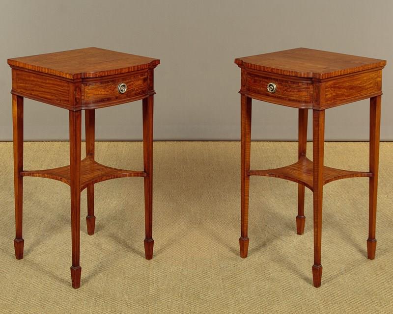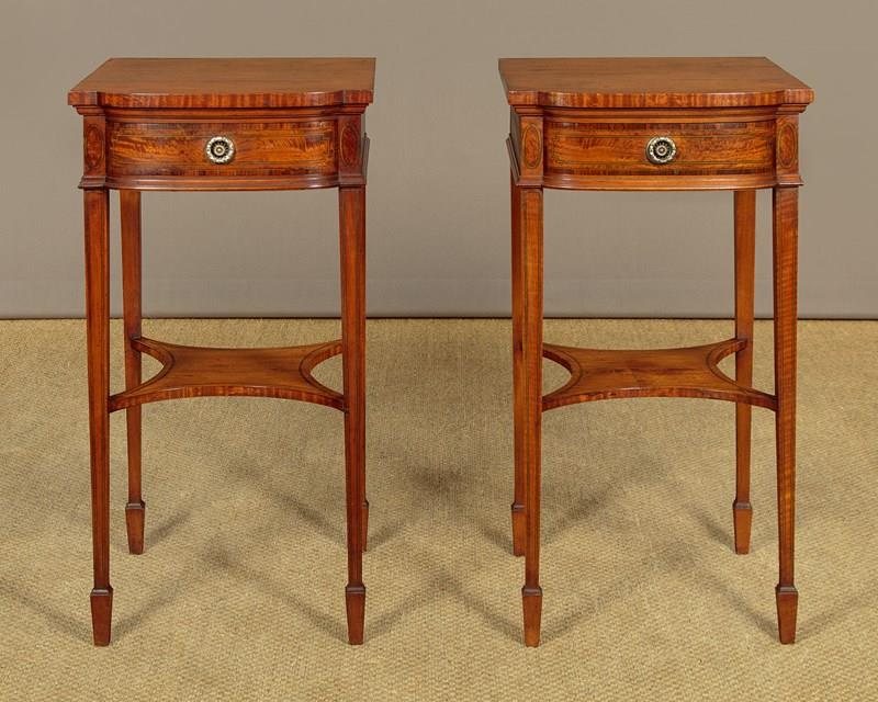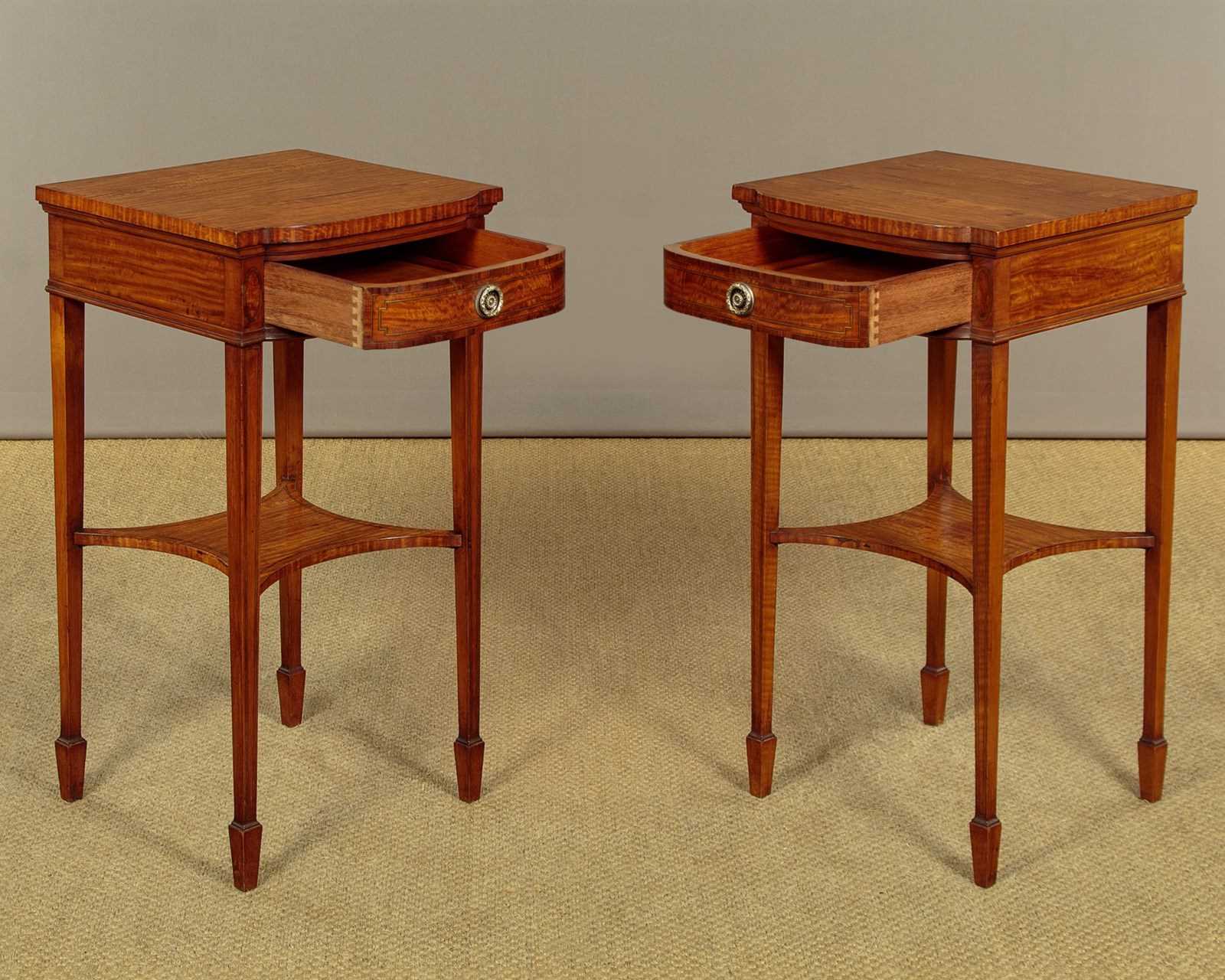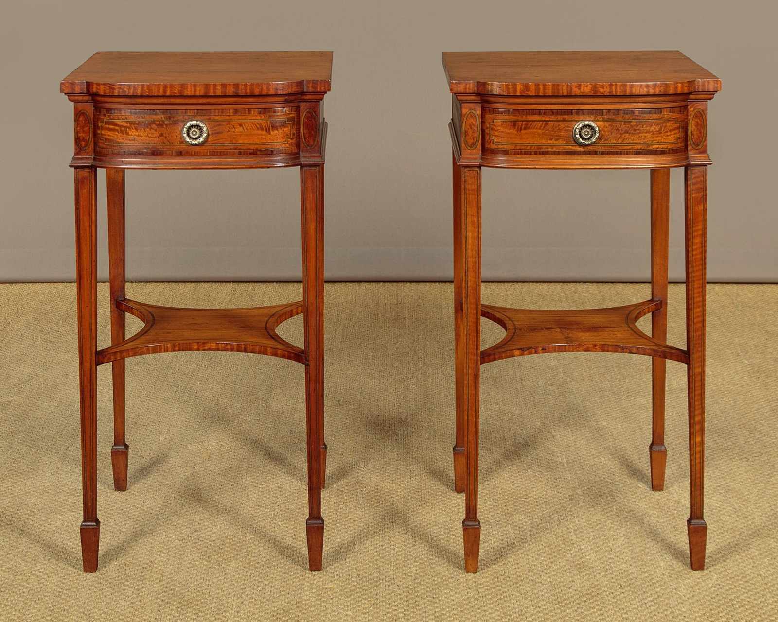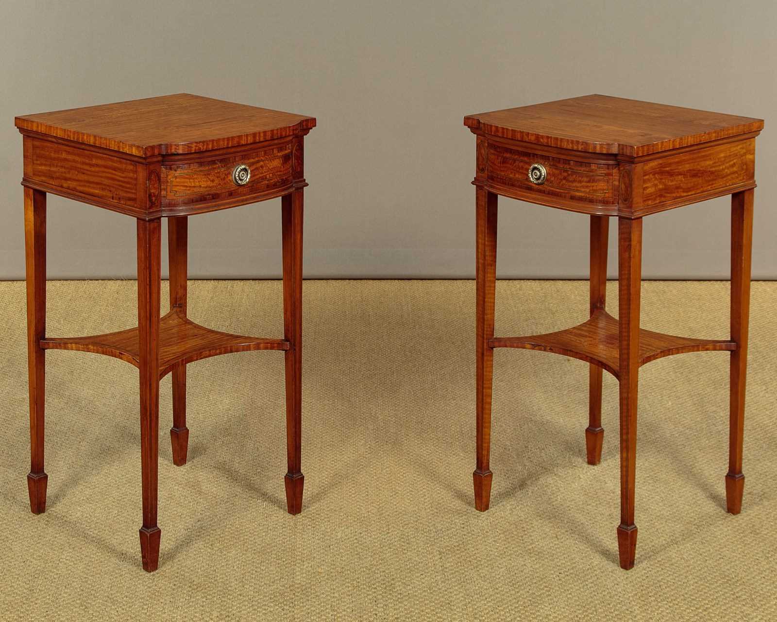 Elegant pair of quality satinwood bedside or lamp tables c.1910. Bow fronted tables, each with a single drawer. Sparkling satinwood veneers with fine inlaid stringing and crossbanded edges. Original brass handles with pierced back plates. Raised on slim tapering legs joined with a shaped stretcher shelf, front legs and shelf also in inlaid. Mahogany groundwork and drawer linings. Excellent colour and condition, restored cleaned and waxed in our workshops.