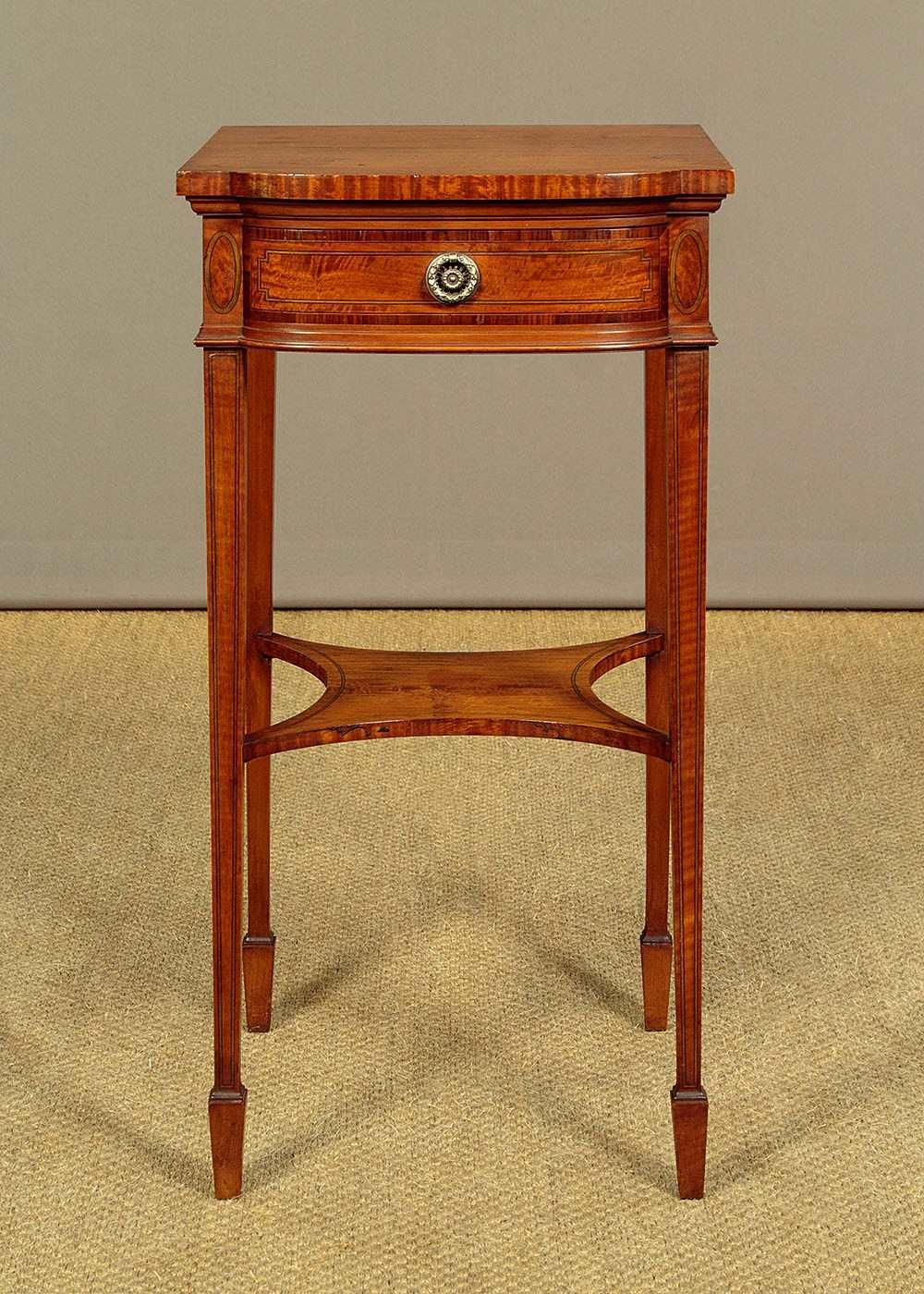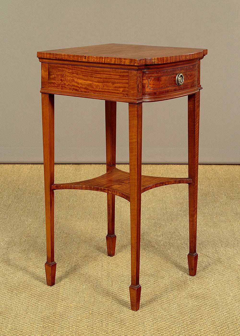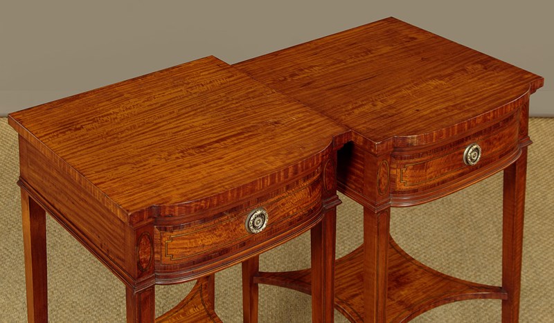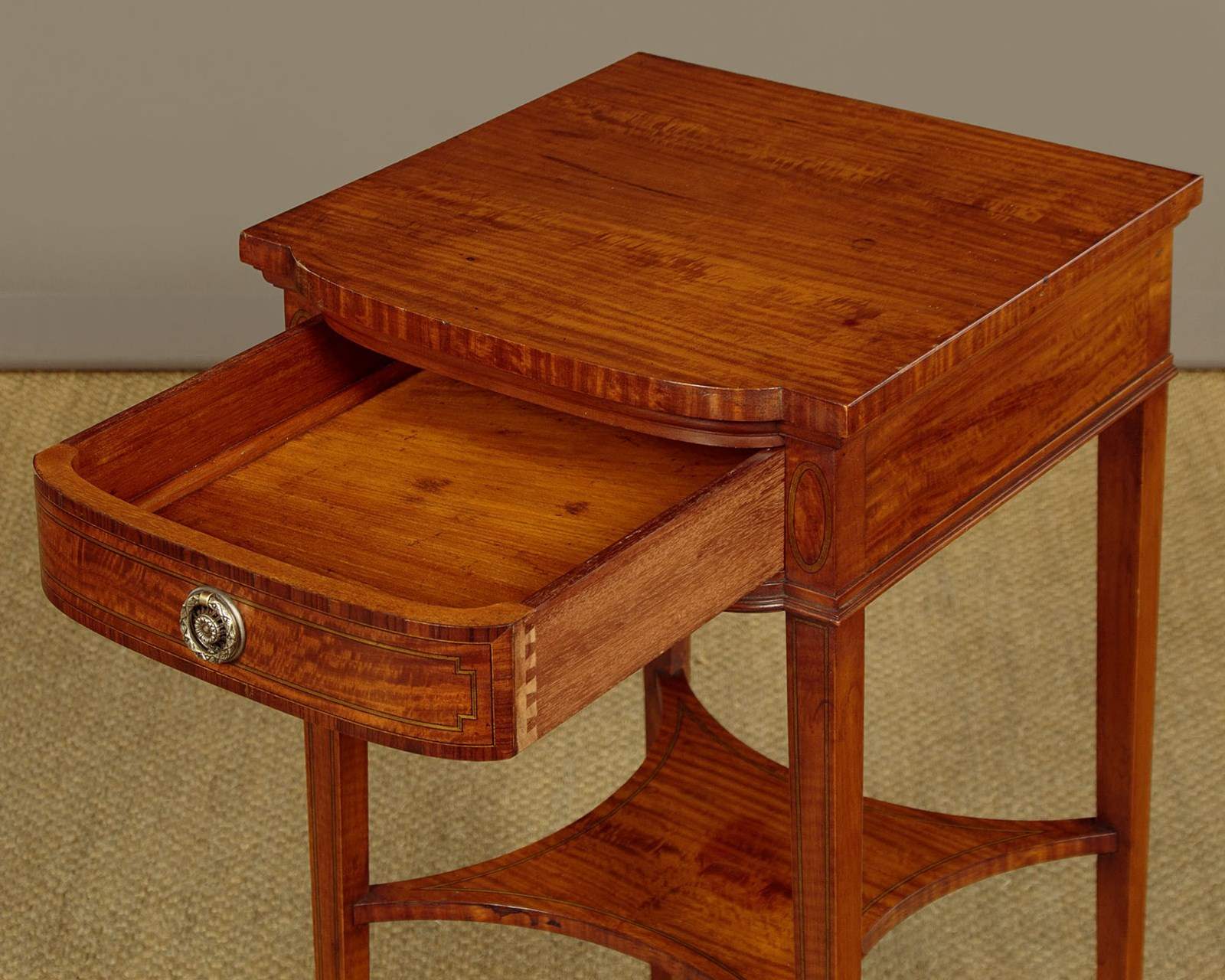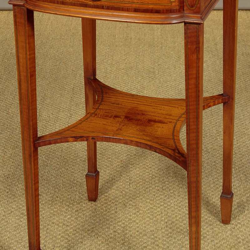Elegant pair of quality satinwood bedside or lamp tables c.1910. Bow fronted tables, each with a single drawer. Sparkling satinwood veneers with fine inlaid stringing and crossbanded edges. Original brass handles with pierced back plates. Raised on slim tapering legs joined with a shaped stretcher shelf, front legs and shelf also in inlaid. Mahogany groundwork and drawer linings. Excellent colour and condition, restored cleaned and waxed in our workshops.
