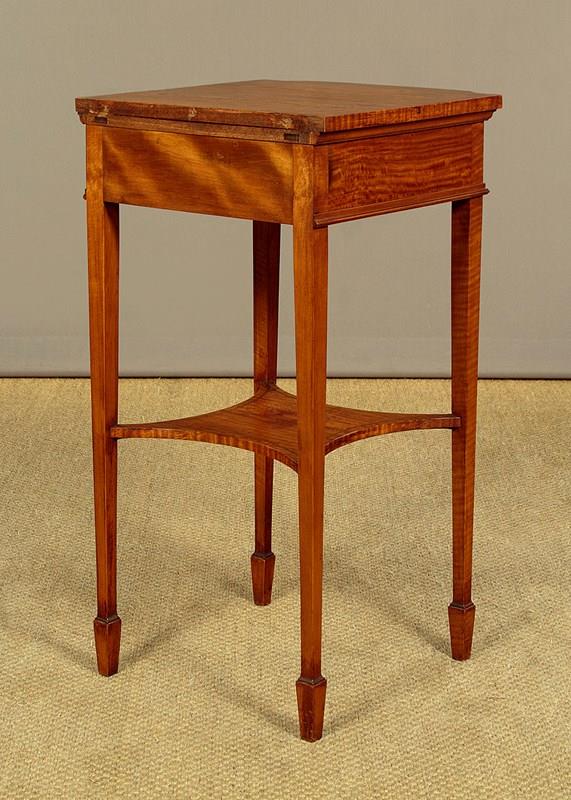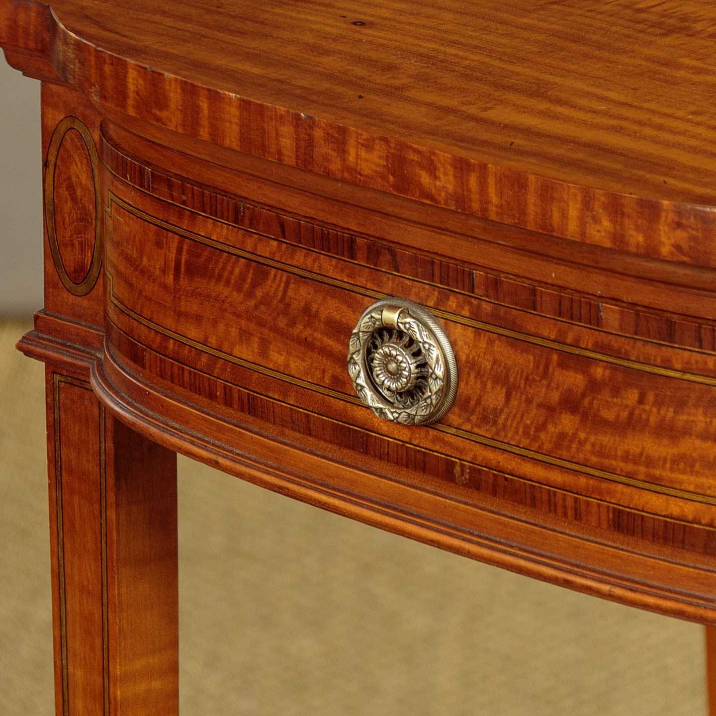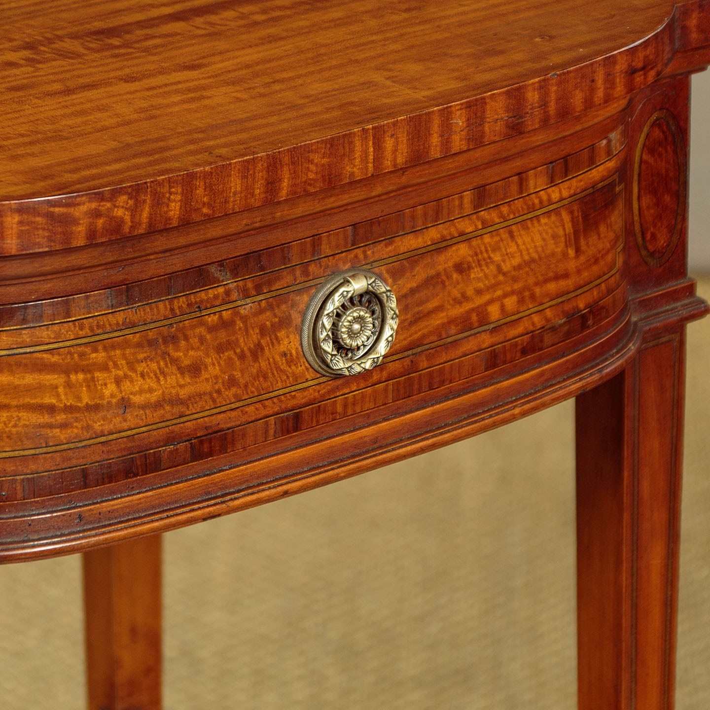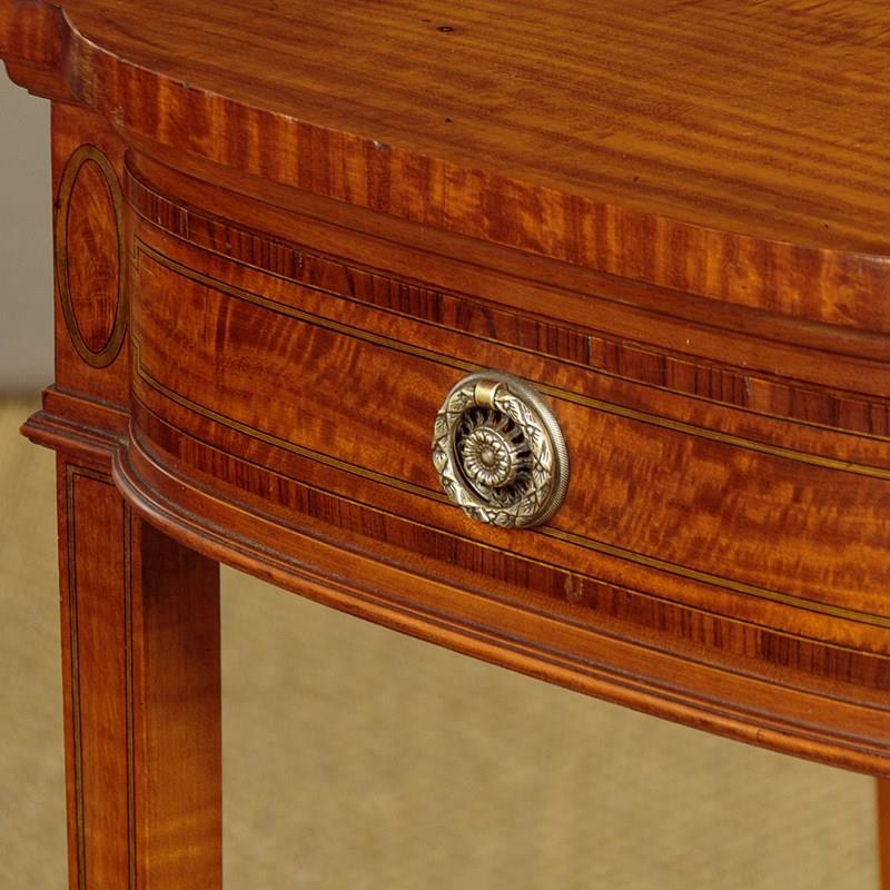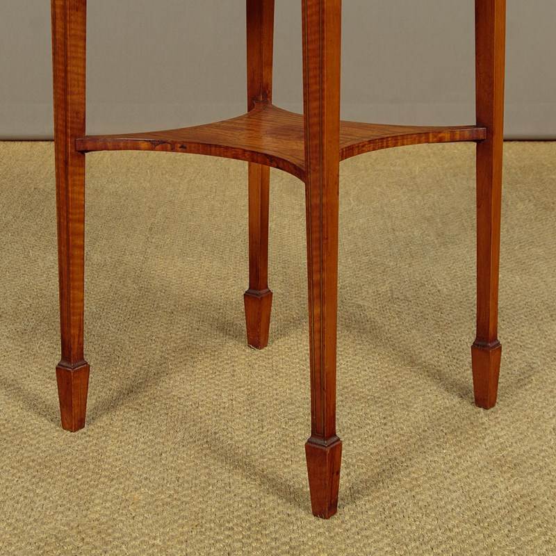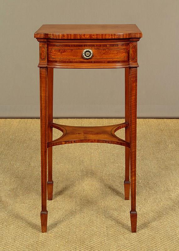 Elegant pair of quality satinwood bedside or lamp tables c.1910. Bow fronted tables, each with a single drawer. Sparkling satinwood veneers with fine inlaid stringing and crossbanded edges. Original brass handles with pierced back plates. Raised on slim tapering legs joined with a shaped stretcher shelf, front legs and shelf also in inlaid. Mahogany groundwork and drawer linings. Excellent colour and condition, restored cleaned and waxed in our workshops.