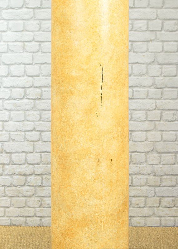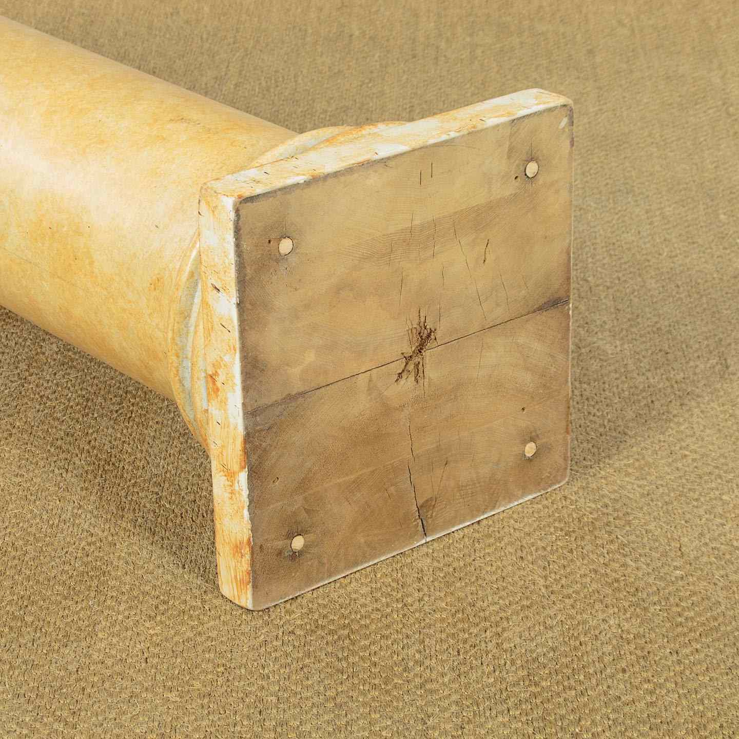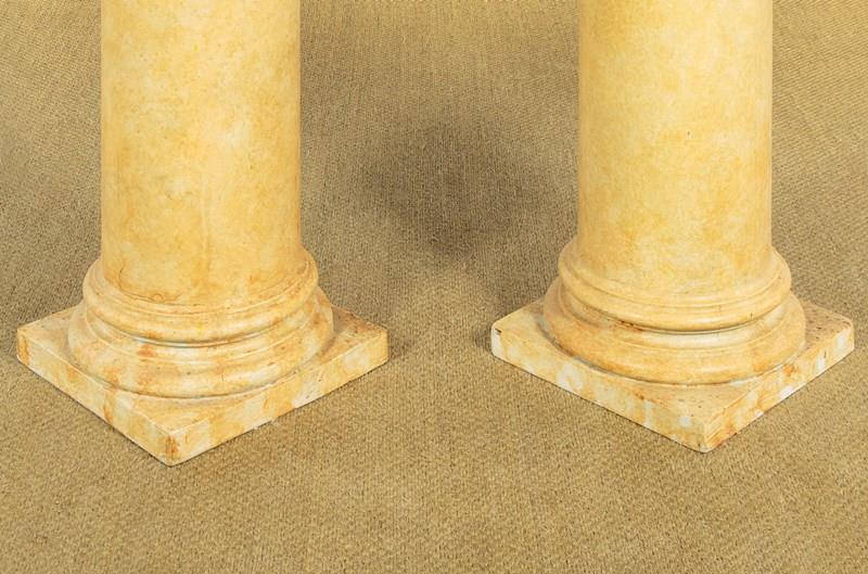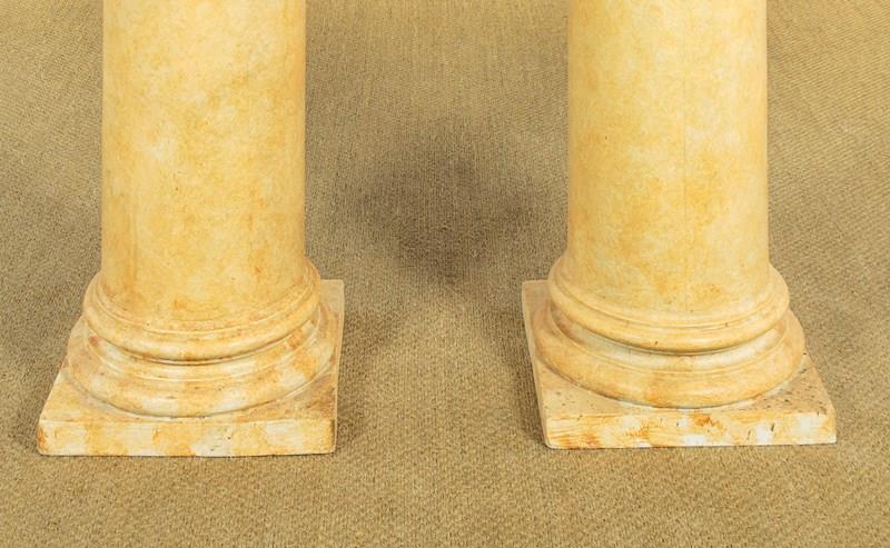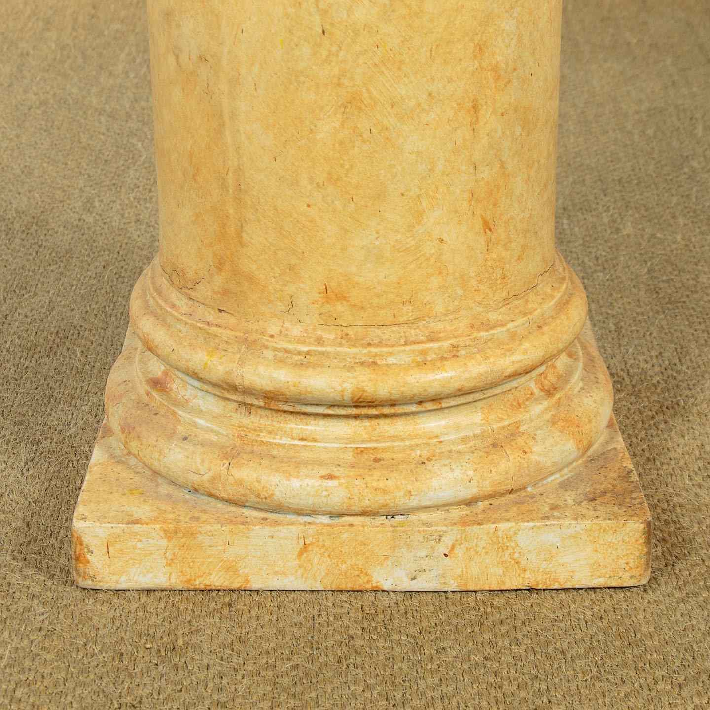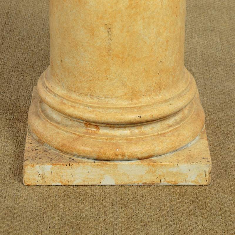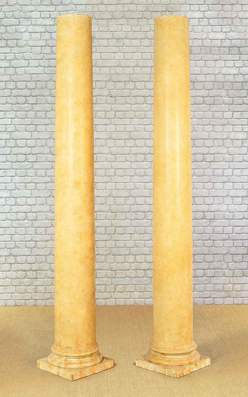 Impressive pair of tall painted wooden columns. Standing 89" tall. Constructed in timber, joined and shaped with slight tapering form (9" diameter at the tops) and moulded bases. Raised on 14" square plinths. Rag-rolled painted finish to resemble stone. Some minor shrinkage splits to both columns. Otherwise very good condition. Presented as found.