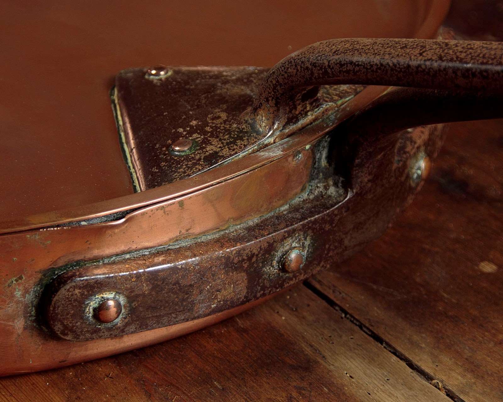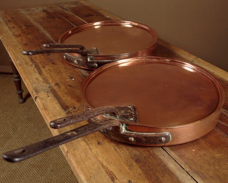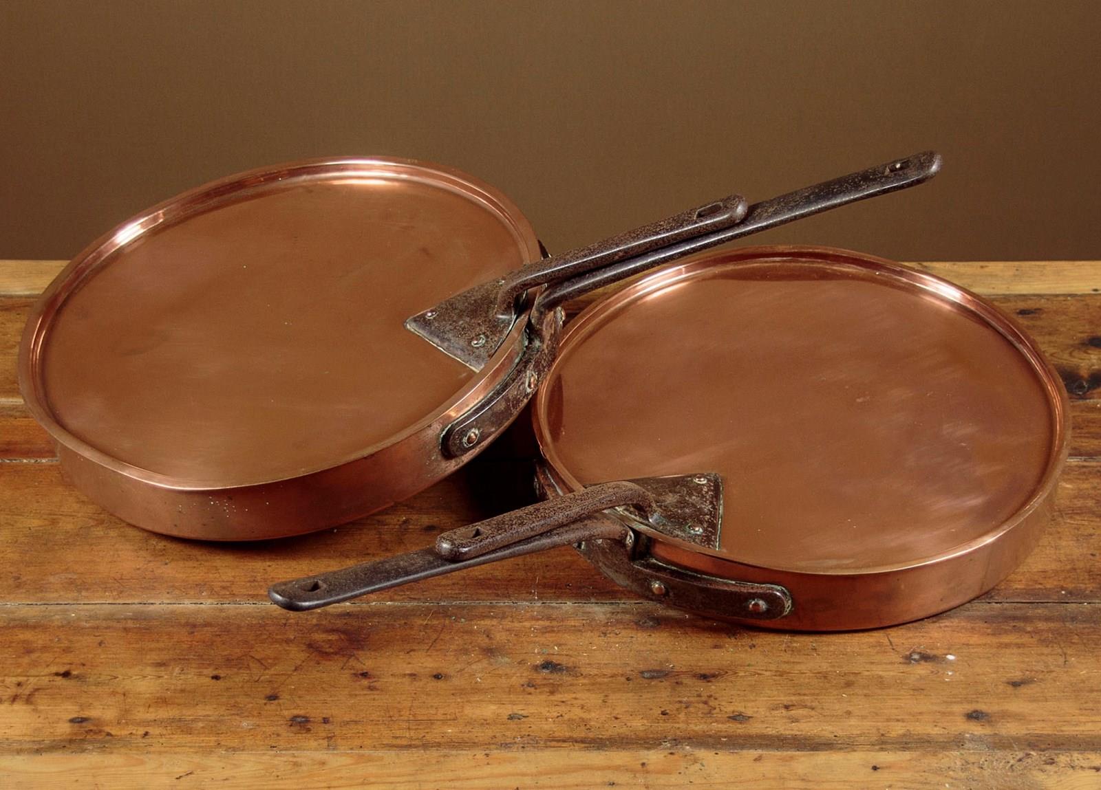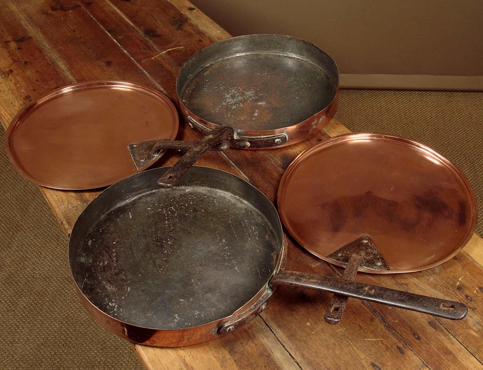 Beautiful pair of very large late 19th.c. copper sauté or frying pans with lids c.1870. 18" diameter pans (depth 3") with well fitting lids. Long heavy iron handles fitted with large copper rivets to the pans and lids, with holes for hanging. Very good original condition.