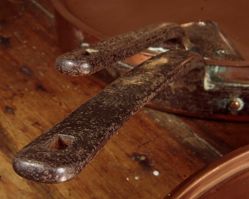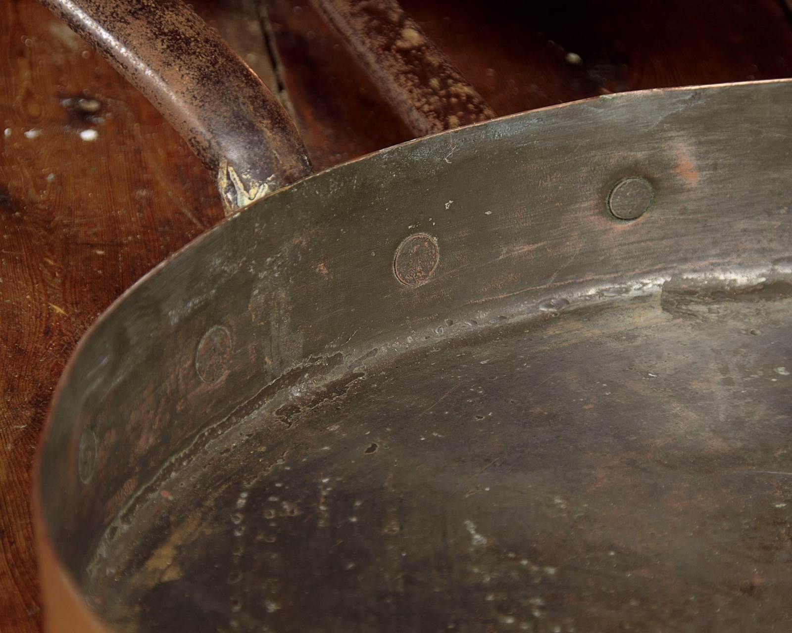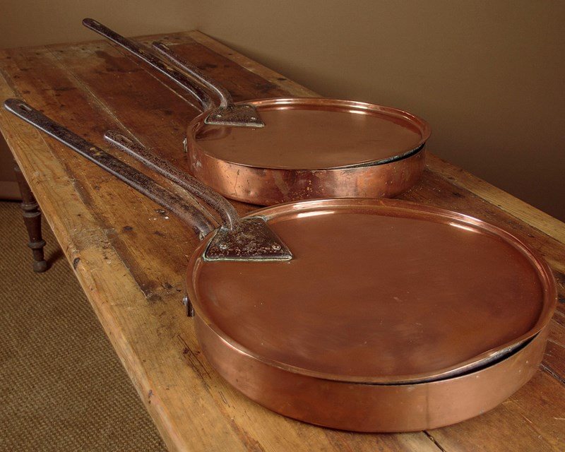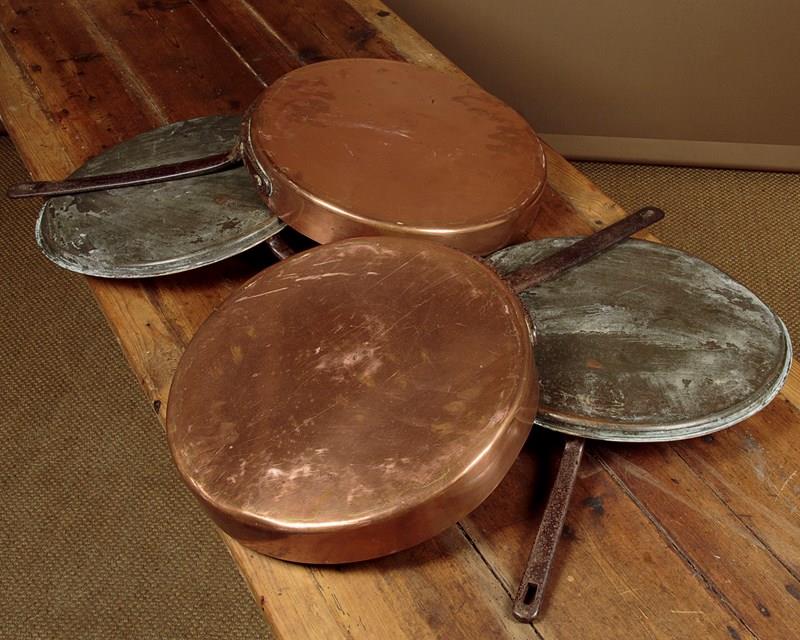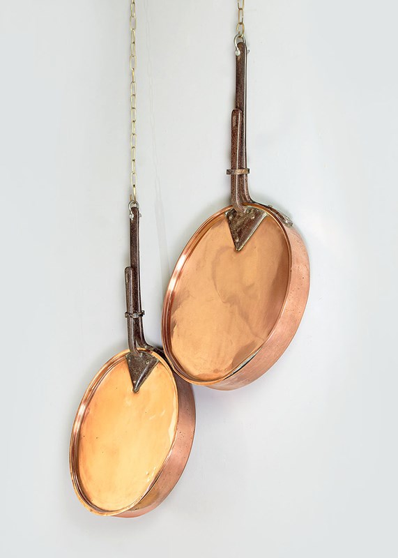 Beautiful pair of very large late 19th.c. copper sauté or frying pans with lids c.1870. 18" diameter pans (depth 3") with well fitting lids. Long heavy iron handles fitted with large copper rivets to the pans and lids, with holes for hanging. Very good original condition.