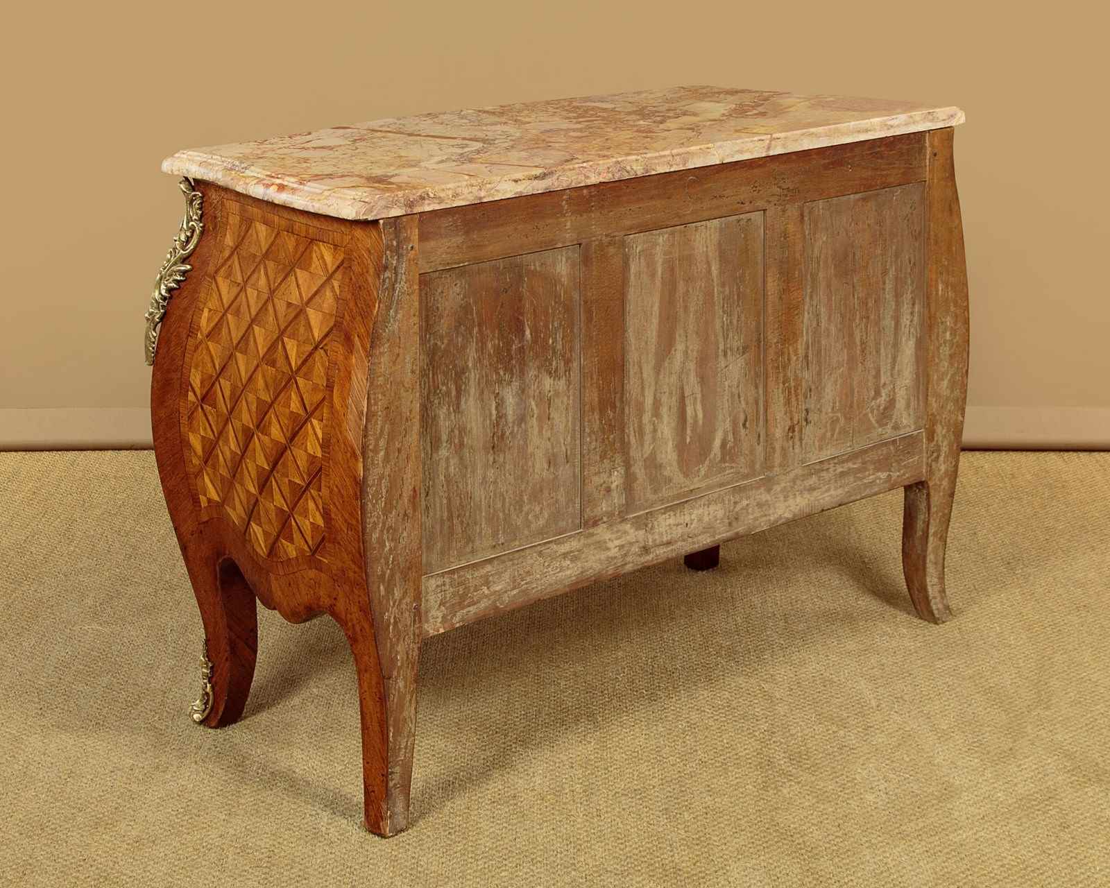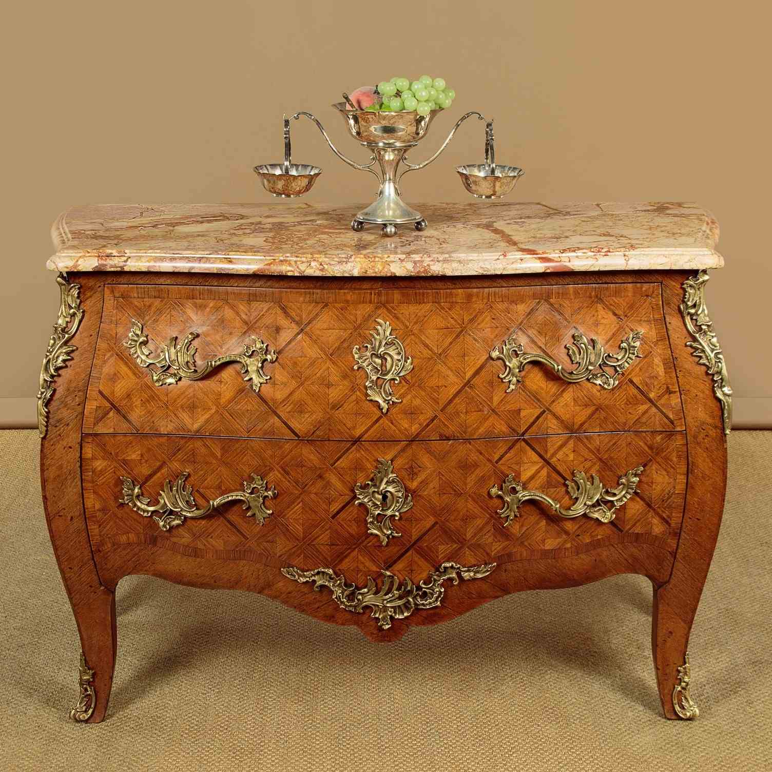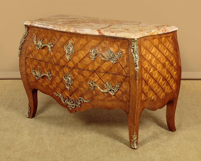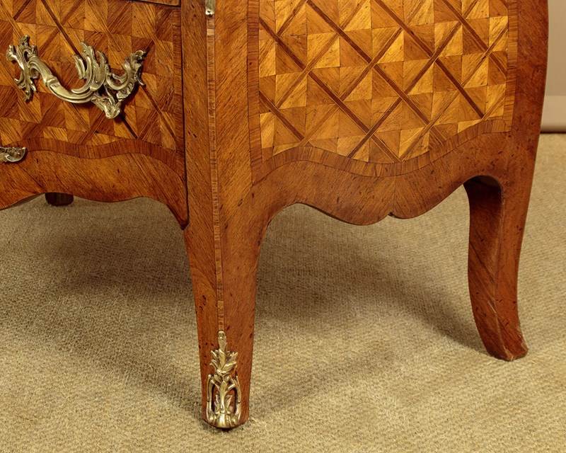 Good sized French Louis XV style marble top parquetry commode or chest of drawers c.1930. Beautifully figured 1¼" tick marble top with a serpentine shaped and moulded edge. Over a chest of two large drawers with bombe shaped front and sides featuring superb parquetry work veneers laid to create a striking geometric pattern within a crossbanded surround. Large and well cast pierced brass handles and escutcheon plates to the drawer fronts, pierced brass mounts to the shoulders and at the centre of the apron to the bottom edge of the lower drawer front. Shaped legs with further brass mounts to the front feet. Oak drawer linings. Excellent colour and condition, cleaned and waxed in our workshops.