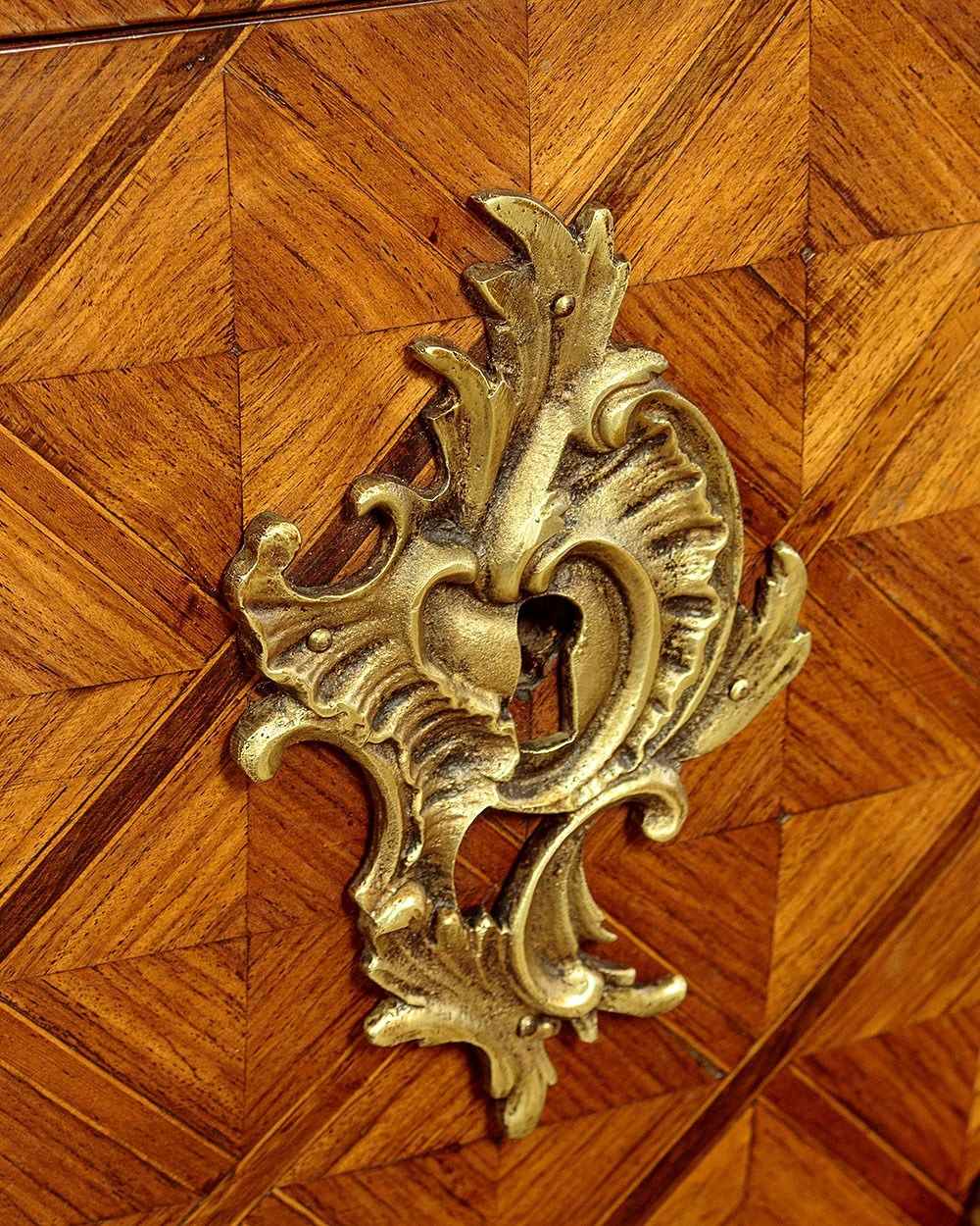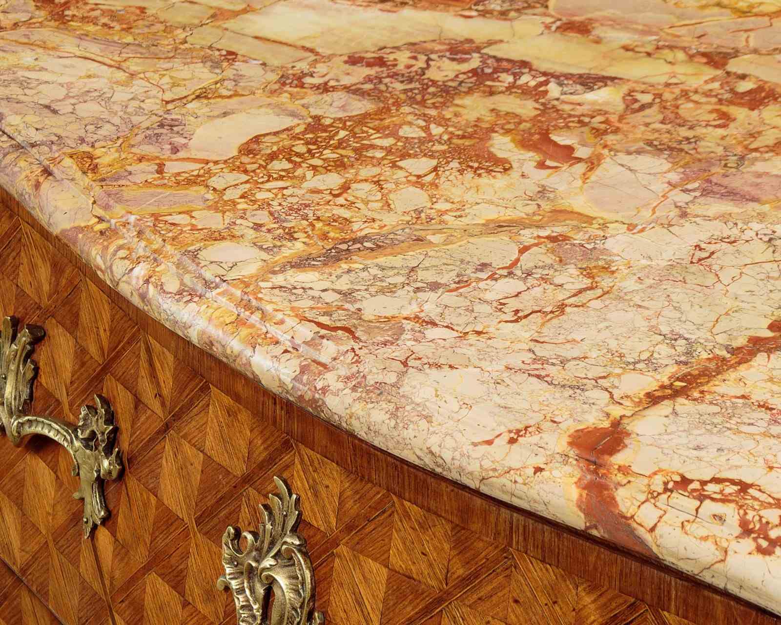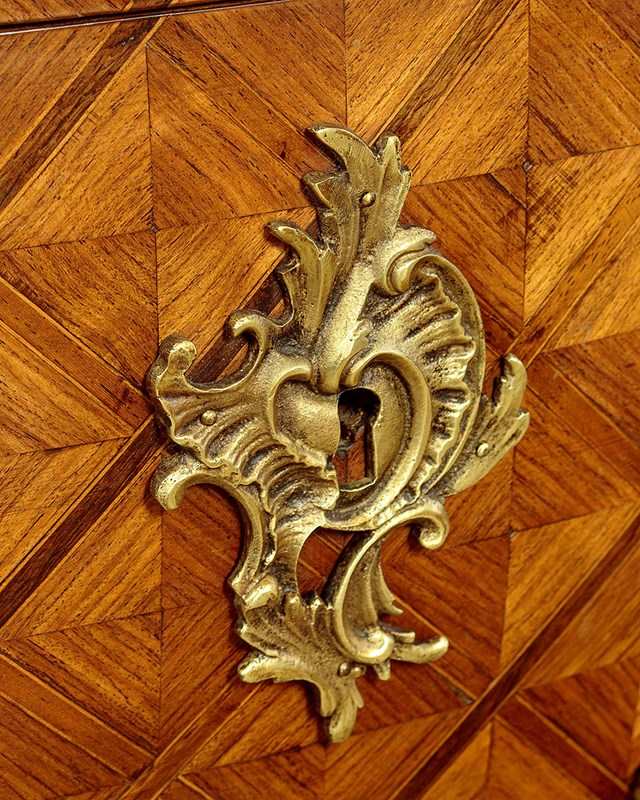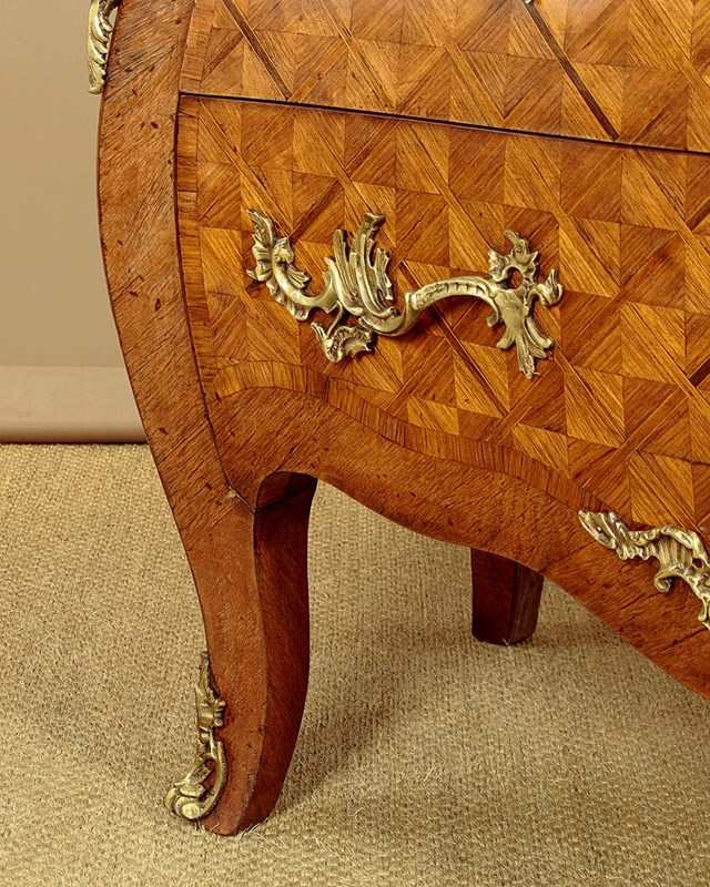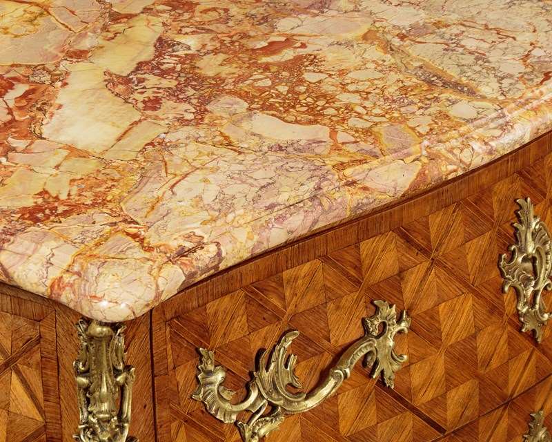 Good sized French Louis XV style marble top parquetry commode or chest of drawers c.1930. Beautifully figured 1¼" tick marble top with a serpentine shaped and moulded edge. Over a chest of two large drawers with bombe shaped front and sides featuring superb parquetry work veneers laid to create a striking geometric pattern within a crossbanded surround. Large and well cast pierced brass handles and escutcheon plates to the drawer fronts, pierced brass mounts to the shoulders and at the centre of the apron to the bottom edge of the lower drawer front. Shaped legs with further brass mounts to the front feet. Oak drawer linings. Excellent colour and condition, cleaned and waxed in our workshops.