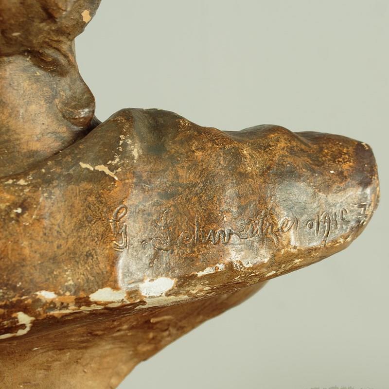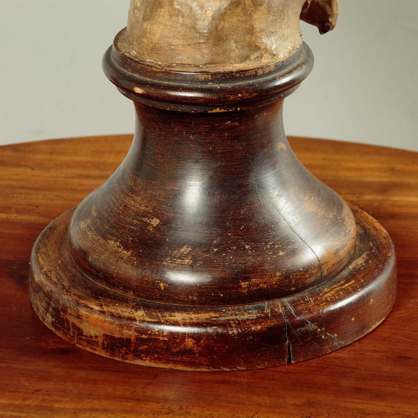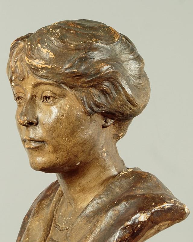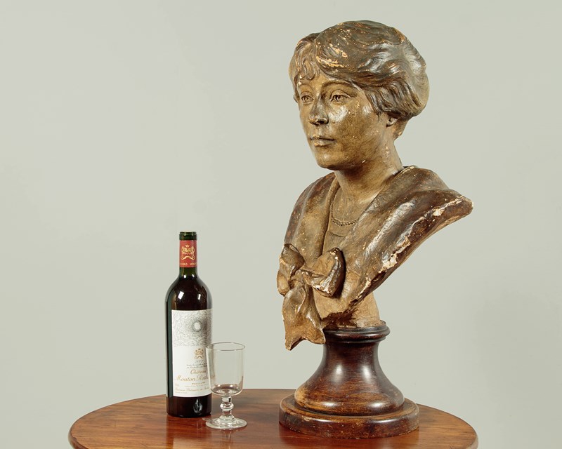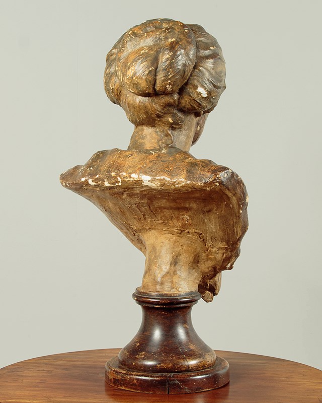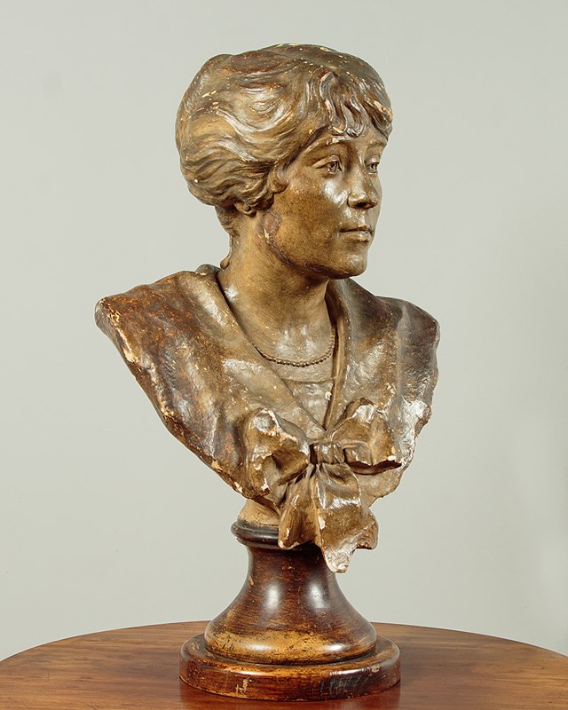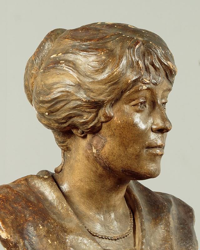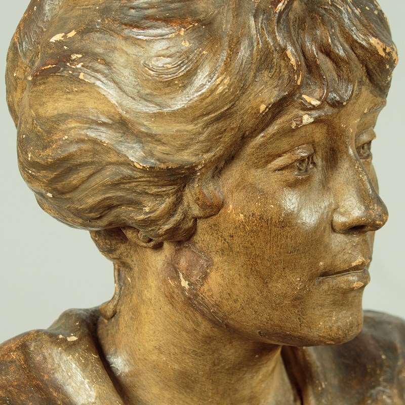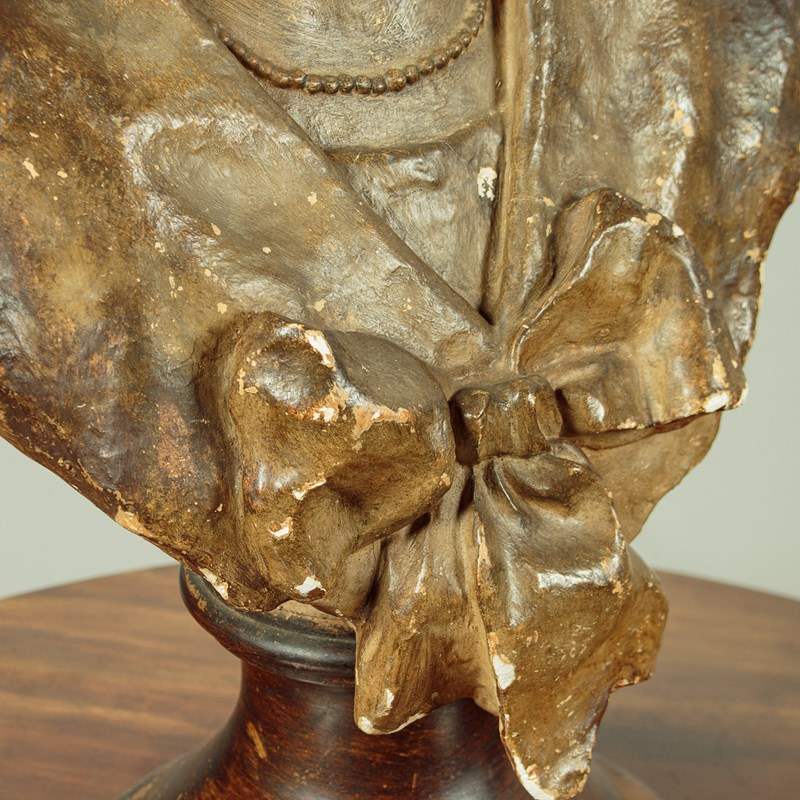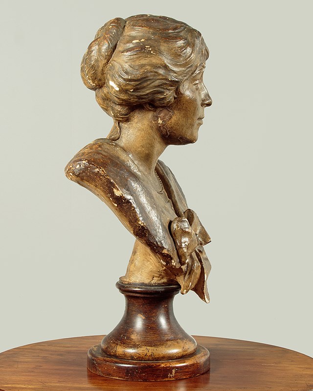 Good sized painter plaster bust of a lady dated 1918. Head and shoulders length bust of a smartly dressed lady with her hair in a bun, wearing a necklace and with a large bow at the centre of the neckline of her dress. Modelled in plaster with a painted finish. Signed in the plaster at the rear G. Schweitzer, dated 1918 and with the number 7. On a turned wooden plinth (8" diameter at the base). Some obvious wear to the finish, otherwise good condition.