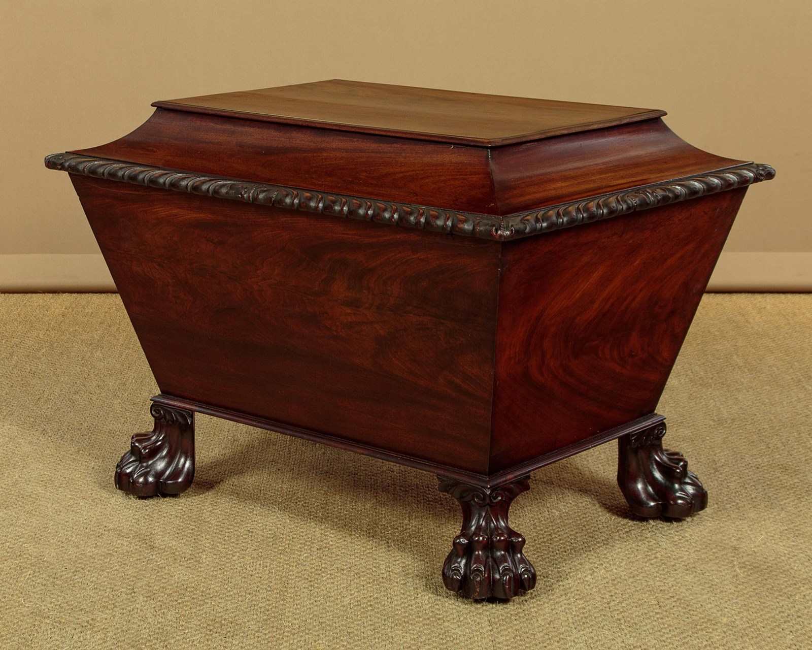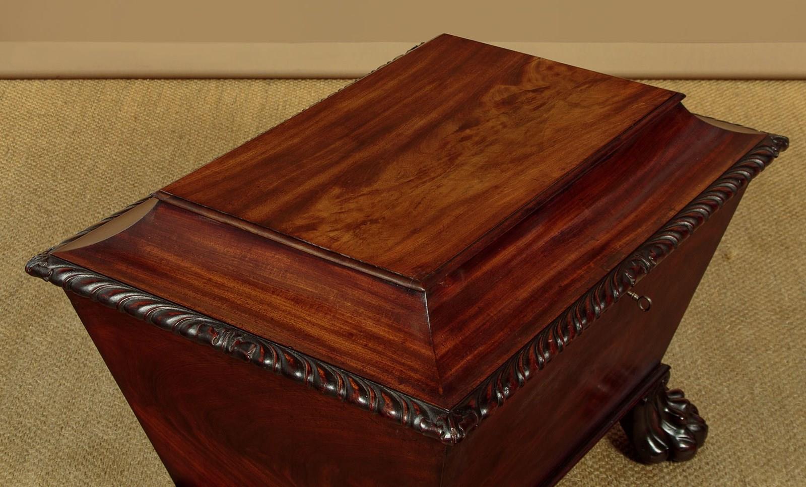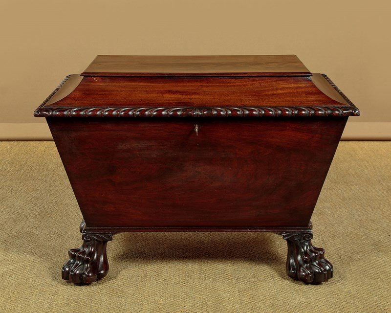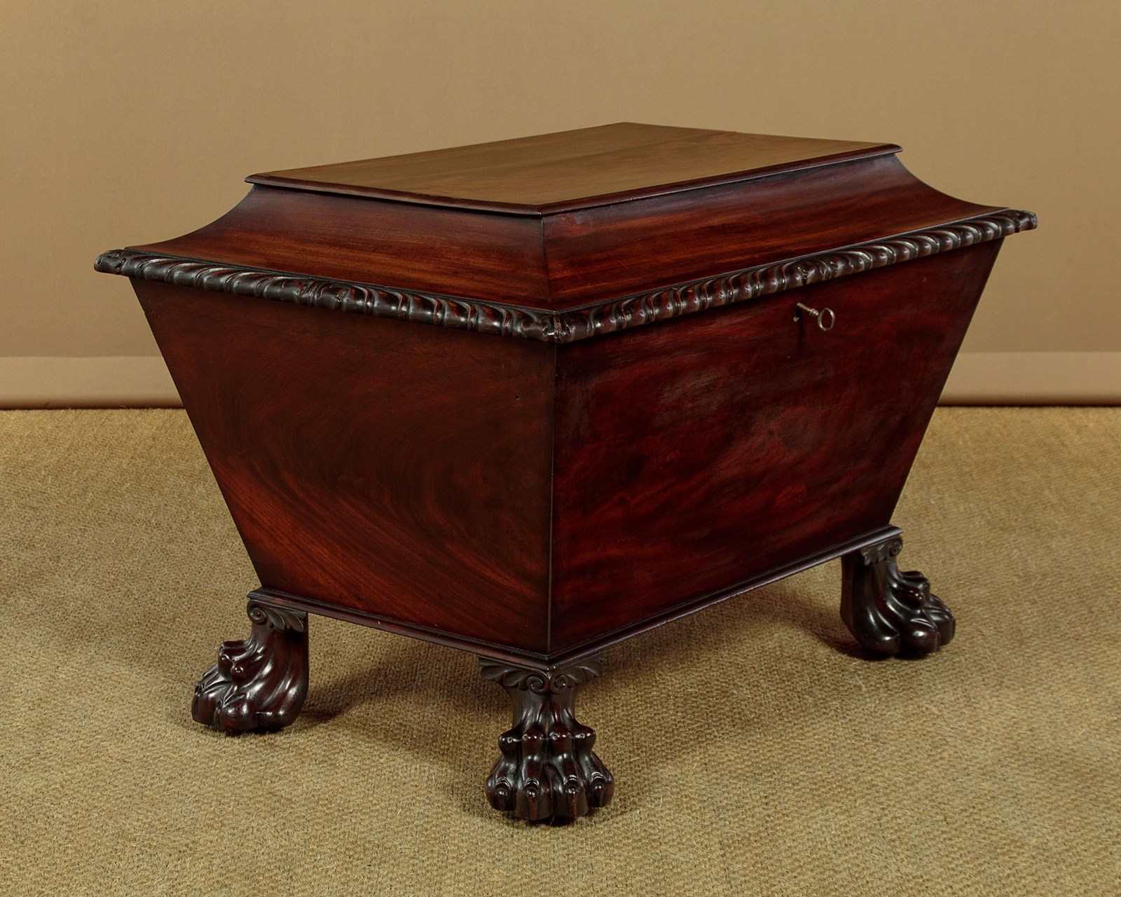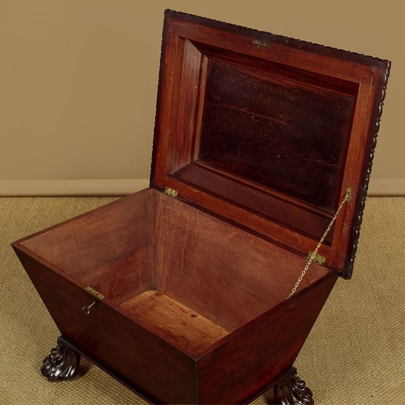 Splendid English Regency mahogany cellarette c.1830. Of Classical sarcophagus form with a useful flat (rather than angled) top to make a low side table. Well figured mahogany veneers on solid mahogany groundwork and with a carved gadroon edge to the lid. Note the lovely carved acanthus leaf detail at the corners and above the key hole. Crisp moulded trim around the base and raised on large claw feet with the original brass castors recessed below. Very good colour and condition, cleaned and waxed in our workshops. Original lock and key.