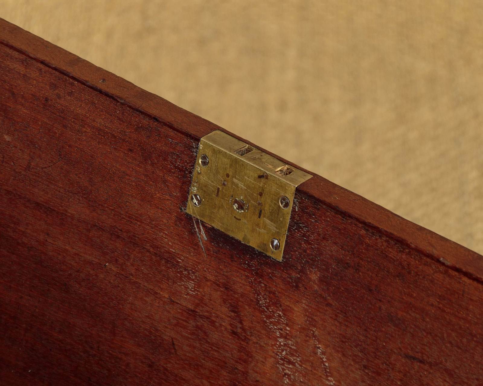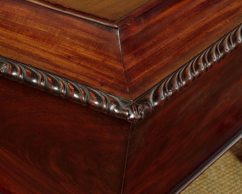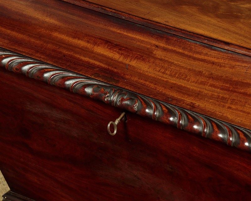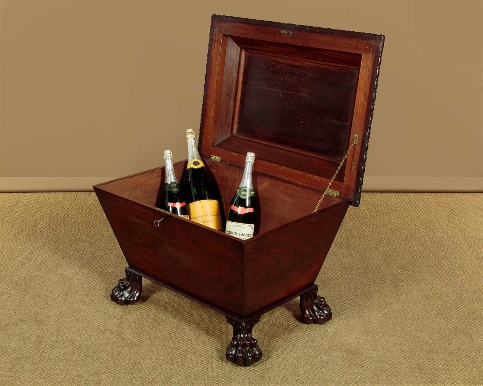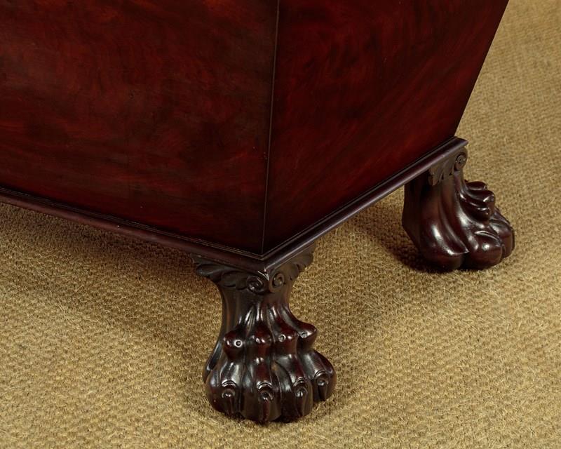 Splendid English Regency mahogany cellarette c.1830. Of Classical sarcophagus form with a useful flat (rather than angled) top to make a low side table. Well figured mahogany veneers on solid mahogany groundwork and with a carved gadroon edge to the lid. Note the lovely carved acanthus leaf detail at the corners and above the key hole. Crisp moulded trim around the base and raised on large claw feet with the original brass castors recessed below. Very good colour and condition, cleaned and waxed in our workshops. Original lock and key.