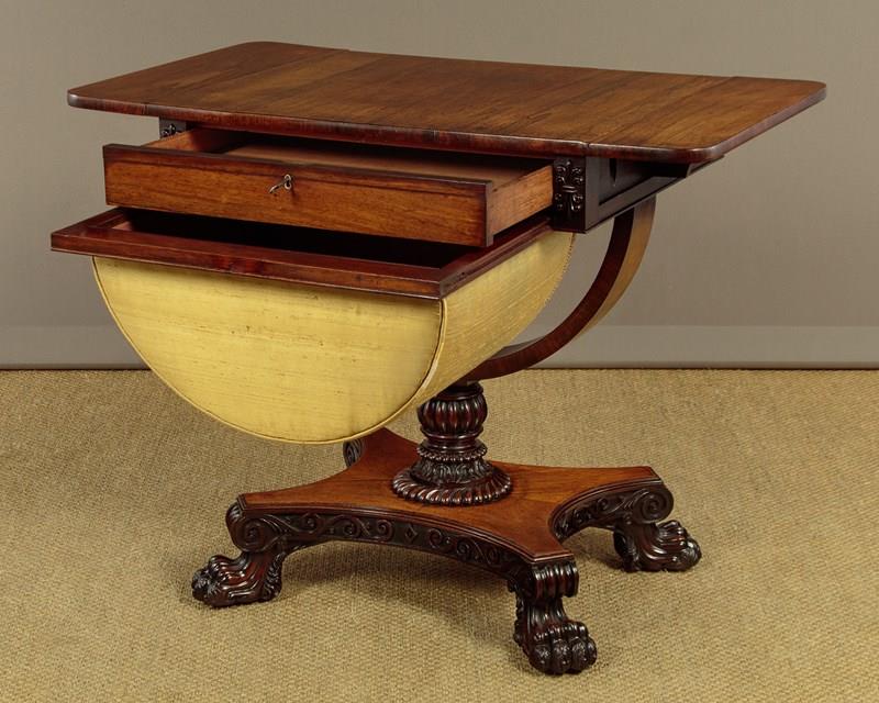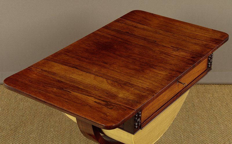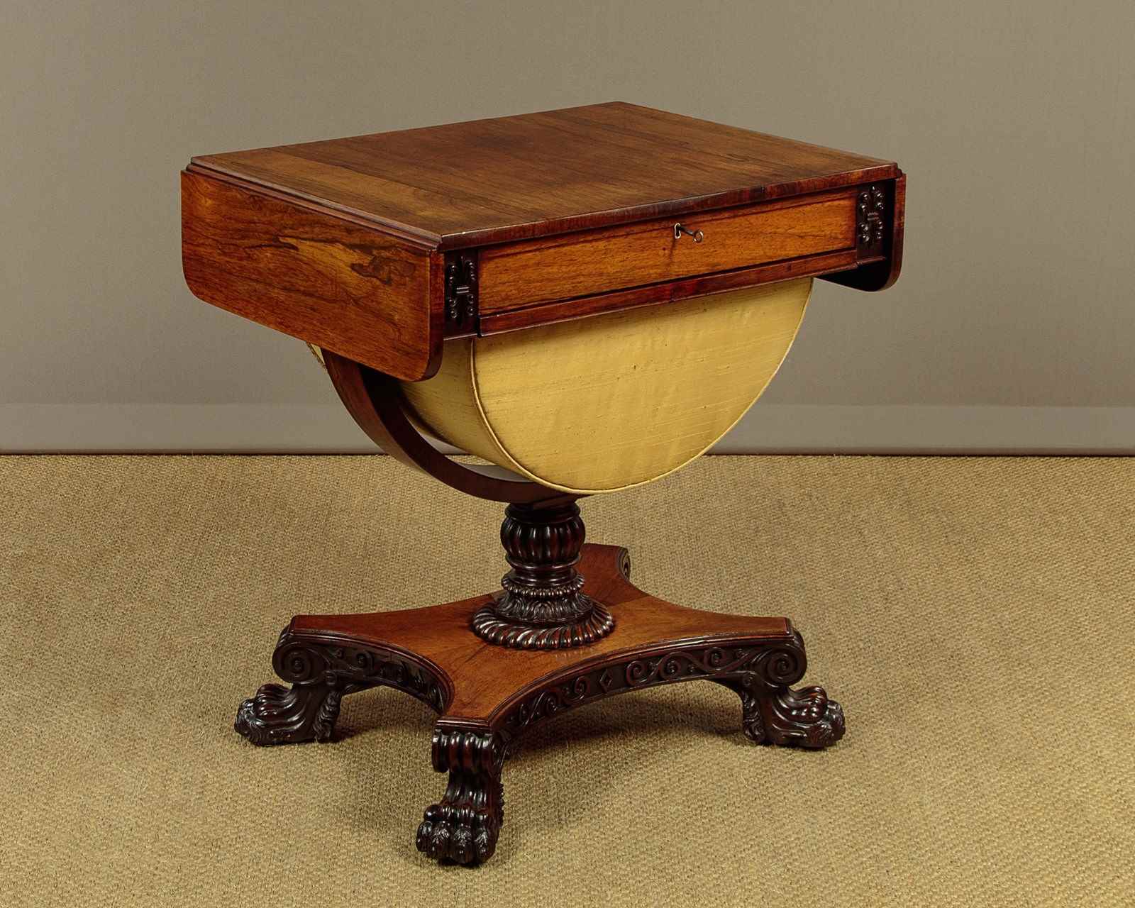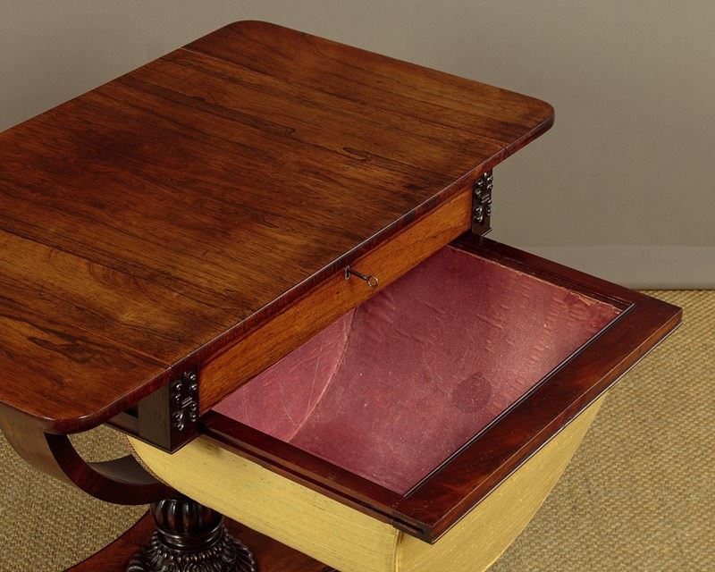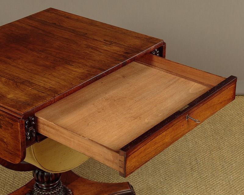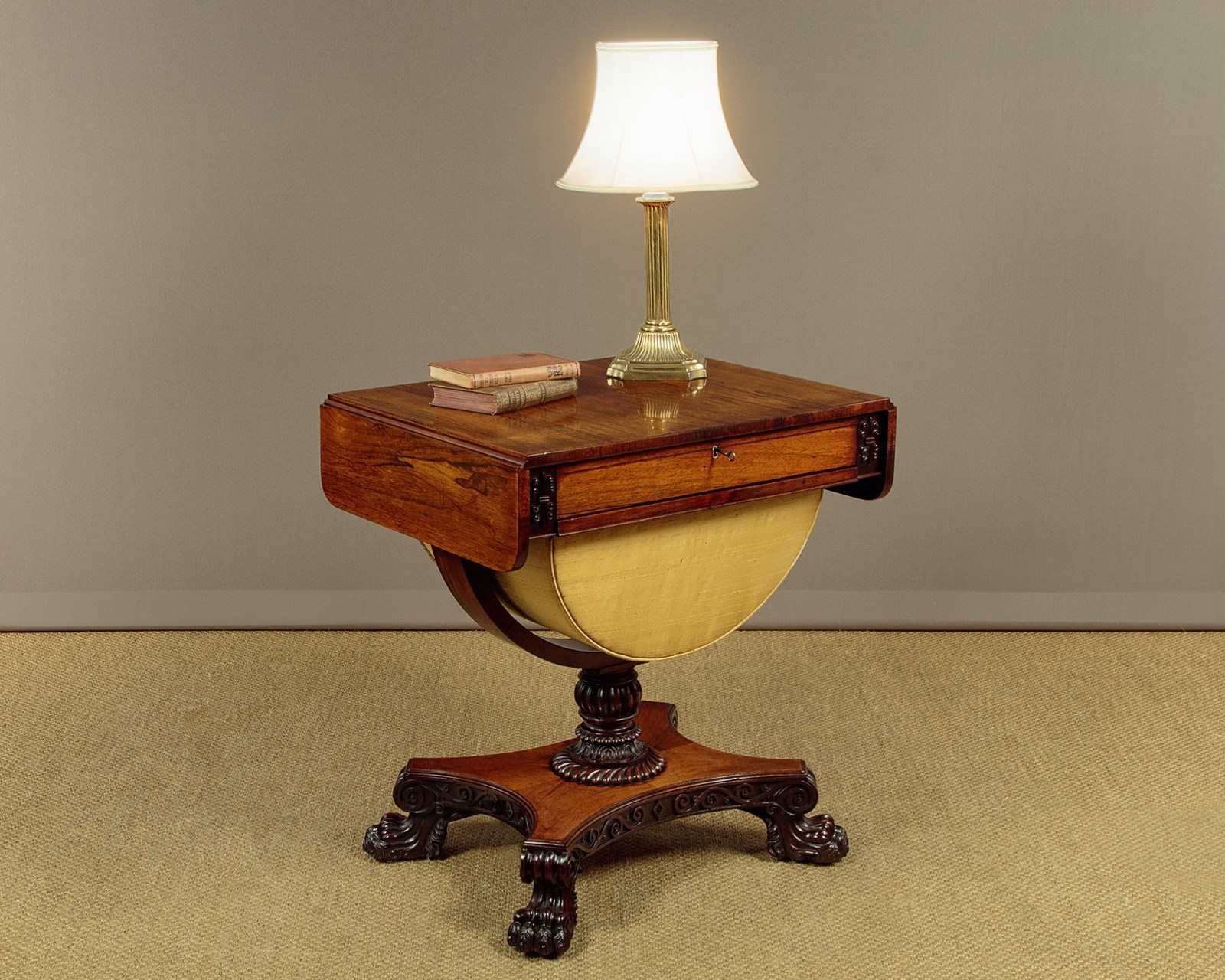 Mid 19th.c. rosewood Pembroke work table c.1840. Rosewood veneered top with two short folding leaves held on hinged loafers. Over a slim mahogany lined and lockable upper drawer and a large half-moon shaped basket drawer below, covered in yellow silk, originally intended to hold a lady's sewing or needlework. Note the little anthemion carvings either side of the upper drawer which repeated on the rear face of the table. Supported on a semi-circular yoke, also rosewood veneered, and a fine turned carved and segmented column with a gadrooned collar. Raised on a shaped plinth with quarter veneers and moulded edges over a carved frieze to each side and massive carved claw feet at the corners. Excellent colour and condition, cleaned and waxed in our workshops. Key supplied.