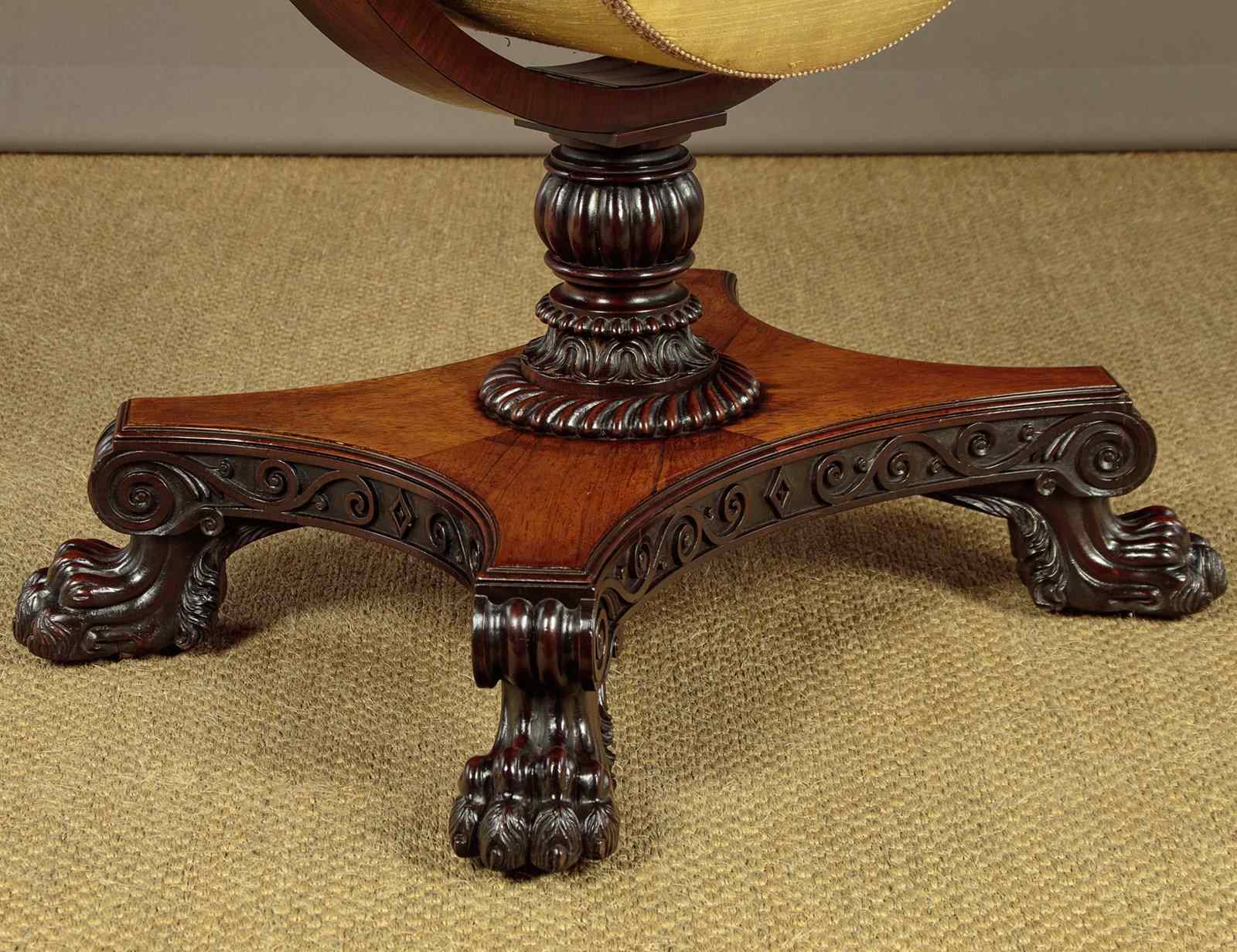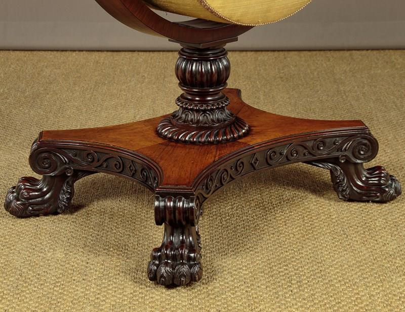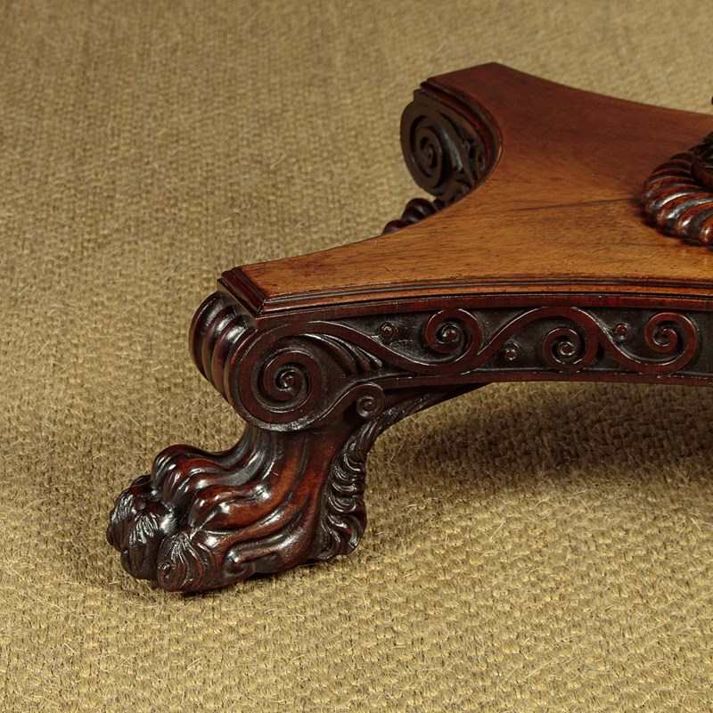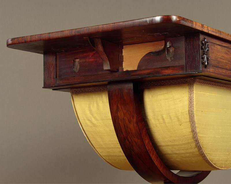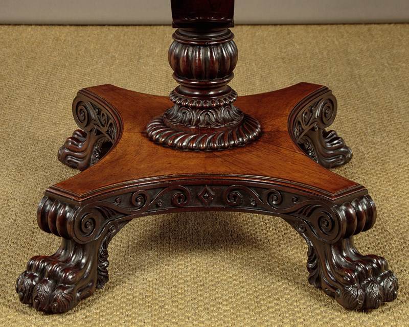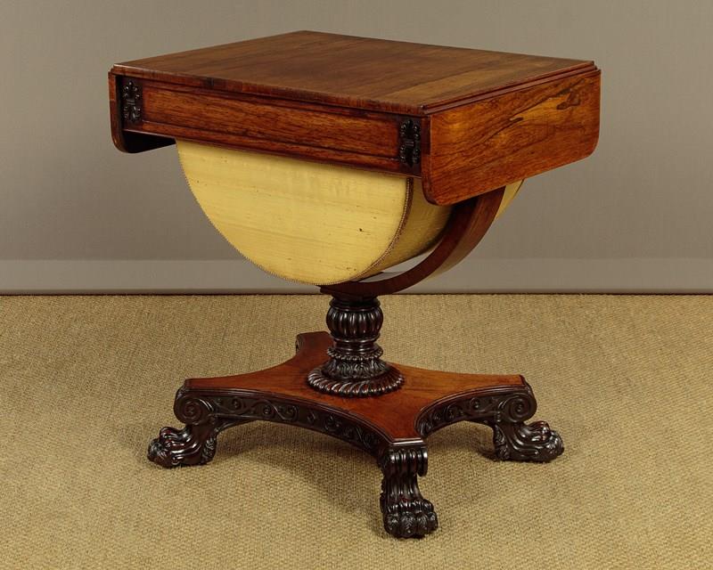 Mid 19th.c. rosewood Pembroke work table c.1840. Rosewood veneered top with two short folding leaves held on hinged loafers. Over a slim mahogany lined and lockable upper drawer and a large half-moon shaped basket drawer below, covered in yellow silk, originally intended to hold a lady's sewing or needlework. Note the little anthemion carvings either side of the upper drawer which repeated on the rear face of the table. Supported on a semi-circular yoke, also rosewood veneered, and a fine turned carved and segmented column with a gadrooned collar. Raised on a shaped plinth with quarter veneers and moulded edges over a carved frieze to each side and massive carved claw feet at the corners. Excellent colour and condition, cleaned and waxed in our workshops. Key supplied.