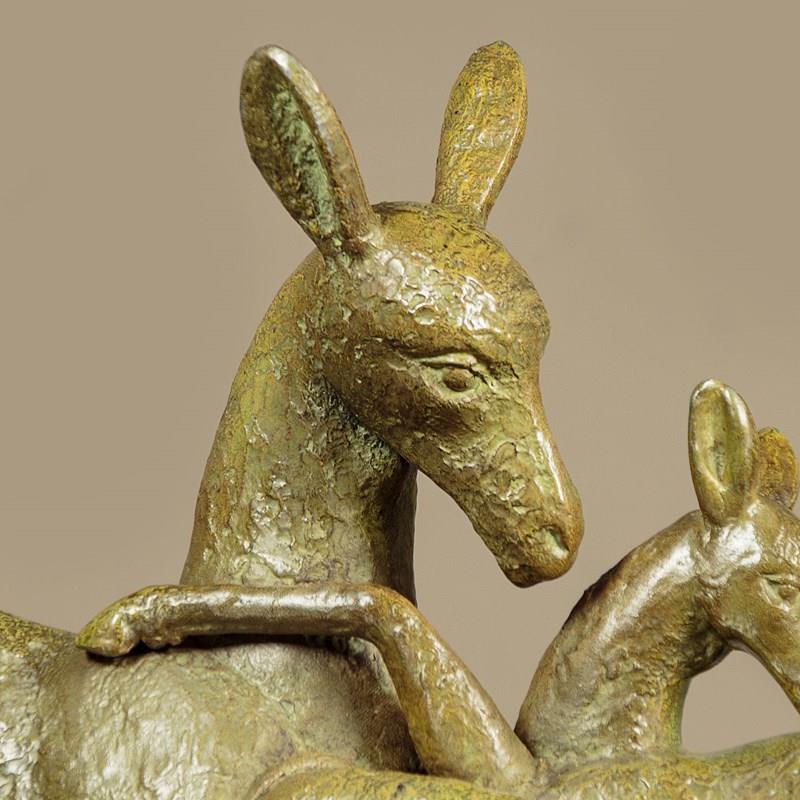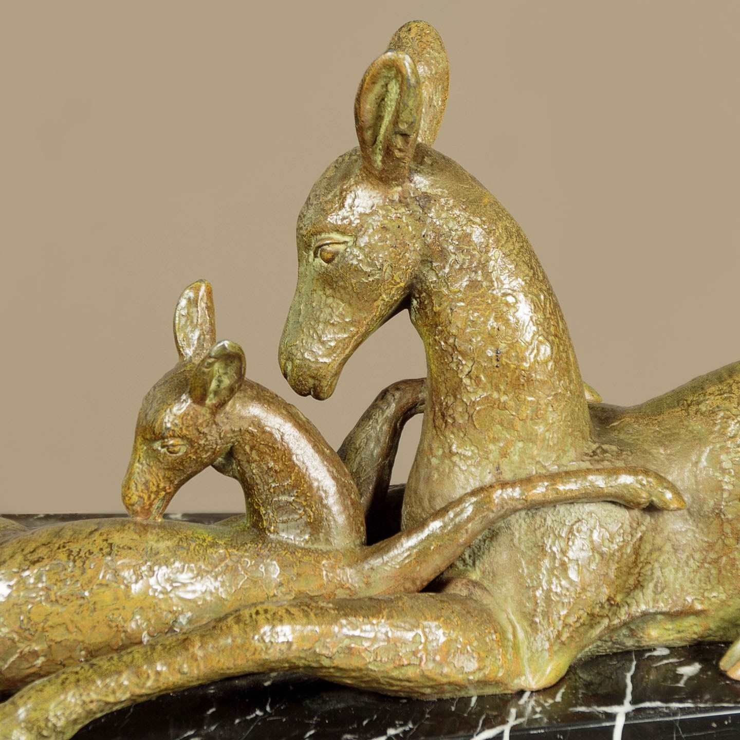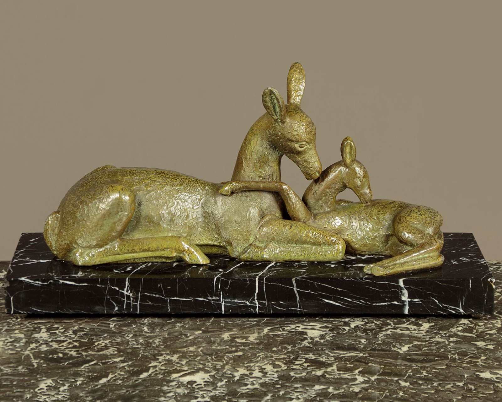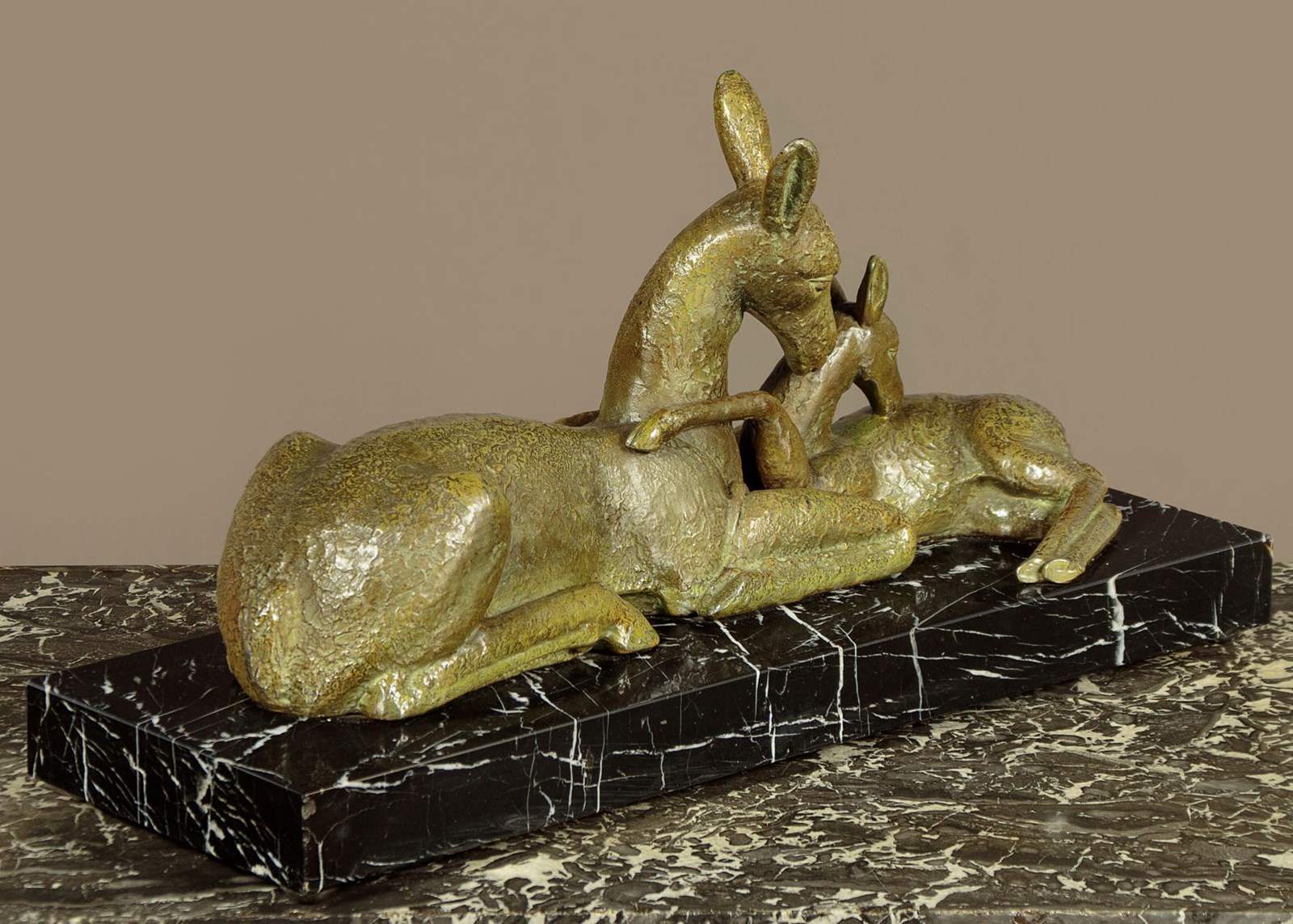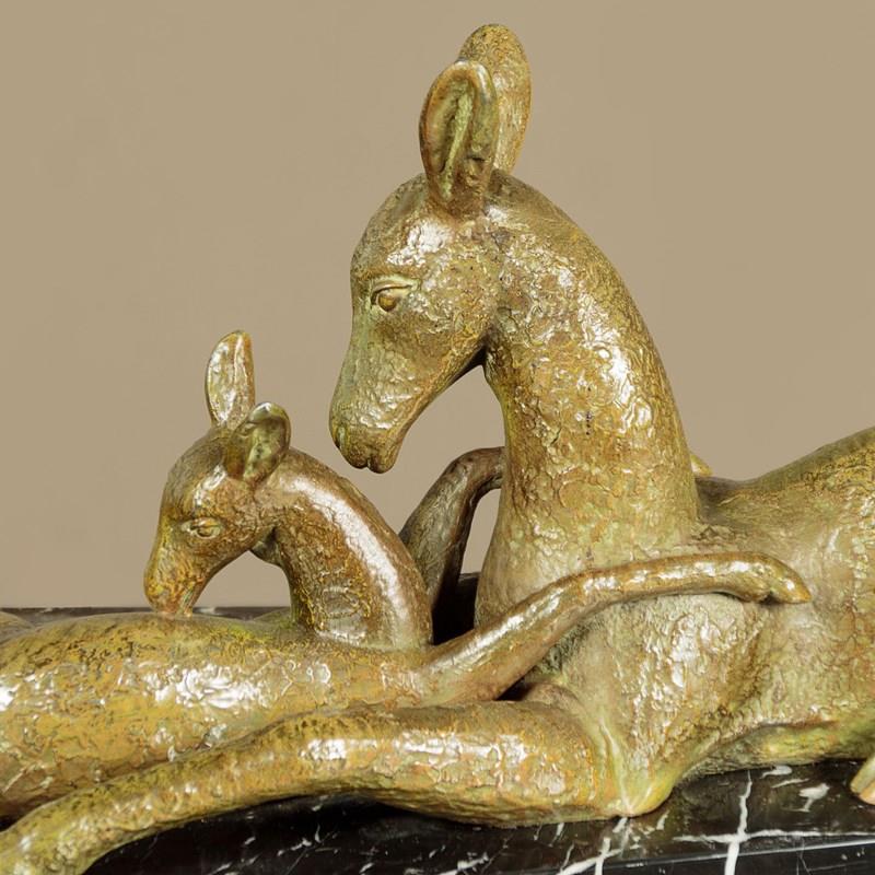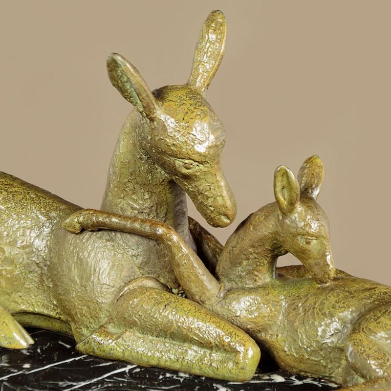 Mid 20th.c. table top sculpture of a doe and its fawn c.1950. Cast in spelter with textured surface an good green bronze coloured finish. Presented on a well figured black marble base with chromed feet below. Signed Riolo on the corner of the marble. A few very small chips from the edges of the marble, otherwise very good condition. Cleaned and waxed in our workshops.