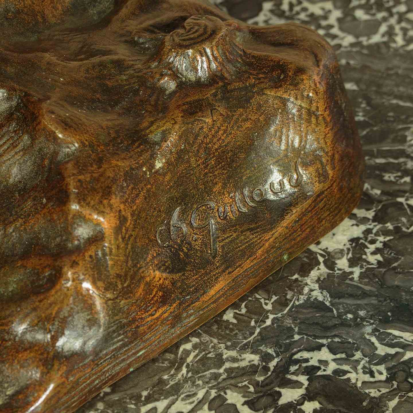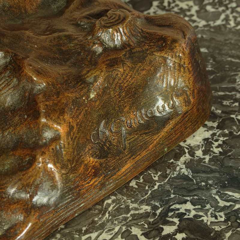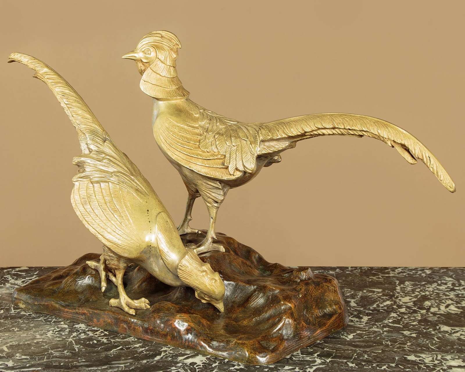 Table top sculpture of a pair of golden pheasants c.1930. Individual figures of two cock pheasants with their distinctive hoods at the back of the head and long tail feathers. Cast in spelter with a metallic golden finish. Stood on a naturalistic base also in spelter with good bronze painted finish. Signed Guilloud in the cast on the base. Very good condition.