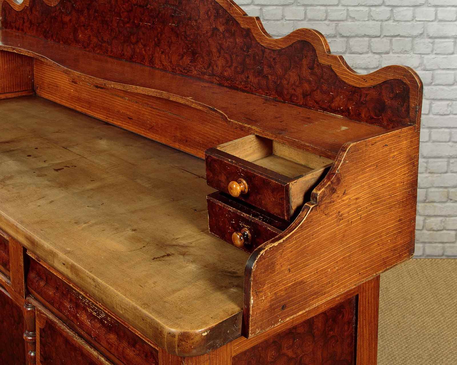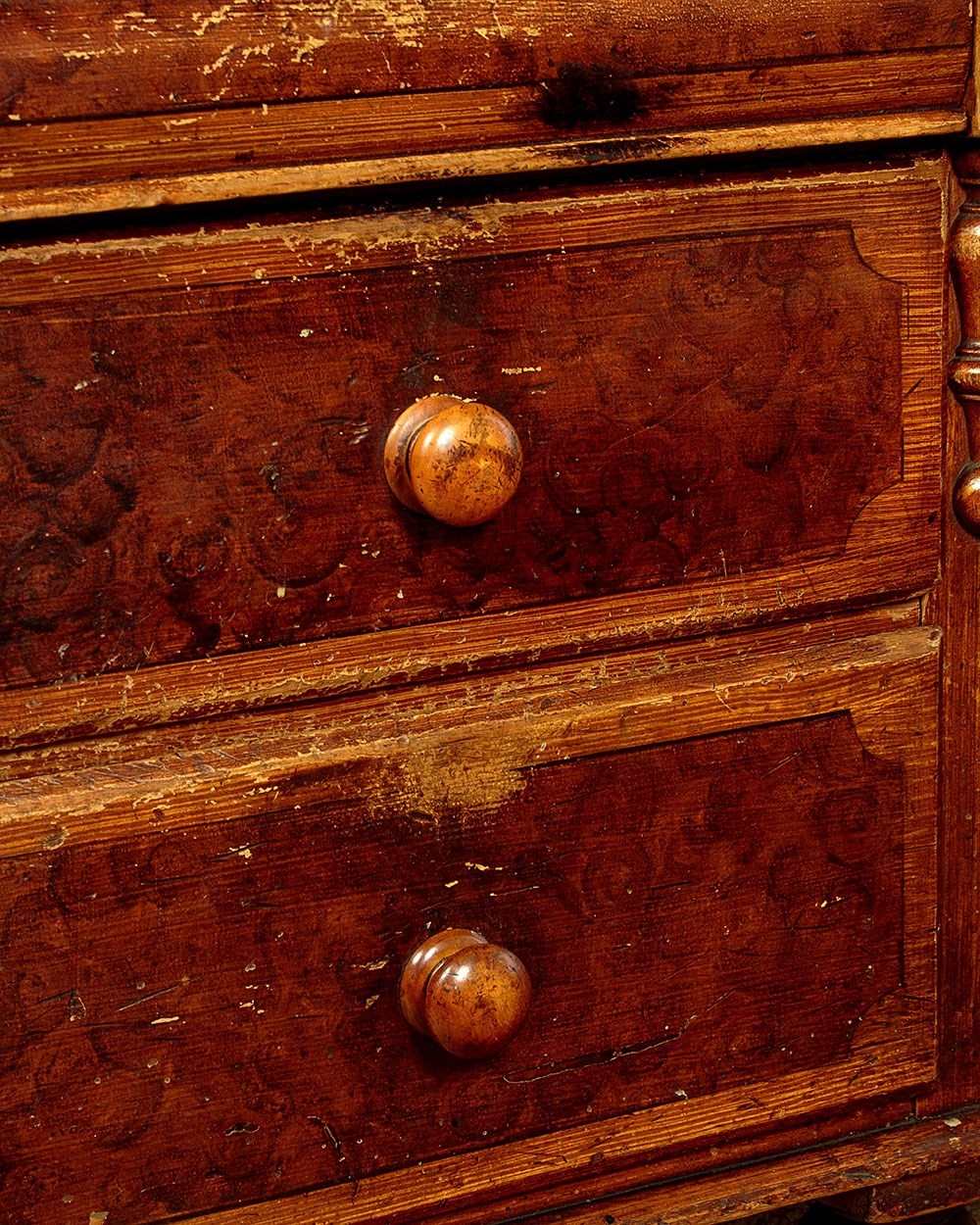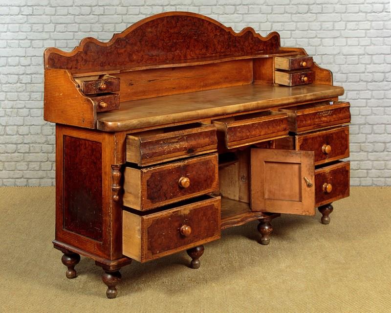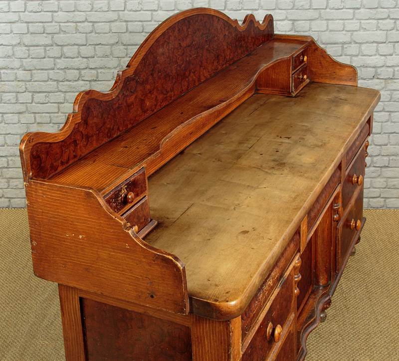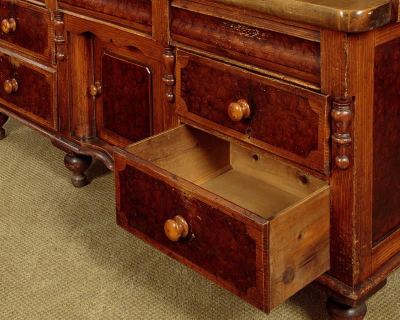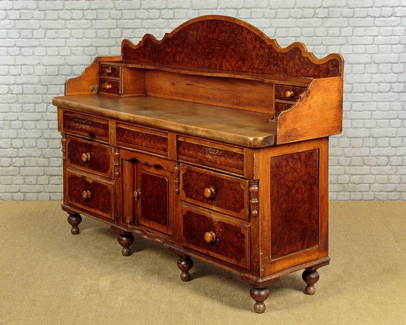 Late 19th.c. painted pine kitchen dresser or sideboard retaining the original 'scumbled' paintwork c.1890. Raised back with a shallow shelf with serpentine shaped edge and four small drawers. Over the superb 2" thick worktop (height 34") in solid sycamore. Base with seven large drawers of graduated height arranged around the slightly recessed central cupboard fitted with a single shelf inside. Beautiful scumbled paintwork designed to give the impression of more expensive burr walnut and oak veneers. It is quite rare to find these sideboards with their original paint as the vast majority have been stripped back to the bare pine. With half depth turned finial mouldings applied either side of the drawers and a cupid's bow shaped apron above the cupboard. Raised on the original tall turned feet front and rear. Some wear to the paintwork, otherwise excellent colour and condition, cleaned and waxed in our workshops.