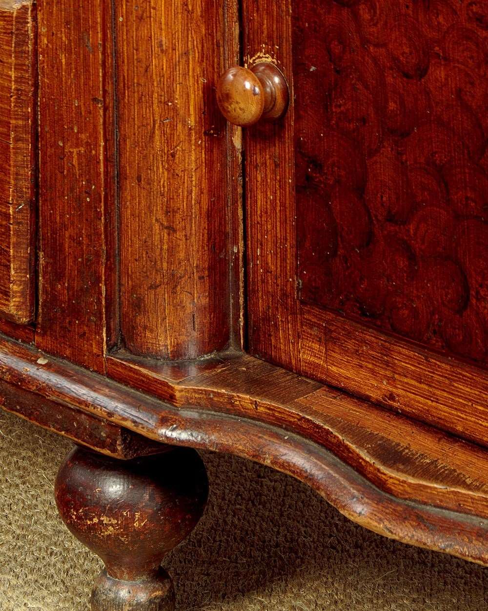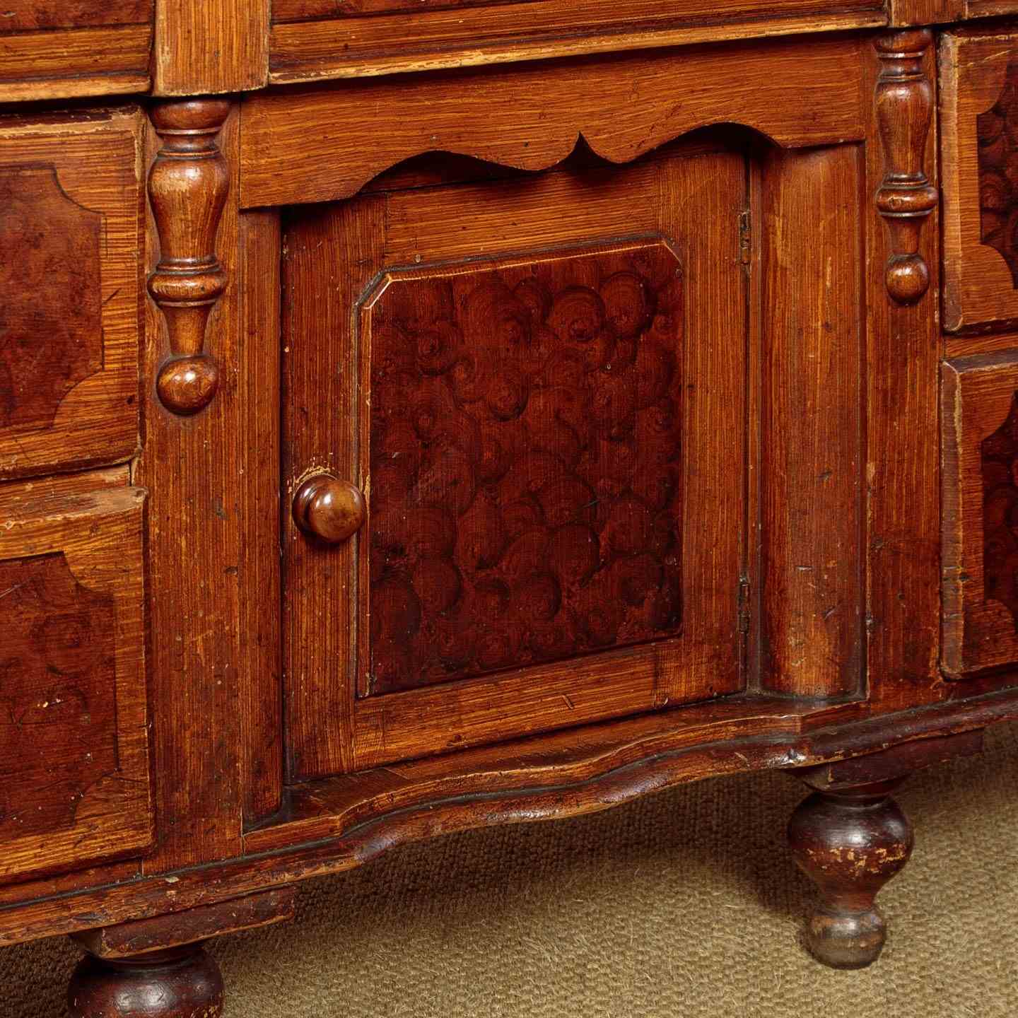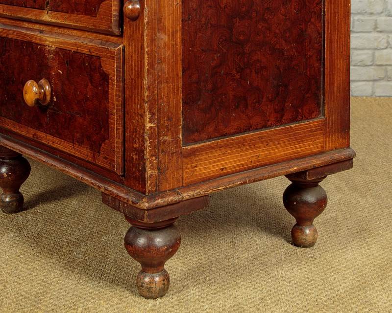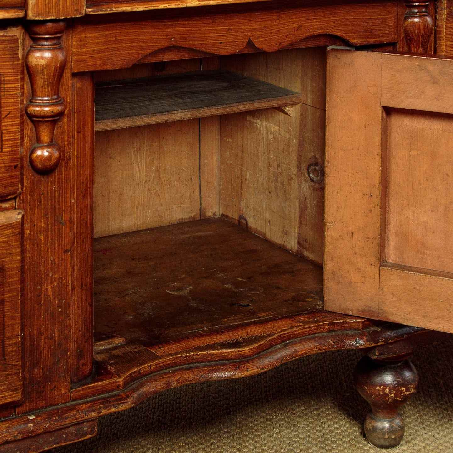 Late 19th.c. painted pine kitchen dresser or sideboard retaining the original 'scumbled' paintwork c.1890. Raised back with a shallow shelf with serpentine shaped edge and four small drawers. Over the superb 2" thick worktop (height 34") in solid sycamore. Base with seven large drawers of graduated height arranged around the slightly recessed central cupboard fitted with a single shelf inside. Beautiful scumbled paintwork designed to give the impression of more expensive burr walnut and oak veneers. It is quite rare to find these sideboards with their original paint as the vast majority have been stripped back to the bare pine. With half depth turned finial mouldings applied either side of the drawers and a cupid's bow shaped apron above the cupboard. Raised on the original tall turned feet front and rear. Some wear to the paintwork, otherwise excellent colour and condition, cleaned and waxed in our workshops.