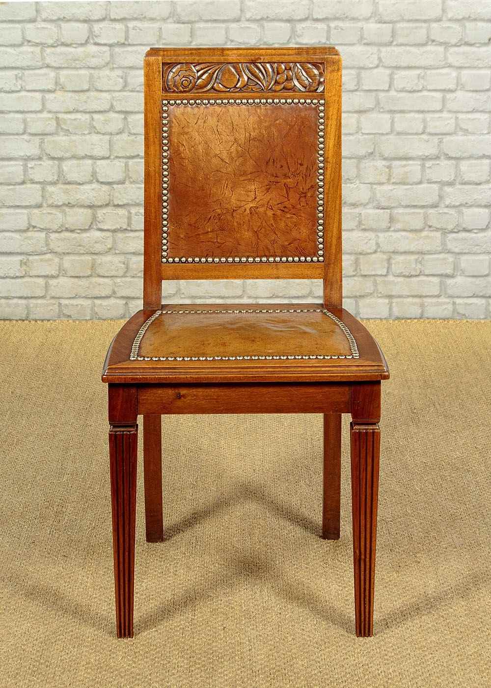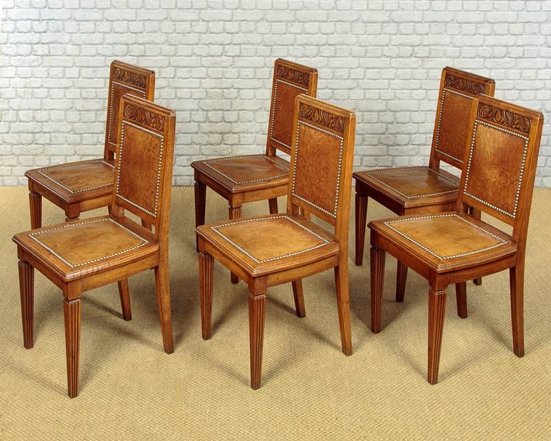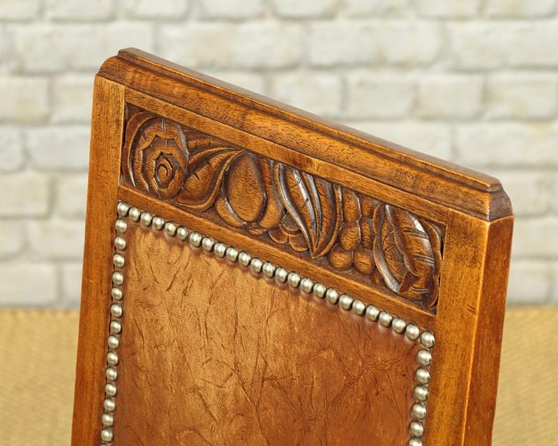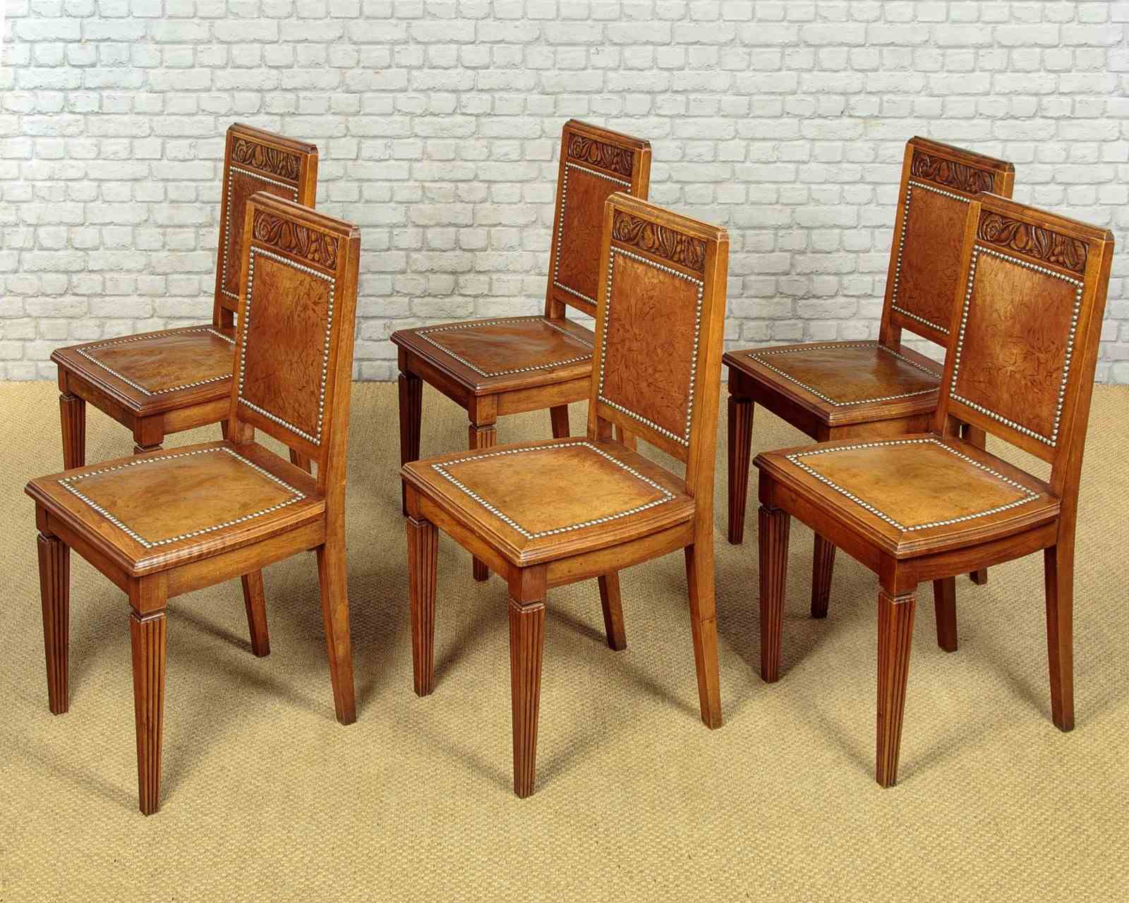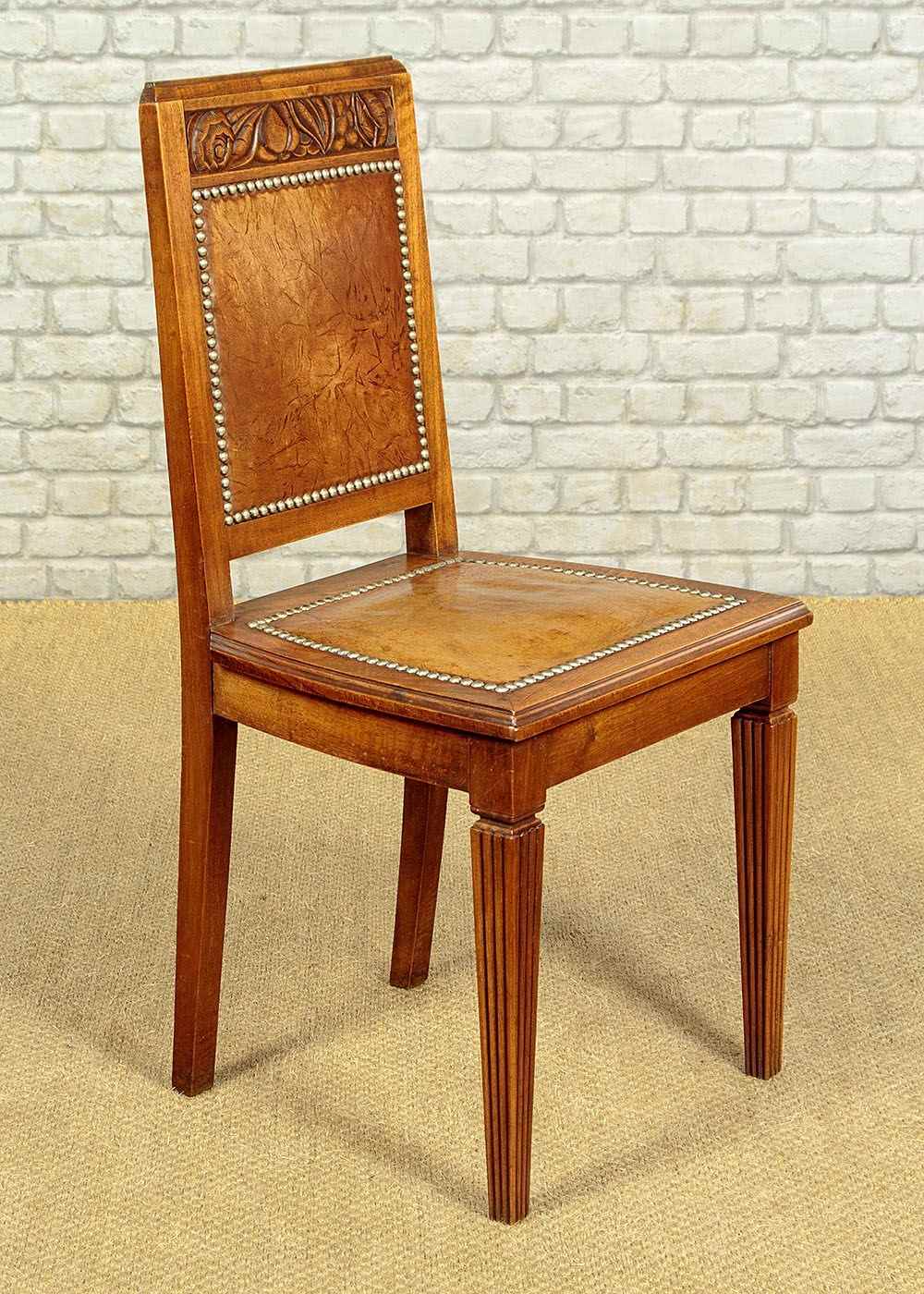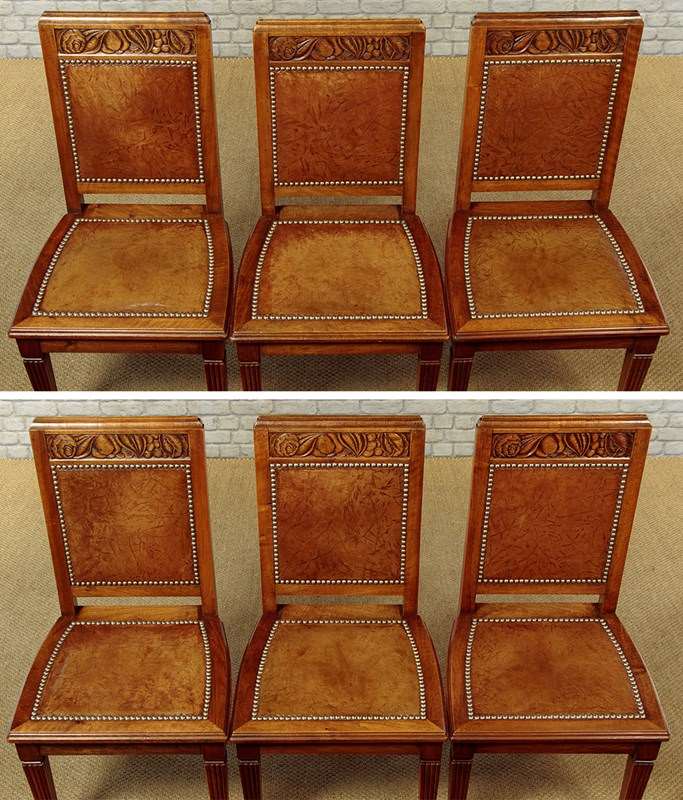 Smart set of six small Art Deco walnut and leather dining chairs c.1930. Low backrests carved with a design of stylised flowers and fruit and with a moulded top edge, above a leather panel with brass studs. Slightly flared seats (height 17") with a matching leather panel and moulded edges to the frame. Raised on square tapering front legs with unusual reeded detail. The rear legs swept slightly backwards for stability. Very good colour and condition, cleaned and waxed in our workshops.
