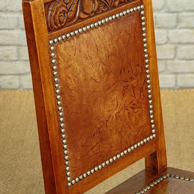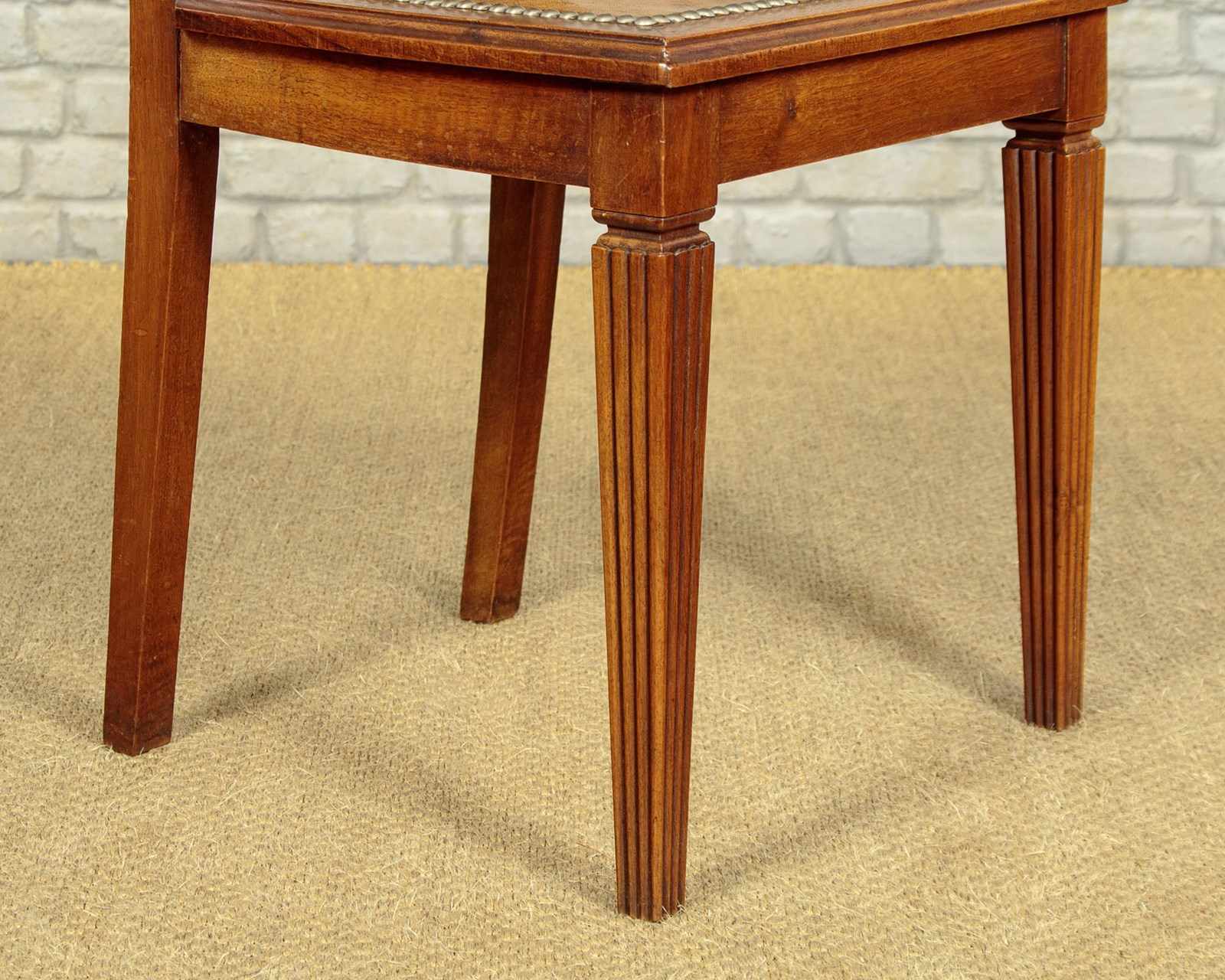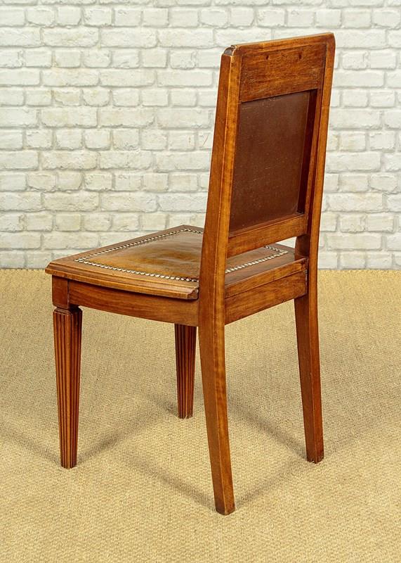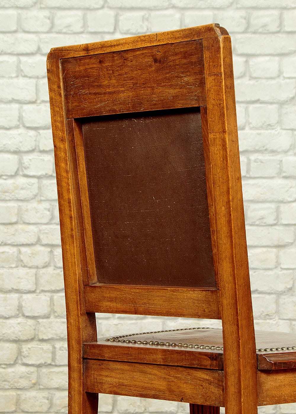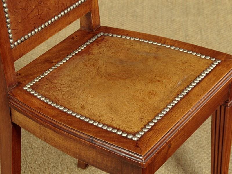 Smart set of six small Art Deco walnut and leather dining chairs c.1930. Low backrests carved with a design of stylised flowers and fruit and with a moulded top edge, above a leather panel with brass studs. Slightly flared seats (height 17") with a matching leather panel and moulded edges to the frame. Raised on square tapering front legs with unusual reeded detail. The rear legs swept slightly backwards for stability. Very good colour and condition, cleaned and waxed in our workshops.
