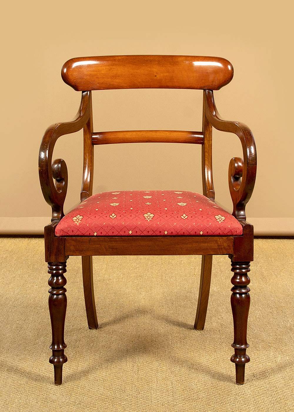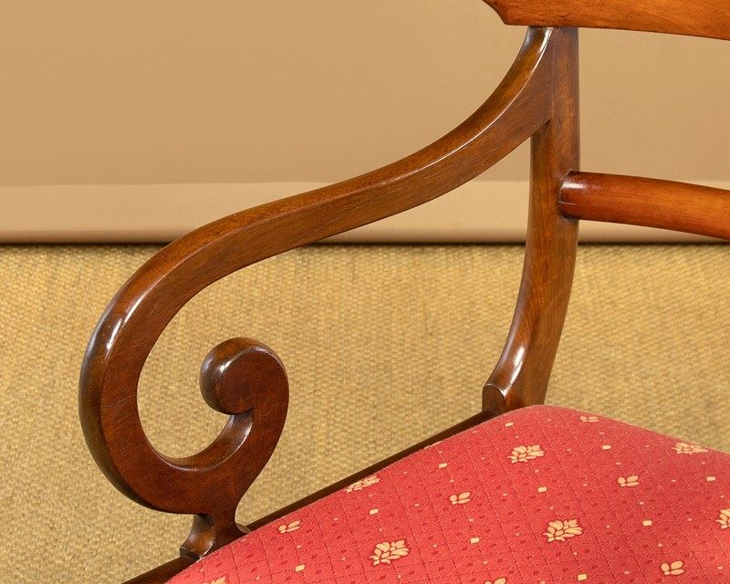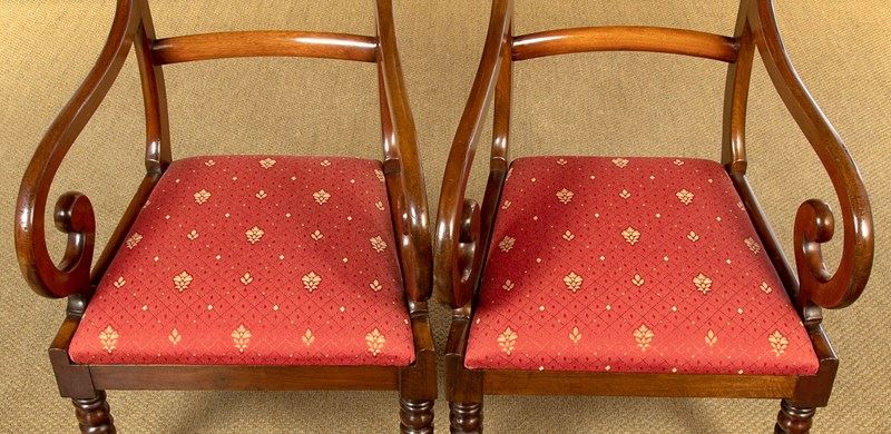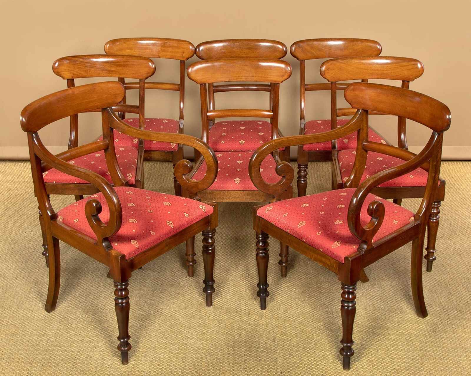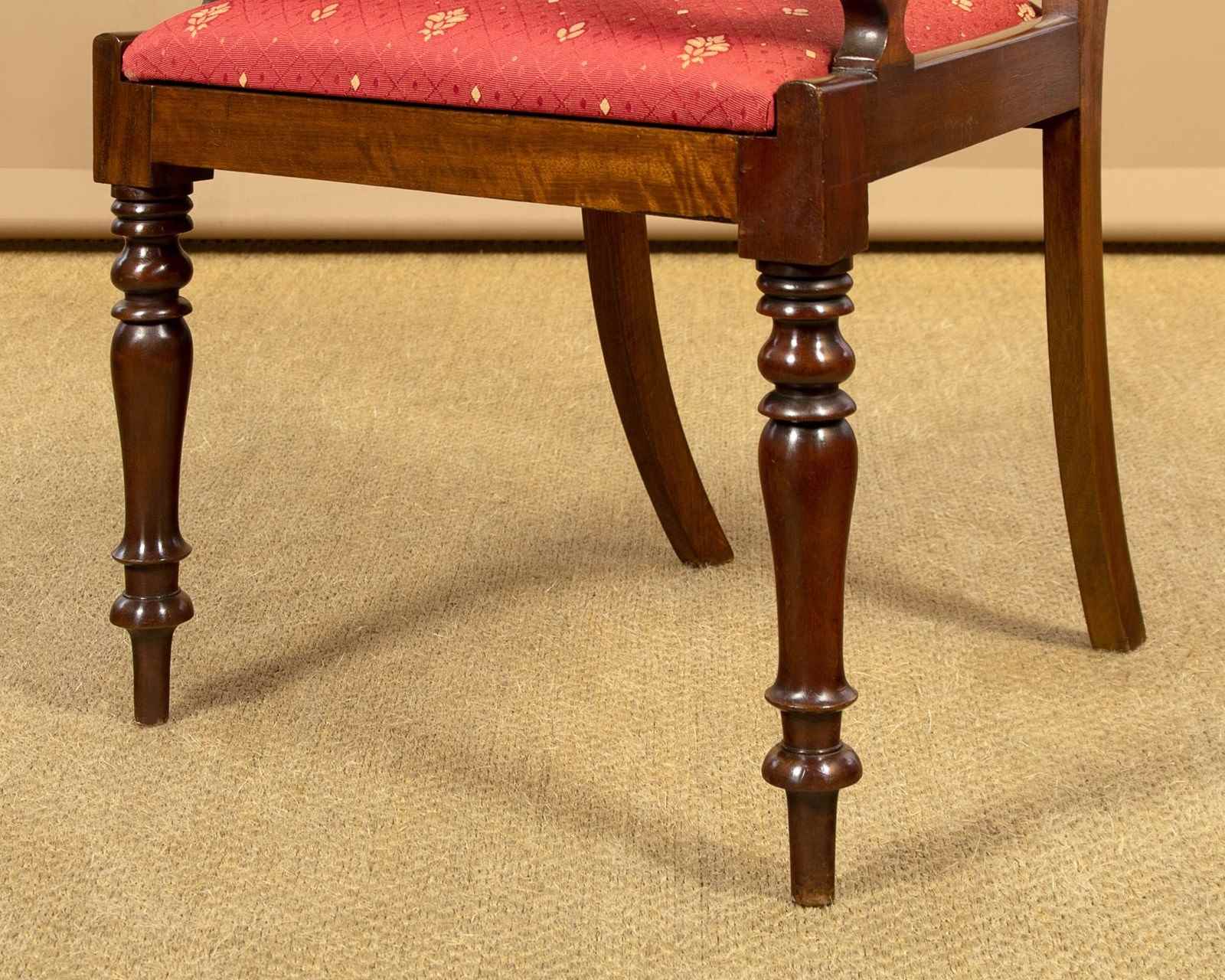 Good quality set of eight mid 19th.c. mahogany dining chairs c.1860. Six chairs plus two matching carver armchairs. Slightly curved solid mahogany backrests with rounded edges over a simple moulded back stretcher. Graceful curving arms to the carvers with lovely scrolling terminals. Loose seat pads (height 17½") upholstered in a red and gold flatweave fabric. Raised on crisply turned front legs, the back legs swept outwards for stability. Very good colour and condition with clean covers. Frames have been cleaned and waxed in our workshops.