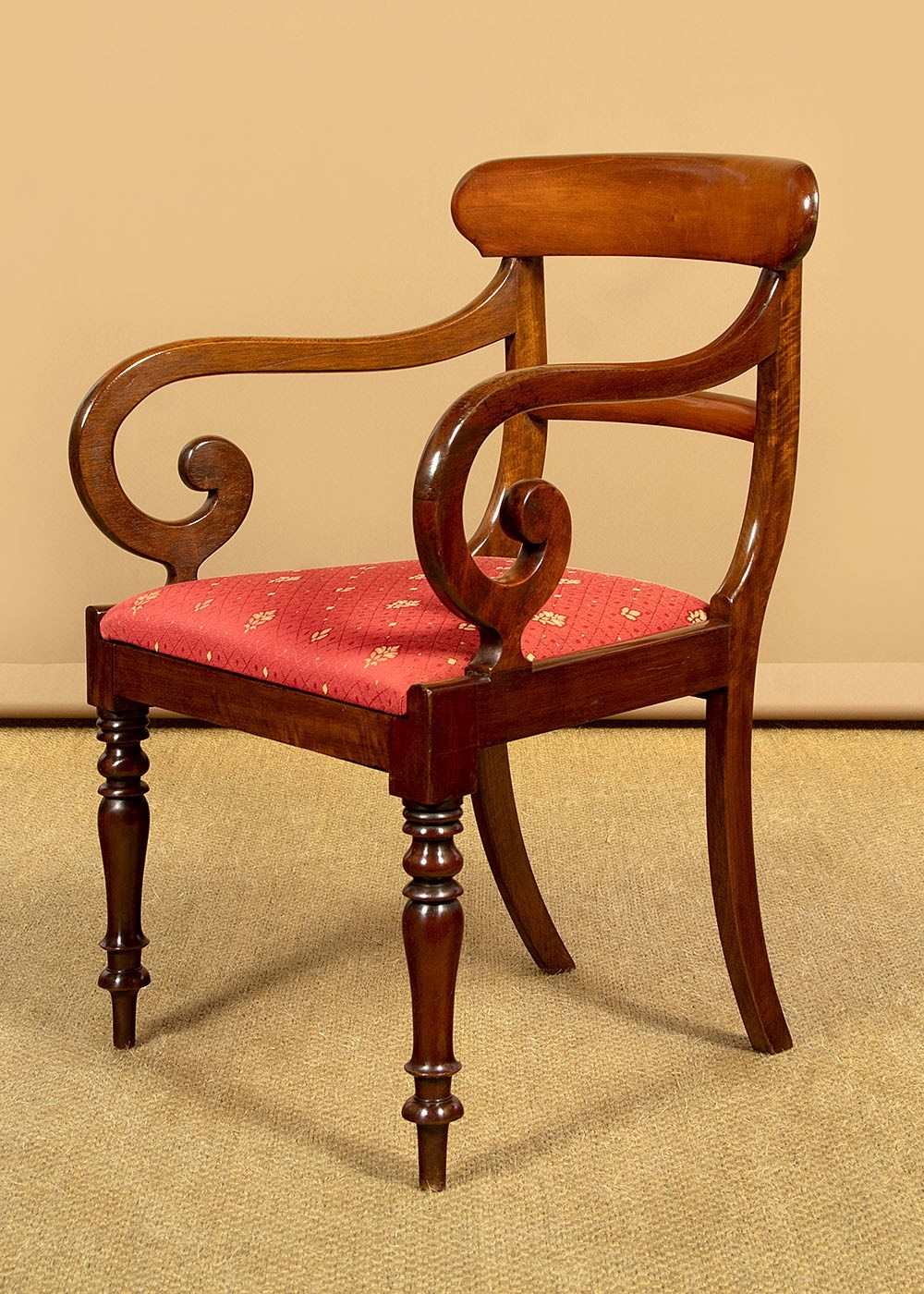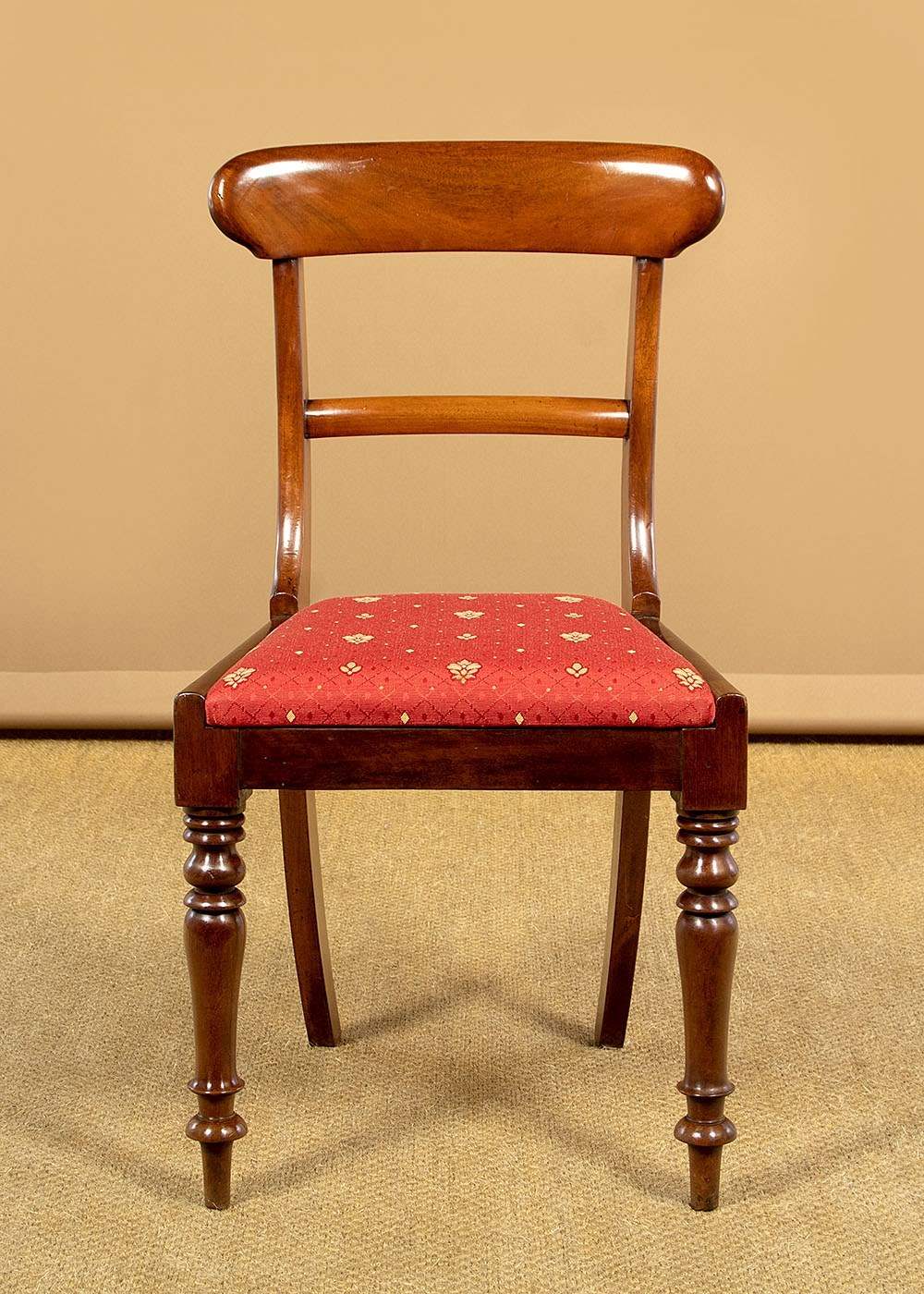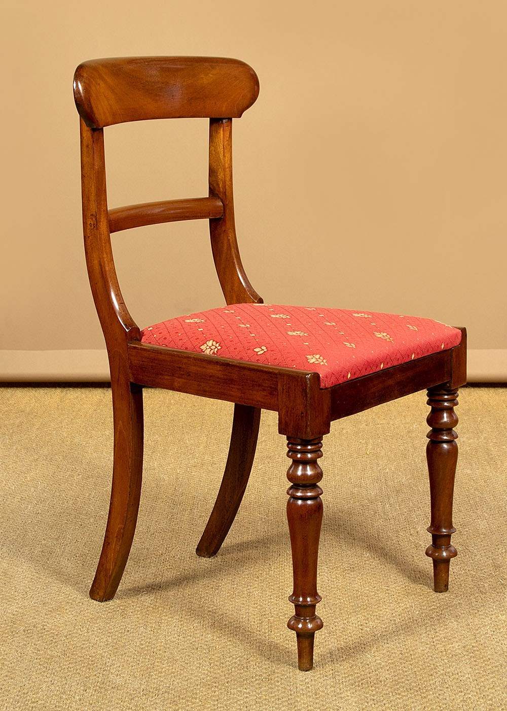 Good quality set of eight mid 19th.c. mahogany dining chairs c.1860. Six chairs plus two matching carver armchairs. Slightly curved solid mahogany backrests with rounded edges over a simple moulded back stretcher. Graceful curving arms to the carvers with lovely scrolling terminals. Loose seat pads (height 17½") upholstered in a red and gold flatweave fabric. Raised on crisply turned front legs, the back legs swept outwards for stability. Very good colour and condition with clean covers. Frames have been cleaned and waxed in our workshops.